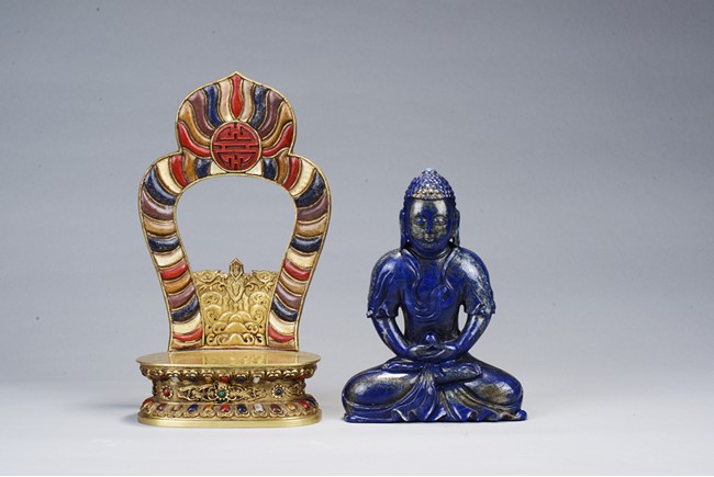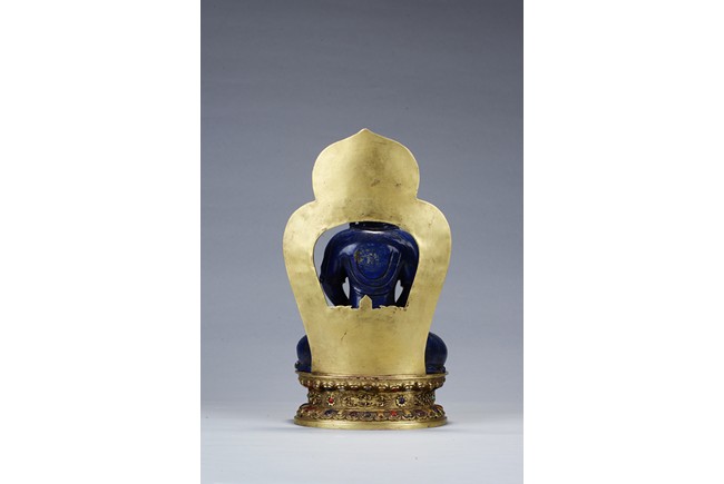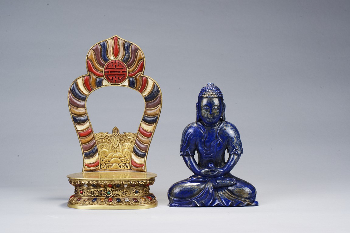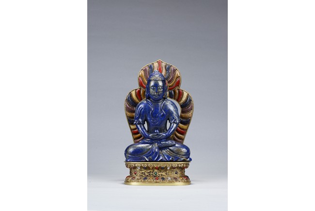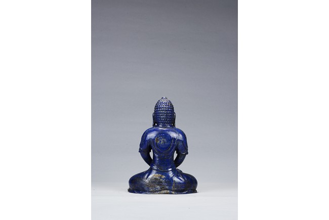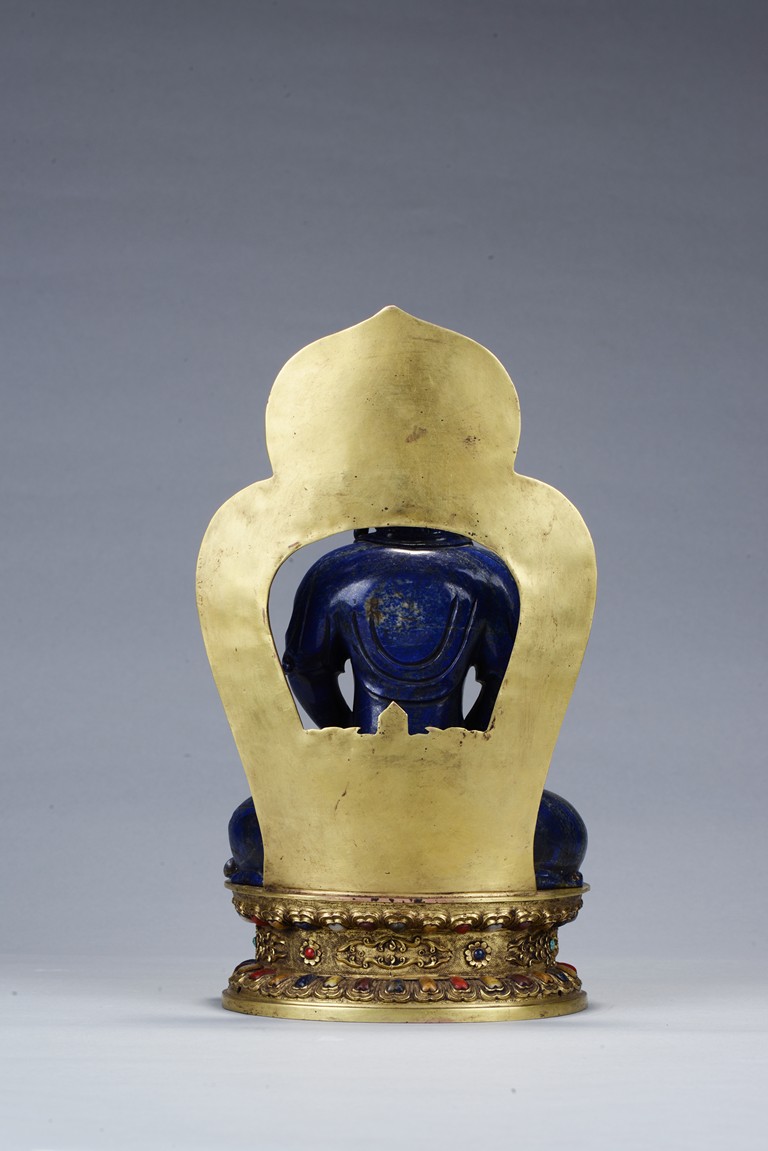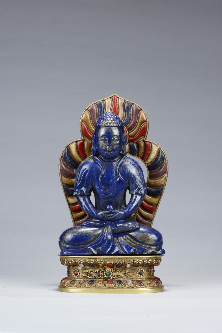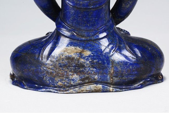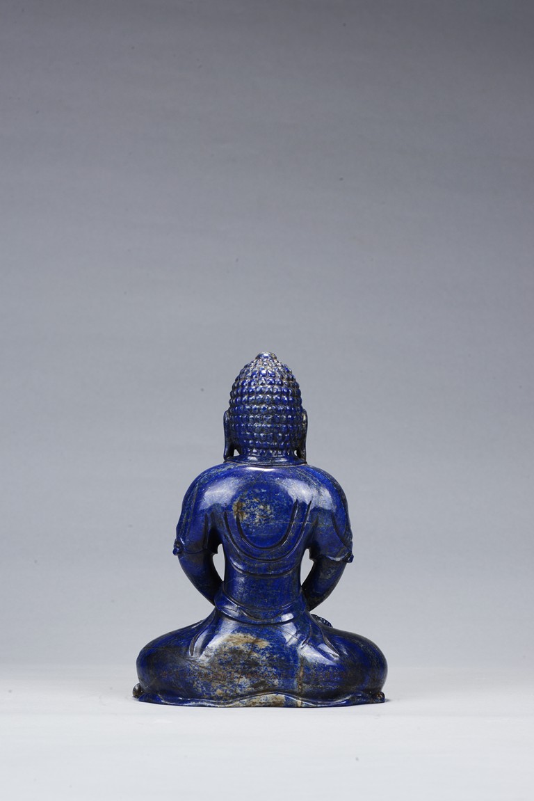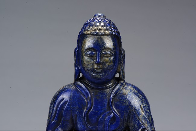 整料青金石為材,立體圓雕藥師佛坐像。螺鬃發,坦胸,法相慈悲,雙手托藥缽於腹前。佛安坐於寬大蓮座上。青金石材燦若藍寶石,雕工圓潤,品相完好,實屬難得。