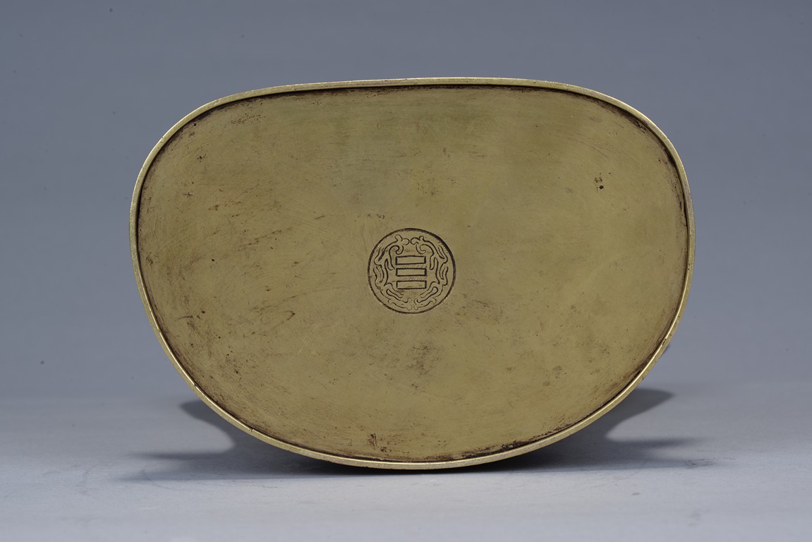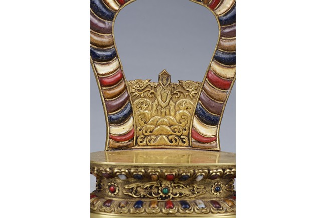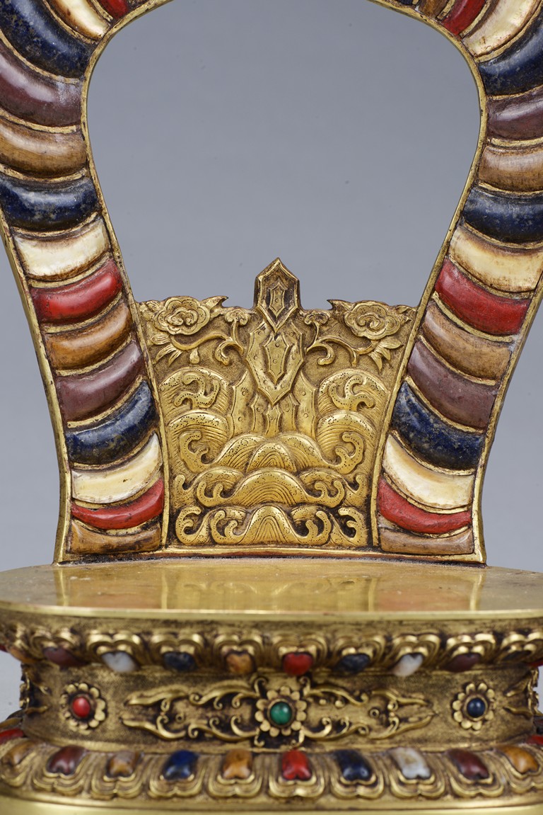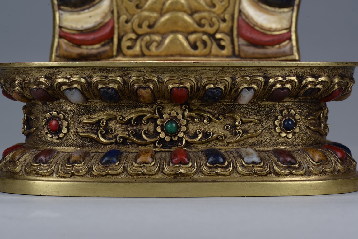 Carved seated in dhyanasana with hands in dhyana mudra supporting a small alms bowl, the contemplative face with downcast eyes and gentle smile, wearing a loose-fitting robe falling in elegant folds, the separate gilt bronze lotus pedestal base and back flaming mandorla inlaid with various colorful semi-precious gems including jade, agate, lapis lazuli, and turquoise. Qing Dynasty period.