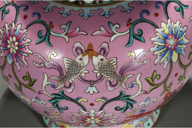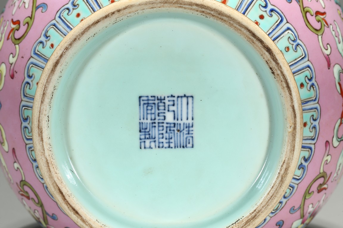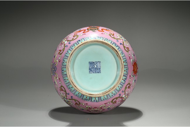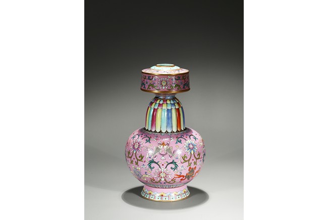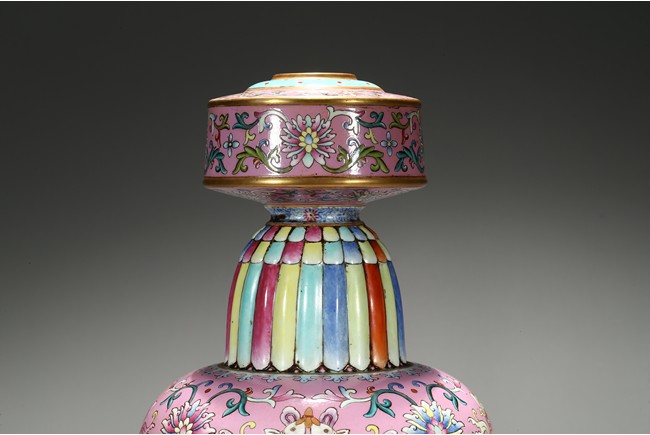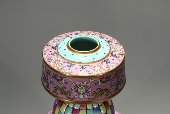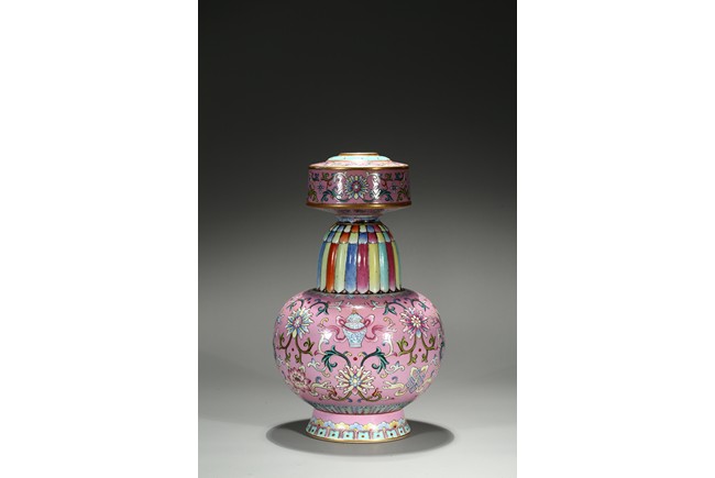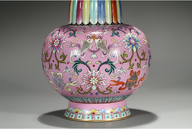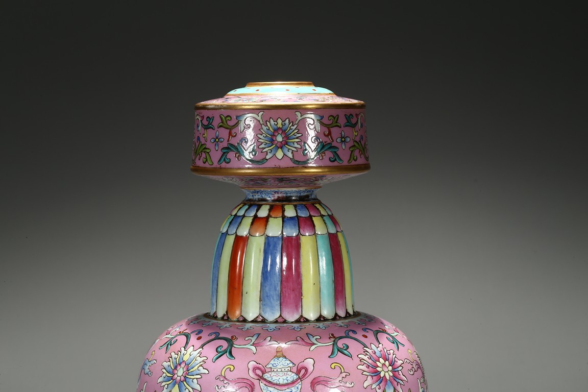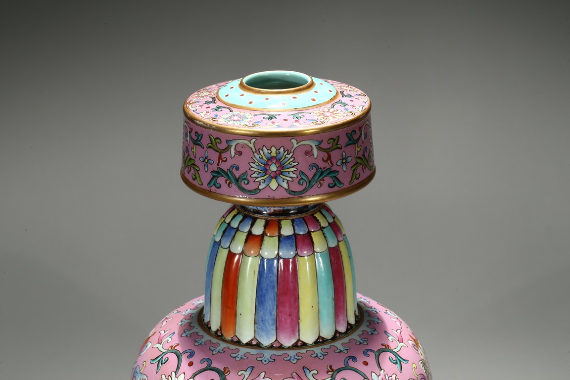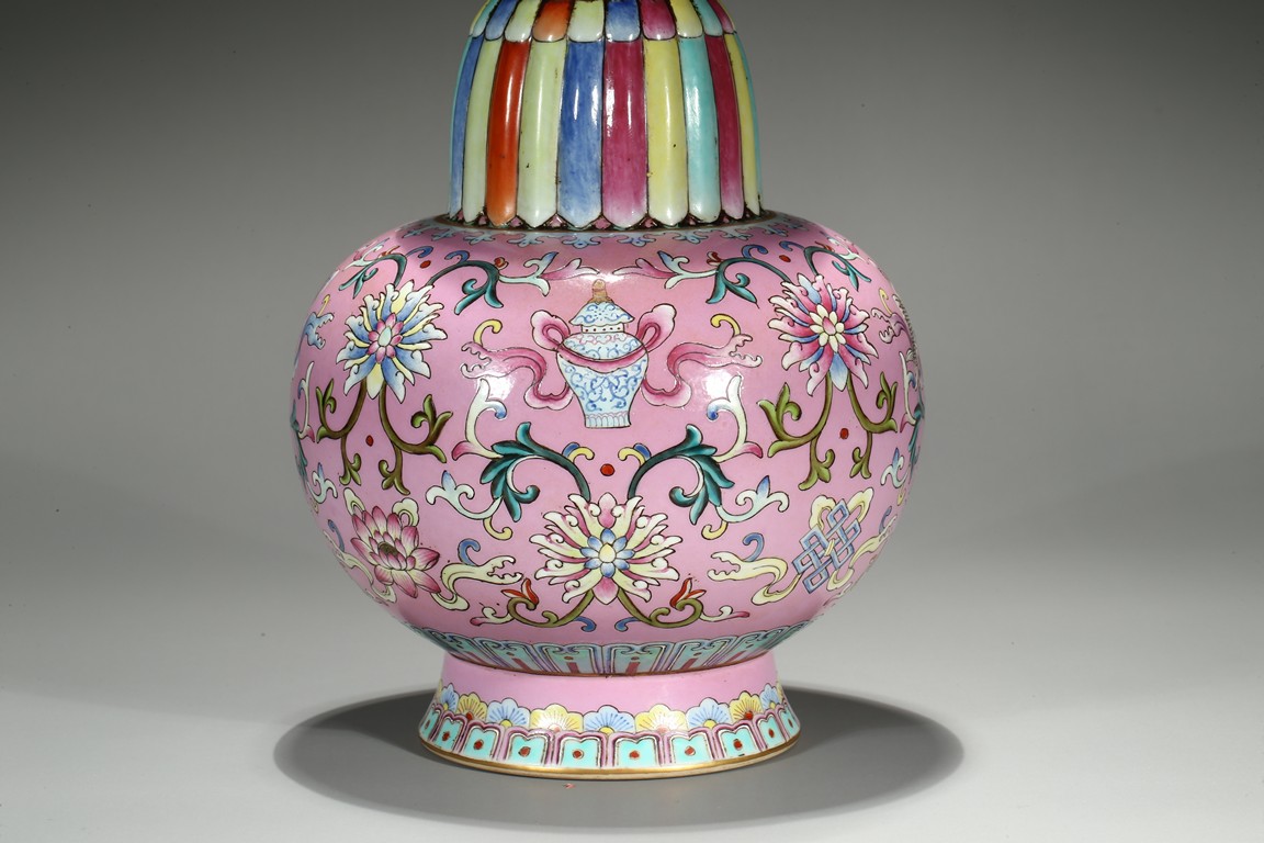 此瓶口呈折腹水盂狀,長頸作菊瓣裝飾,高圈足外撇。口部和瓶身主體部位以粉釉為地繪粉彩花卉紋,腹部於花卉紋中間隔八寶吉祥圖案,紋飾繁密而不亂,序理有致,製作講究,色彩艷麗。底部松石綠釉施“大清乾隆年制”青花款。賁巴壺又稱“藏草瓶”,是皇家為宮內廟宇及西藏寺廟定燒的法器,是漢藏宮廷文化融合的歷史見證。