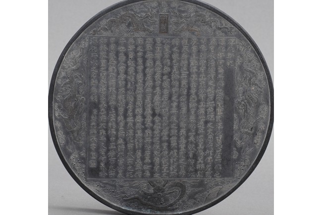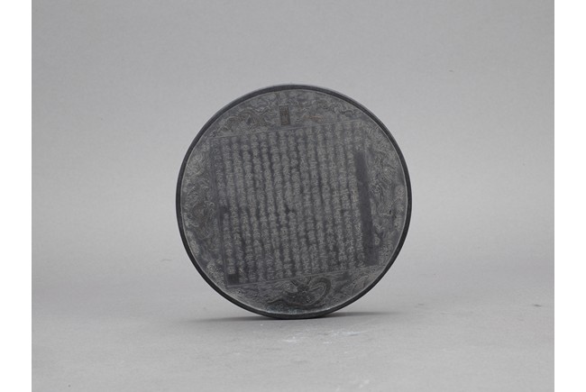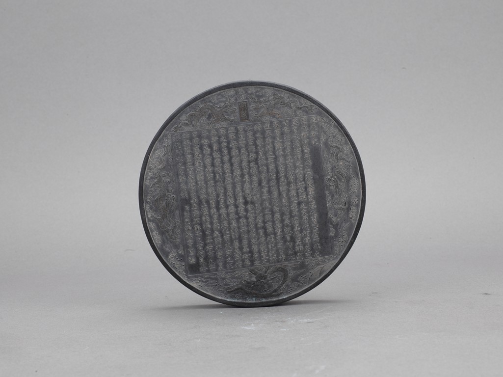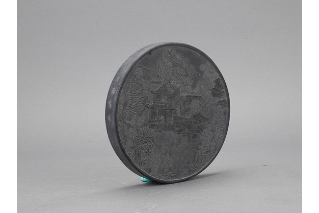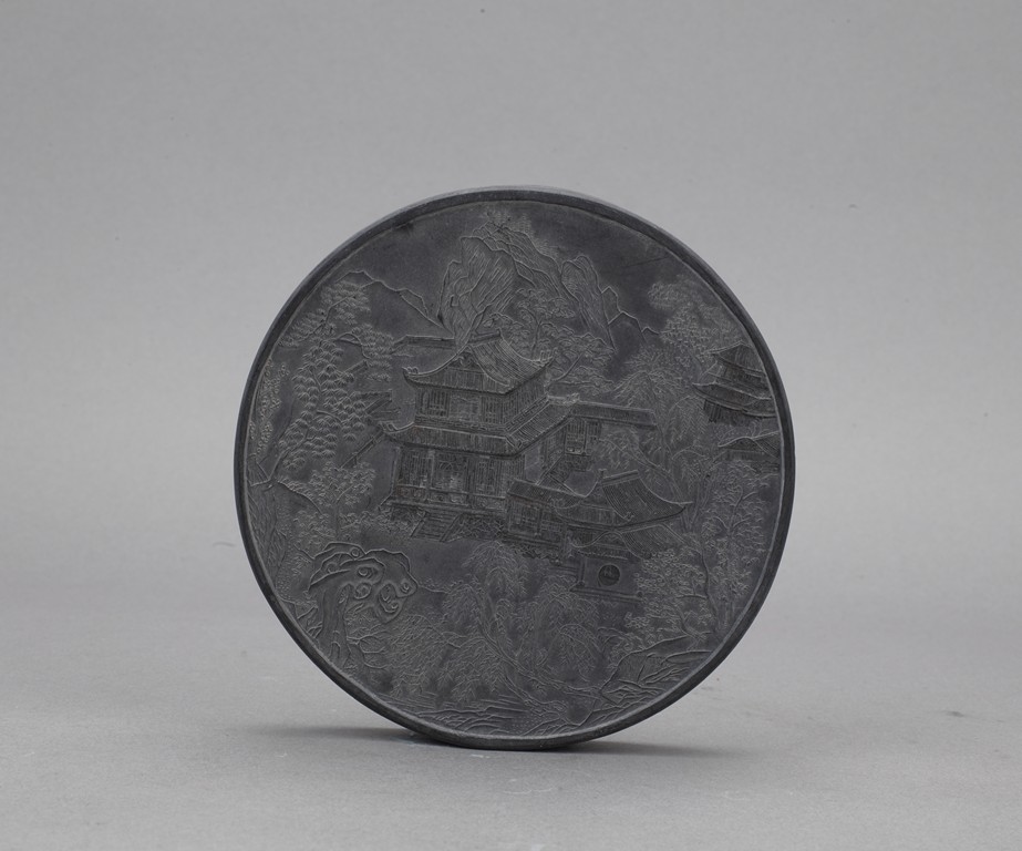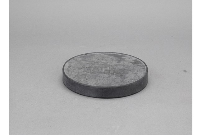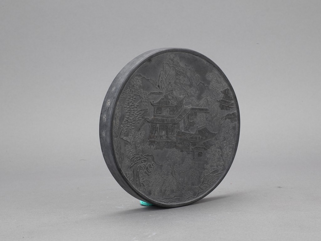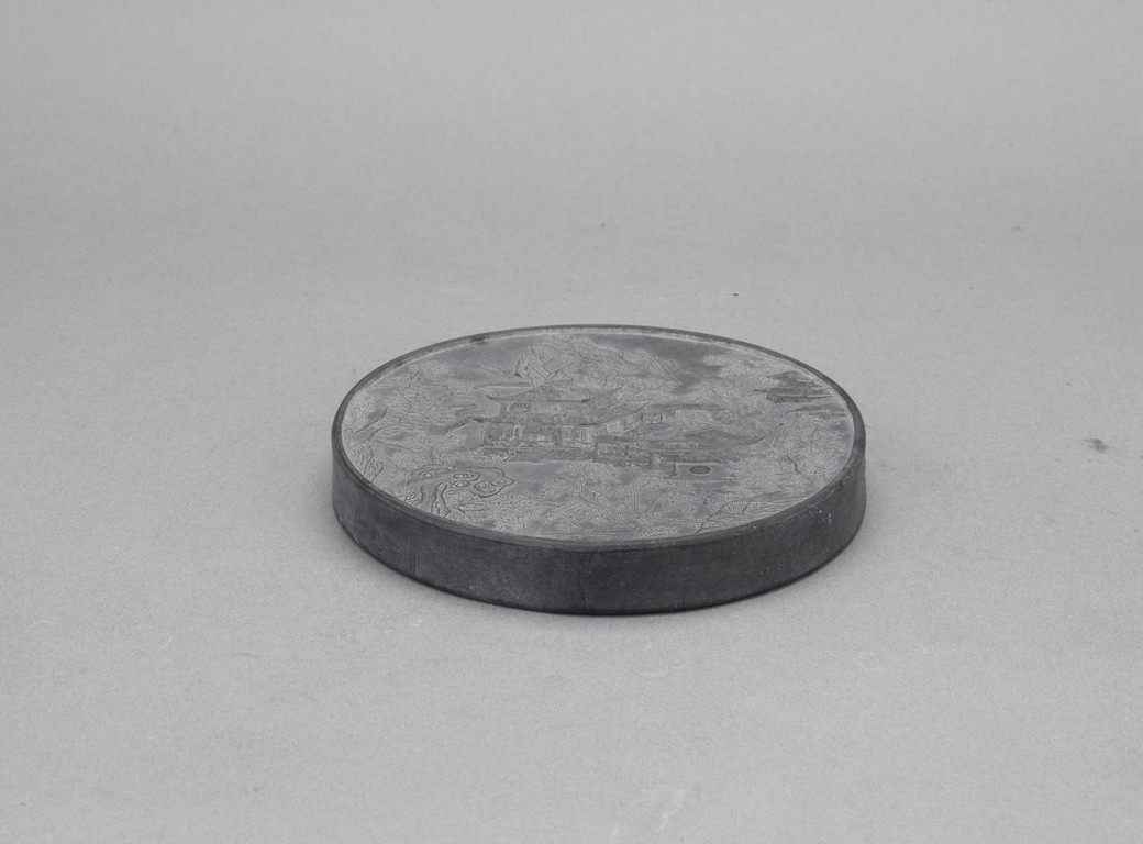 The circular ink cake is carved to one side landscape scene, the other side with an inscription dedicated to the emperor and signed Peng Yuanrui, surrounded by dragon and cloud decorations. Qing Dynasty period.