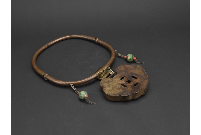 The ruyi head shaped lock etched in relief to depict figures in a garden scene. Qing Dynasty period.