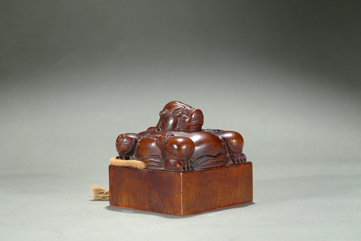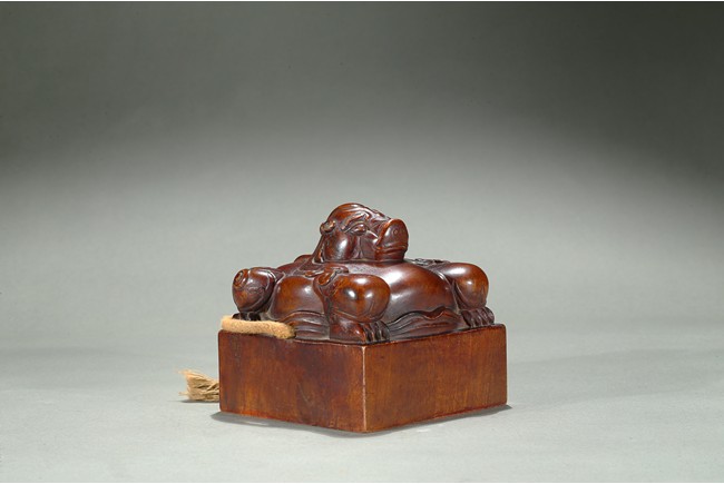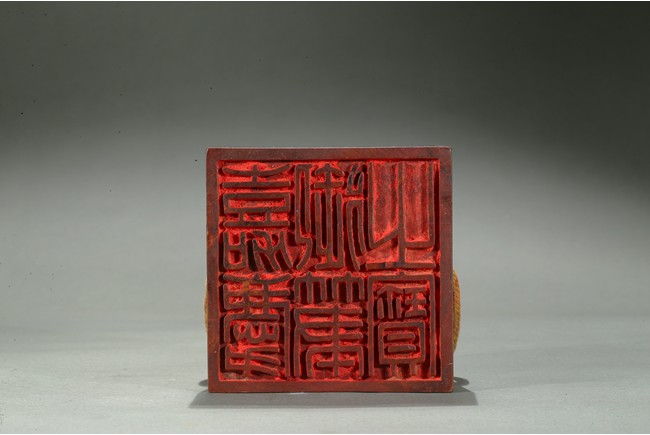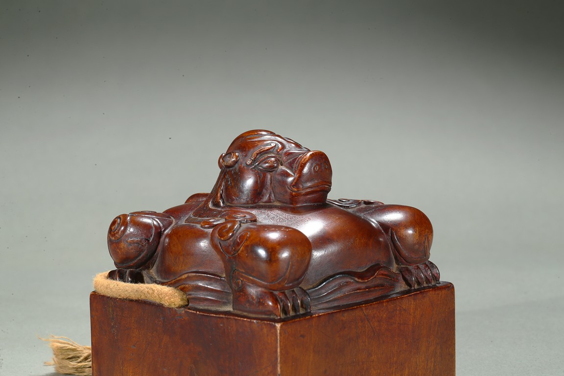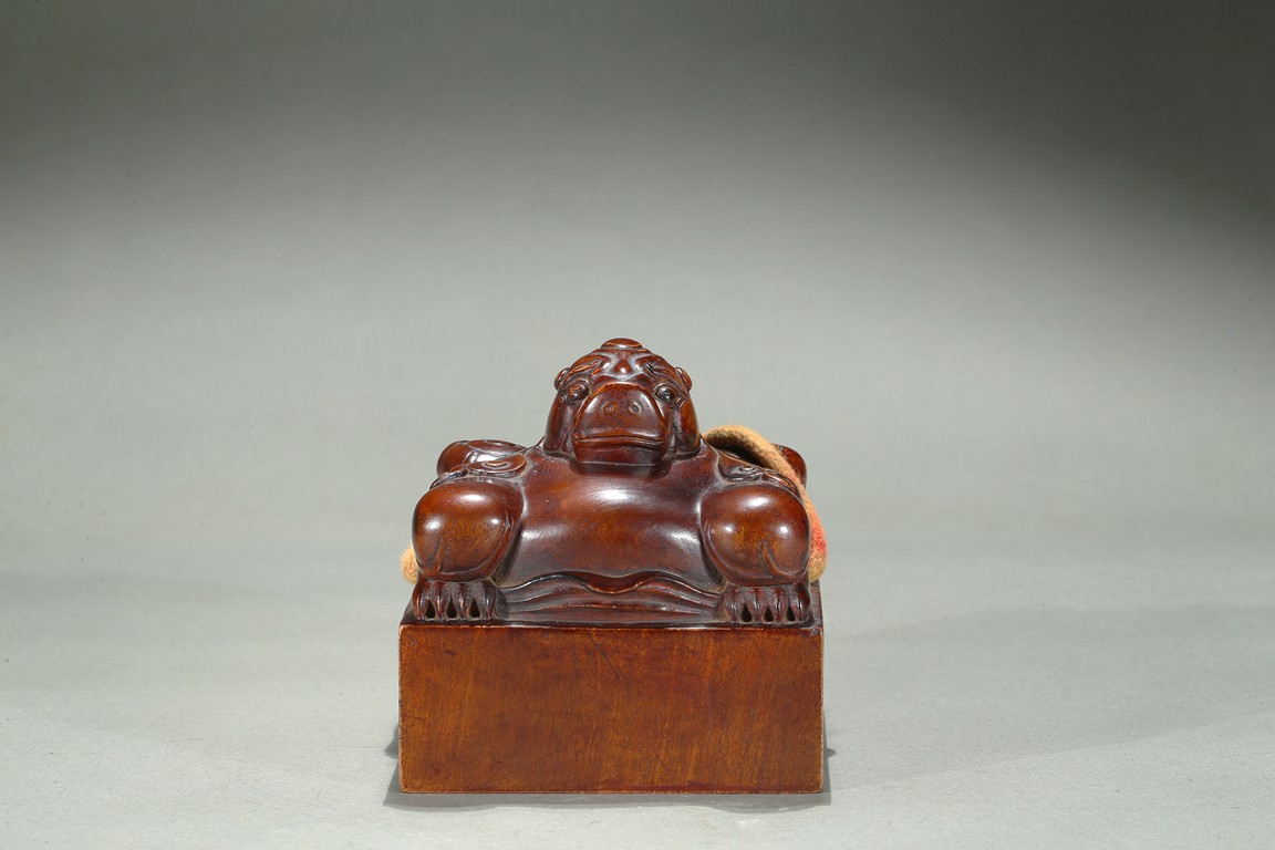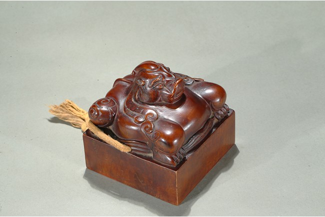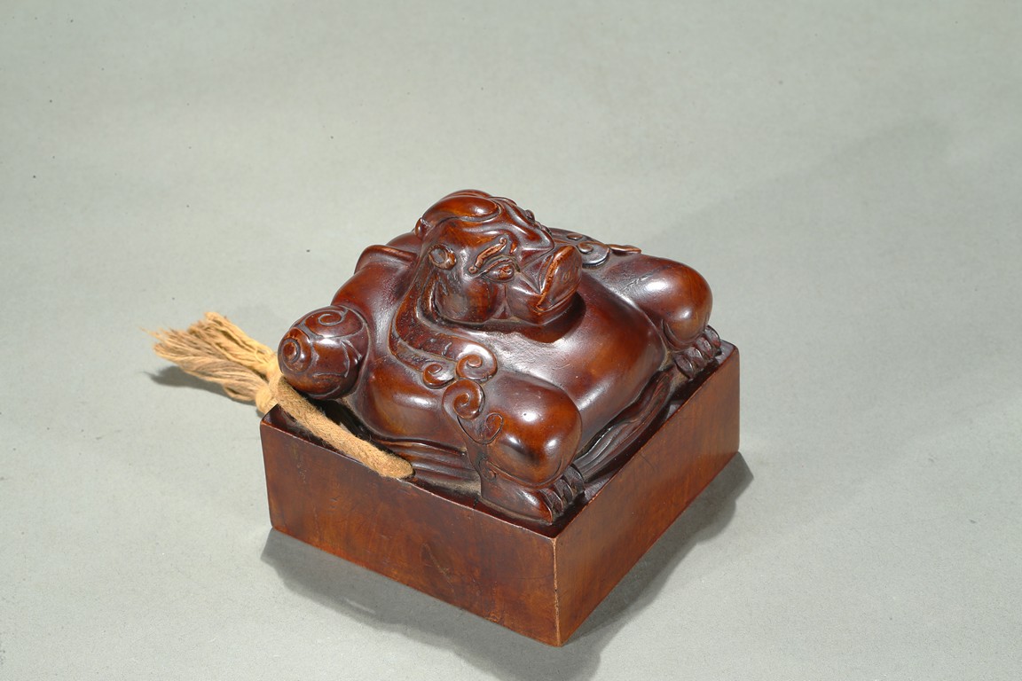 檀香,佛家謂之“旃檀”,素有“香料之王”之稱。香味溫潤、醇和,可謂極品。是一種既珍惜又昂貴的木材。此方嘉慶寶璽體量巨大,引面呈方形,印面刻“嘉慶禦筆之寶”六字陽文,刻工精湛,佈局嚴整,字體略大,大氣惶惶。神獸挺胸,鬢髮飛揚,軀幹遒勁,蓄勢待發,動感十足,威猛張揚。以木為材雕制璽印頗為少見,而檀香木作為上等香料,至光緒年間已十分稀缺,故而更是名貴至極。
