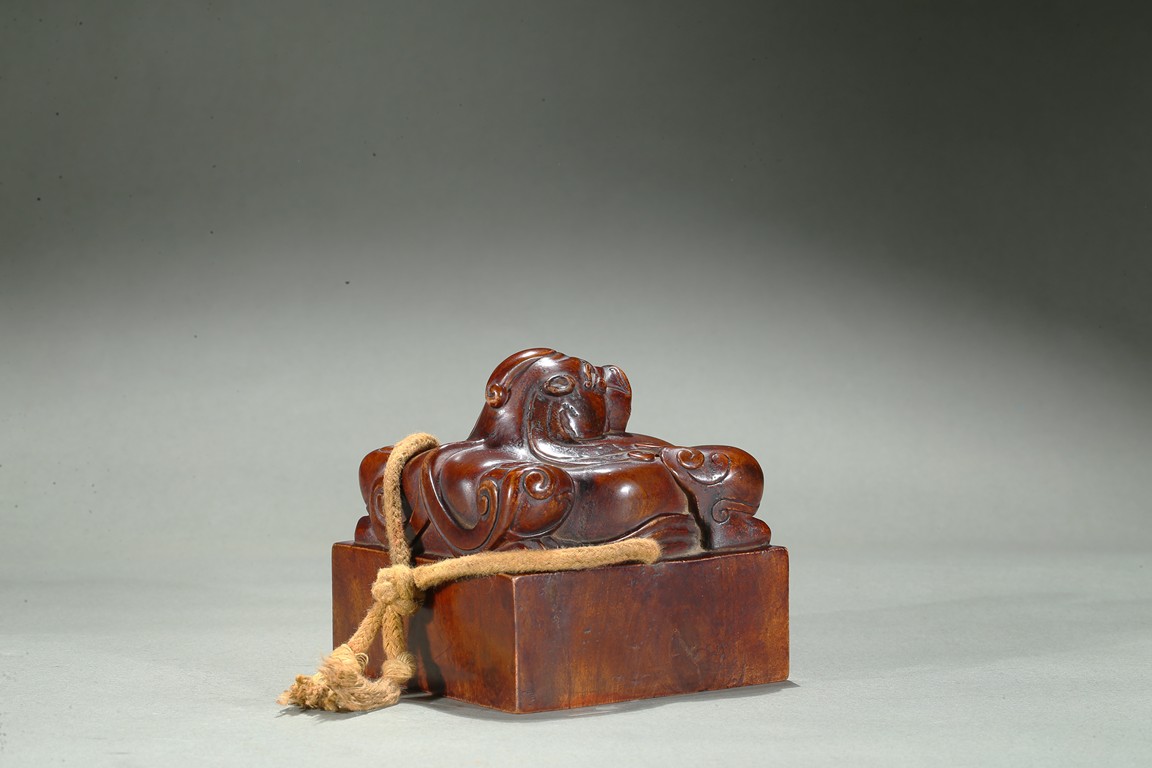 Of square section, the seal is surmounted with a recumbent mythical beast resting on four-feet, its head shown with bulging eyes, upturned snout, furled ears. The side with a hole through the center for the tassel, the seal face carved with six character reading 'Jiaqing Yubi Zhi Bao', or 'The Treasure of Imperial Writing of Jiaqing Emperor'. Qing Dynasty Jiaqing period.