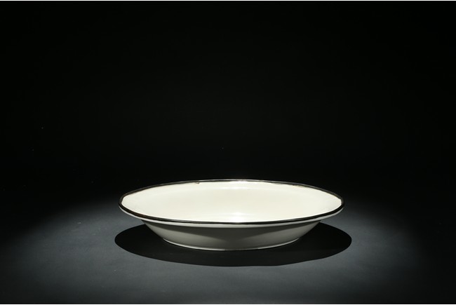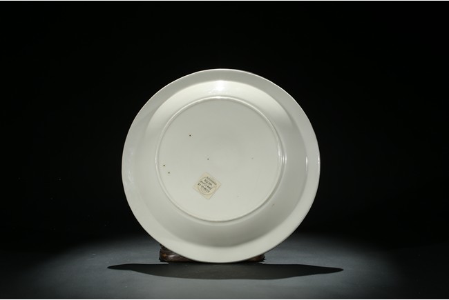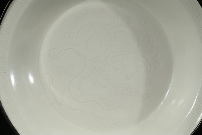 盤折沿,淺腹,淺圈足。通體施白釉,器口無釉,鑲銅口。近口沿處刻劃迴紋一周,內底刻劃螭龍紋。此件作品所刻螭龍紋栩栩如生,配在溫潤晶瑩的白色釉面上典雅優美,是定窯刻花白瓷的代表作品。定窯燒造白瓷始於唐代,雖然唐代以邢窯白瓷最負盛名,但定窯白瓷精品堪與邢瓷相媲美。到了宋代定盛而邢衰,人們遂只知有“定”而不知有“邢”了。定窯白瓷之所以能夠取代邢窯白瓷顯赫於天下,一方面是由於它在色調上屬於暖白色,細薄潤滑的釉面白中微閃黃,給人以溫潤恬靜的美感;另一方面定窯白瓷上運用了印花、刻花、劃花等裝飾技法,將白瓷從素白裝飾推向一個新階段。元代劉祁在《歸潛志》一書中曾有”定窯花瓷甌,顏色天下白”的讚譽。定窯瓷器的燒造主要採用覆燒法,就是將器皿反扣著焙燒,因此口沿無釉,露出瓷胎,這種現象謂之“芒口”。採用覆燒法可以提高產量,降低成本。瓷器燒成後,為避免芒口這種缺陷,有時使用金、銀、銅等鑲嵌器口。
