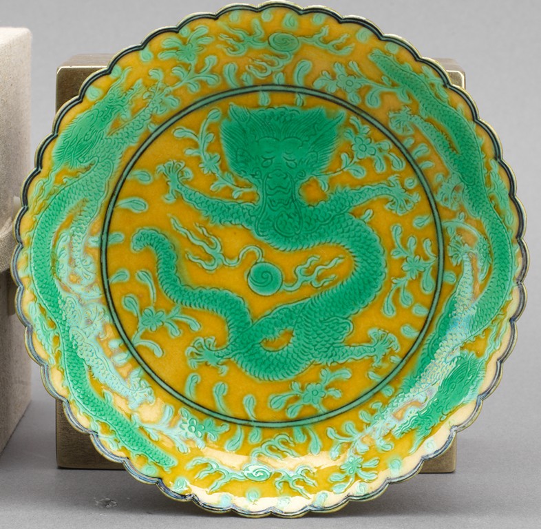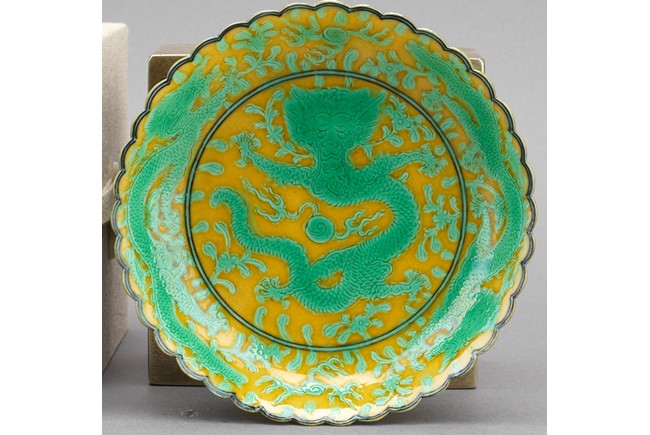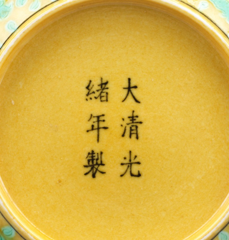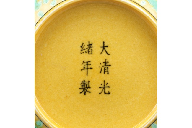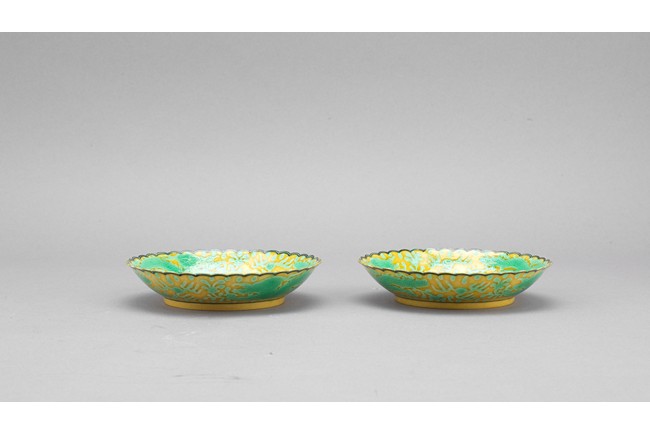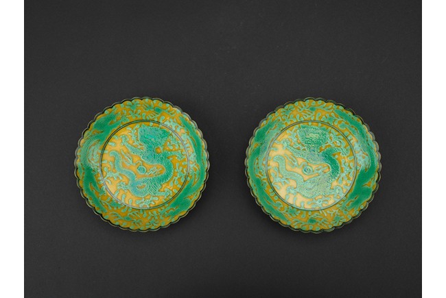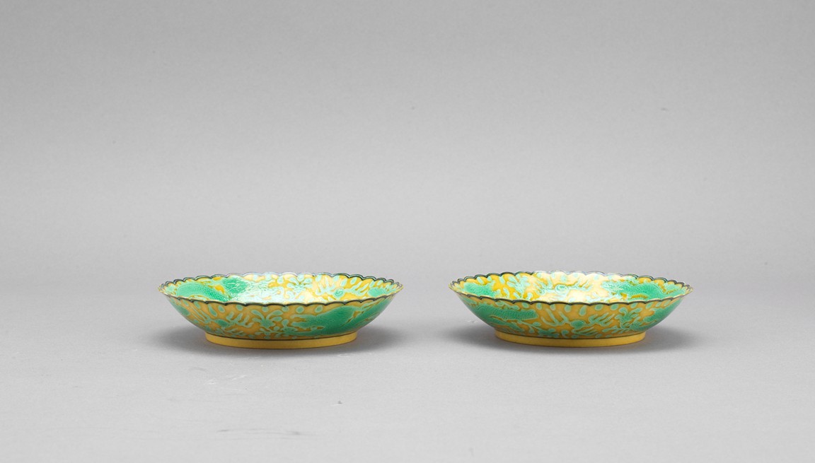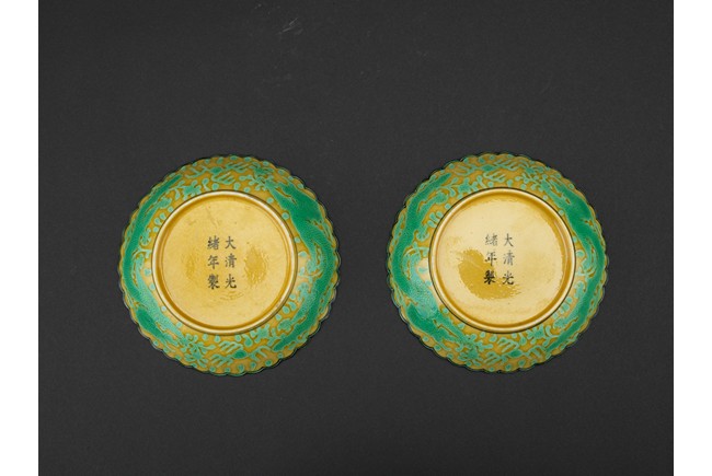 Each incised and painted in green enamel against a yellow ground, the interior with dragons striding among clouds in pursuit of flaming pearls, the exterior with further similar dragon decorations, the base with six character Guangxu mark. Qing Dynasty Guangxu period.