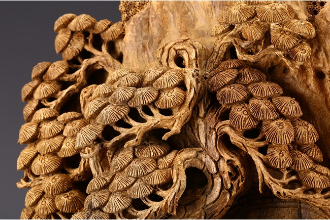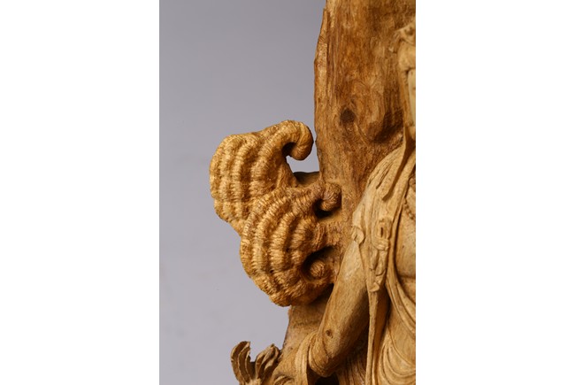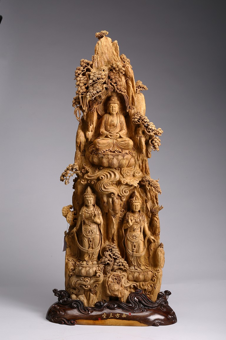 在世界上很多地方,沉香木是珍貴的香料,被用作燃燒熏香、提取香料、加入酒中,或直接雕刻成裝飾品,大型的沉香極其少見。本件器物用大型沉香雕刻出西方三聖(西方三聖又稱彌陀三尊,指的是西方極樂世界三尊主要的佛菩薩,即教主阿彌陀佛和他的左脅侍觀世音菩薩、右脅侍大勢至菩薩。造像上,三者皆在蓮座上,蓮象徵出淤泥而不染,於一真法界而能應化在十法界;阿彌陀佛居中,觀音菩薩脅侍在左,大勢至菩薩脅侍在右。三者塑像或畫像為修行淨土宗者禮敬的對象。 )工藝精美,實屬難得。