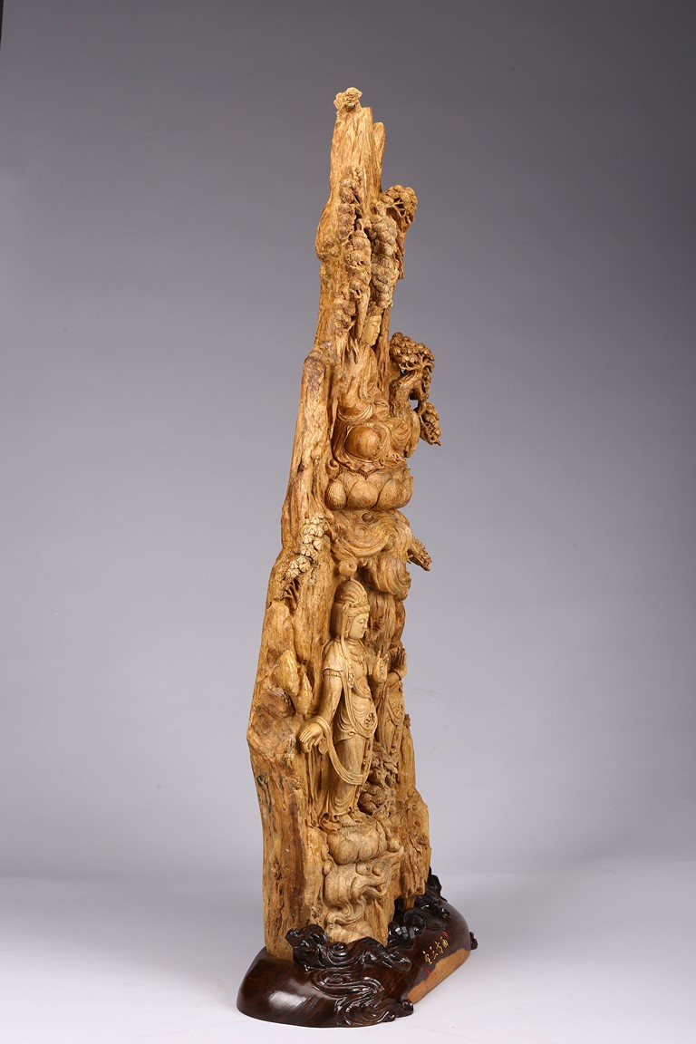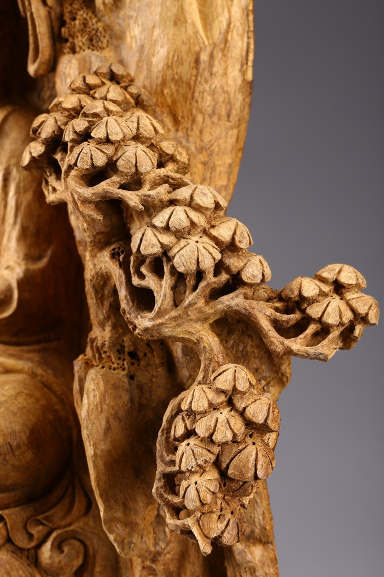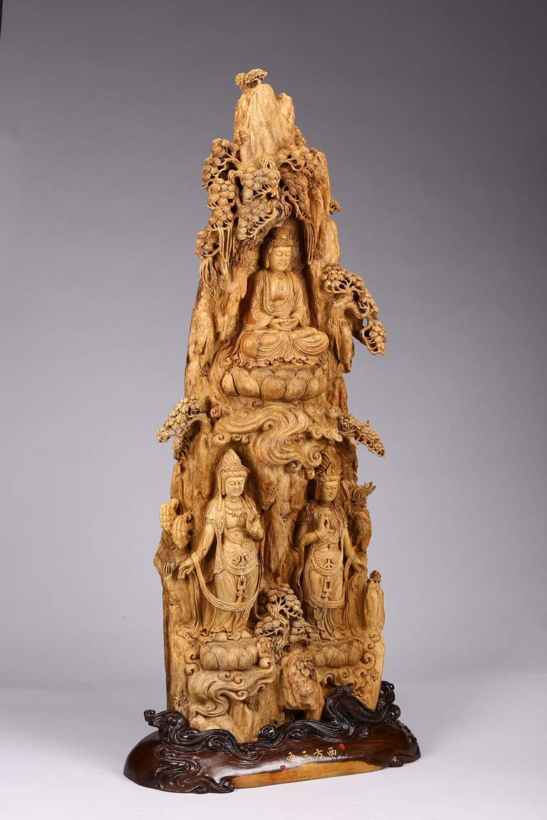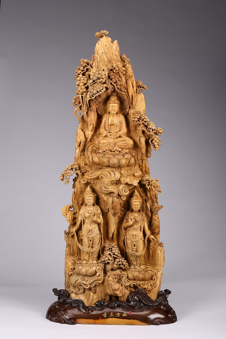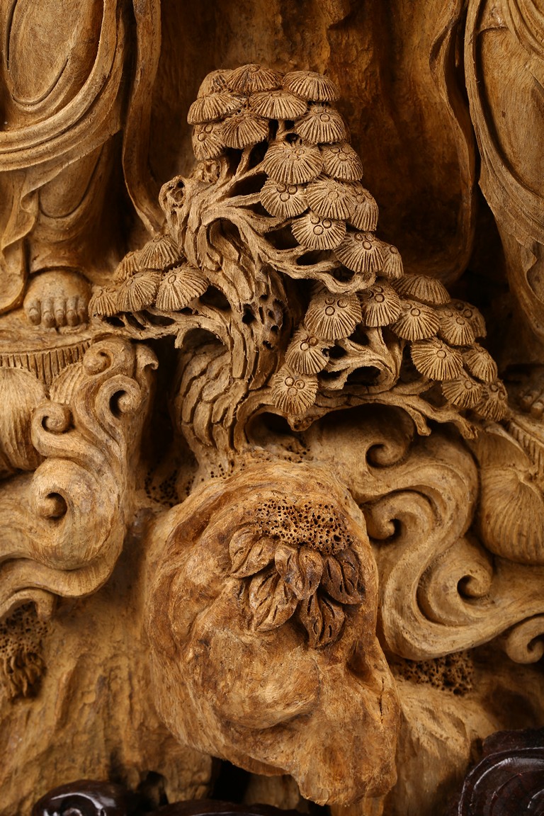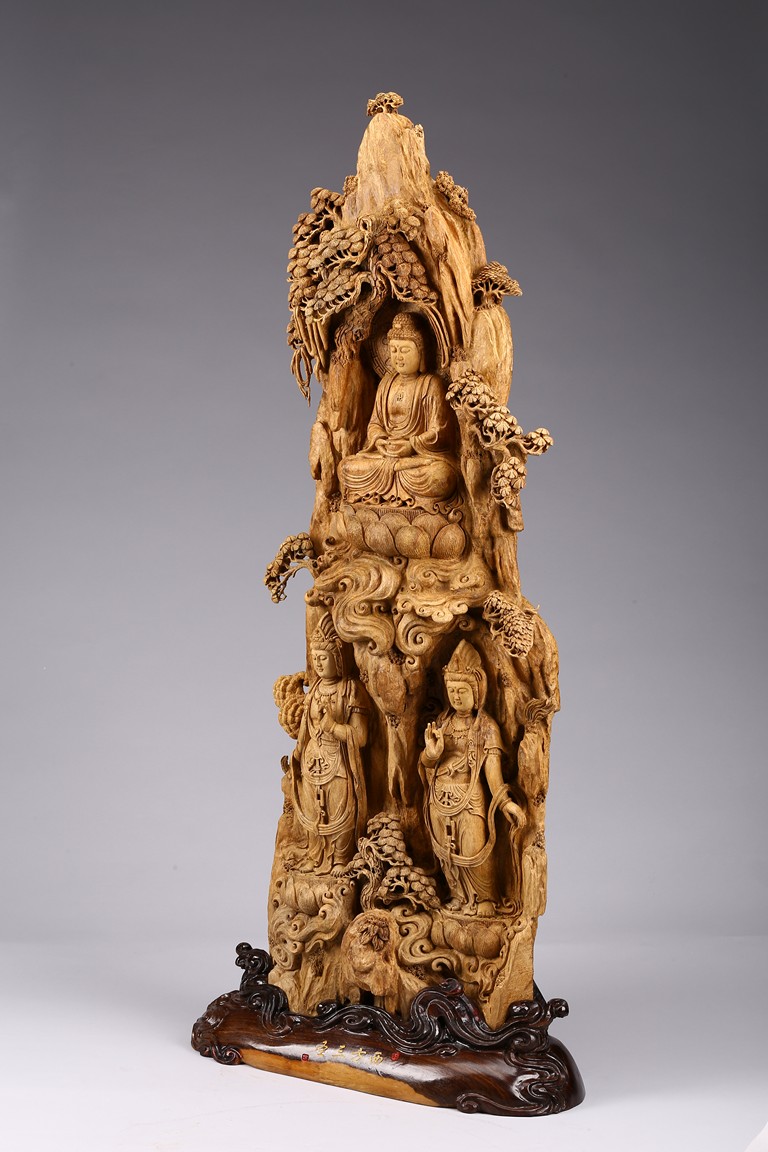 Carved out of a single large agarwood trunk, the upright carving depicts the seated Amitabha buddha upon double lotus throne below pine trees growing out of the rocks, accompanied by the standing Avalokiteshvara buddha to his lower left, and the standing Mahasthamaprapta buddha to his lower right, all supported on carved celestial clouds.
