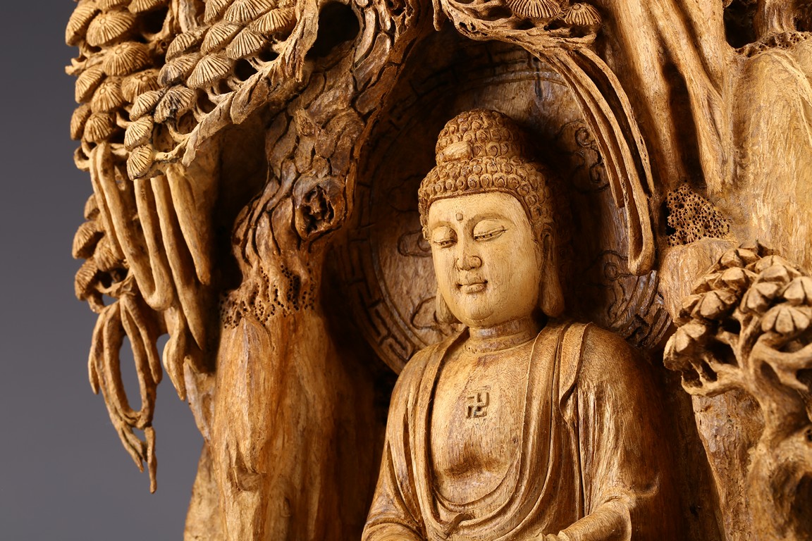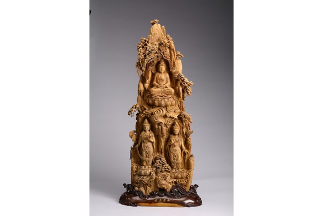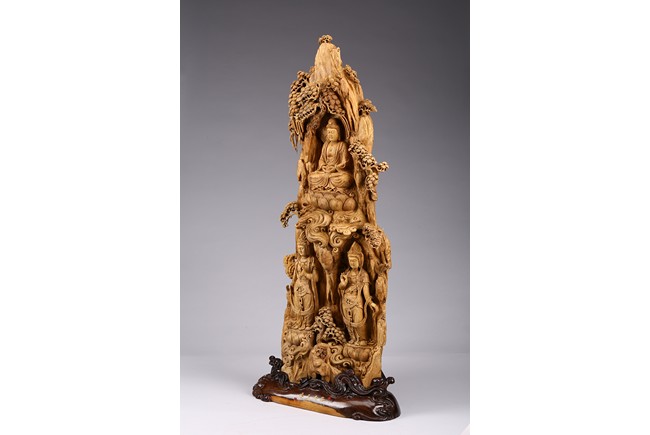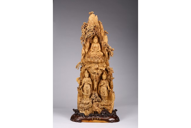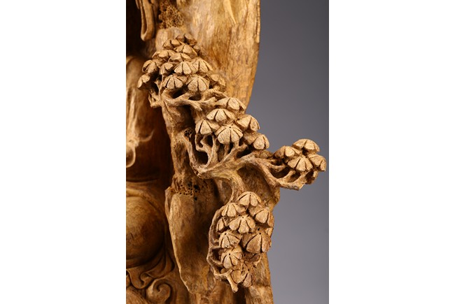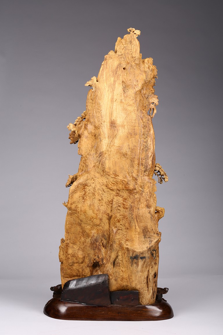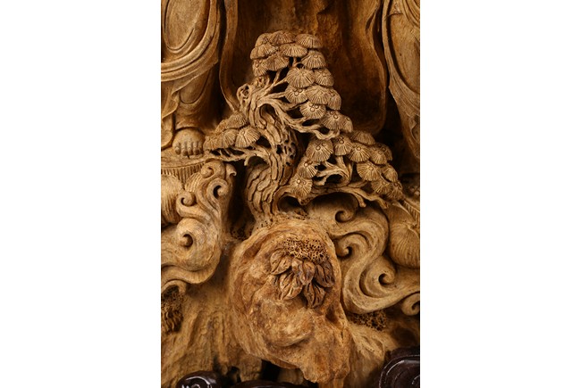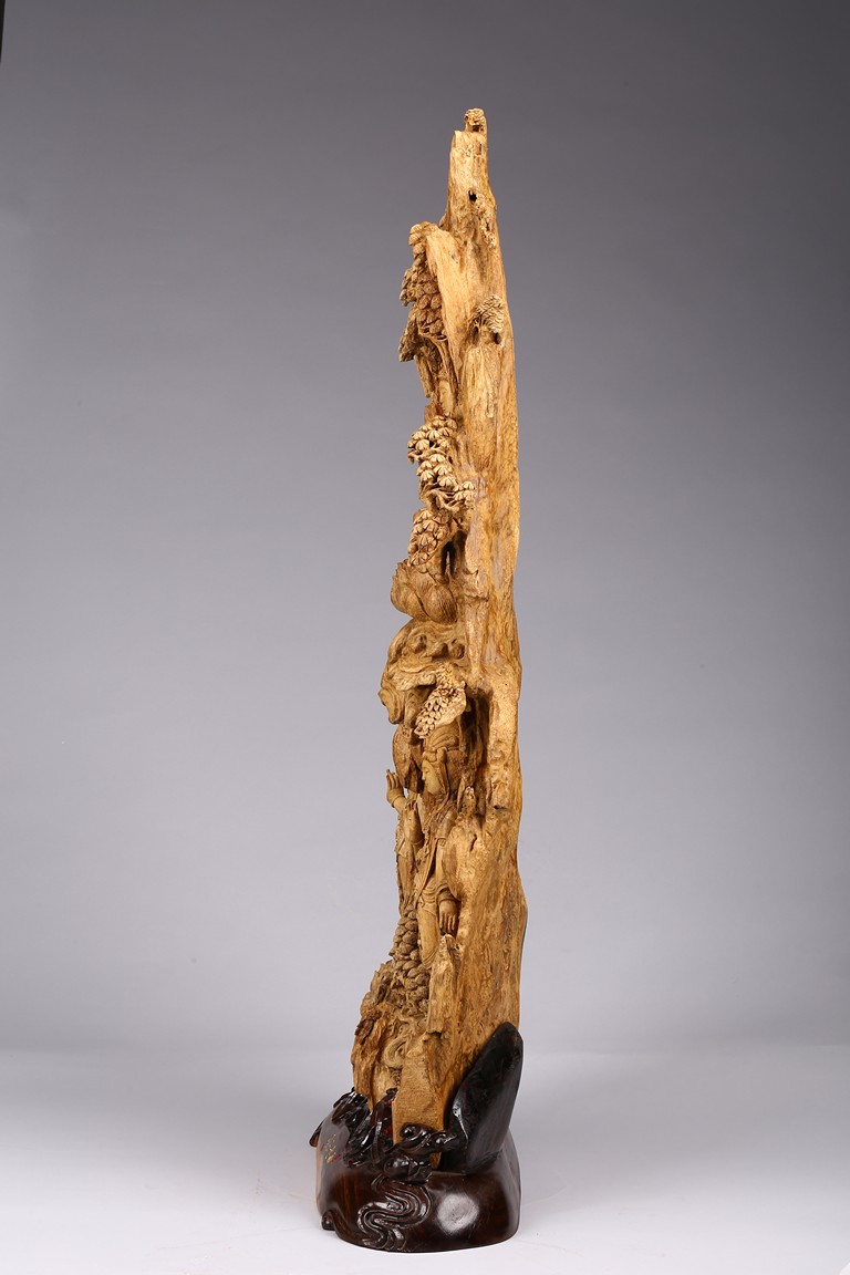 Carved out of a single large agarwood trunk, the upright carving depicts the seated Amitabha buddha upon double lotus throne below pine trees growing out of the rocks, accompanied by the standing Avalokiteshvara buddha to his lower left, and the standing Mahasthamaprapta buddha to his lower right, all supported on carved celestial clouds.