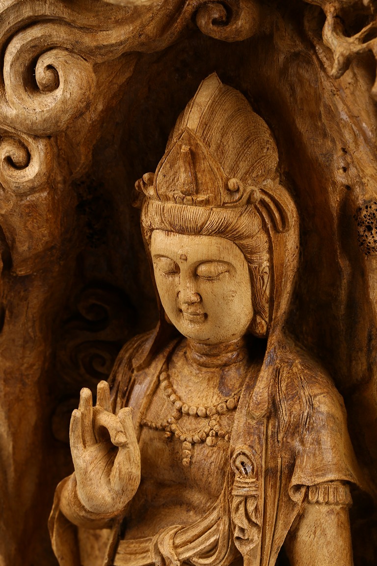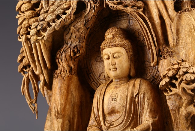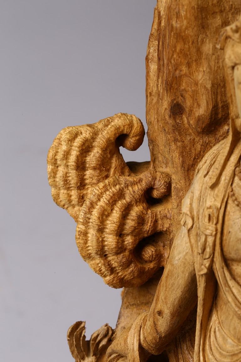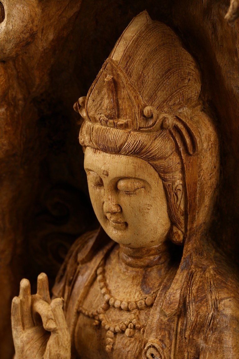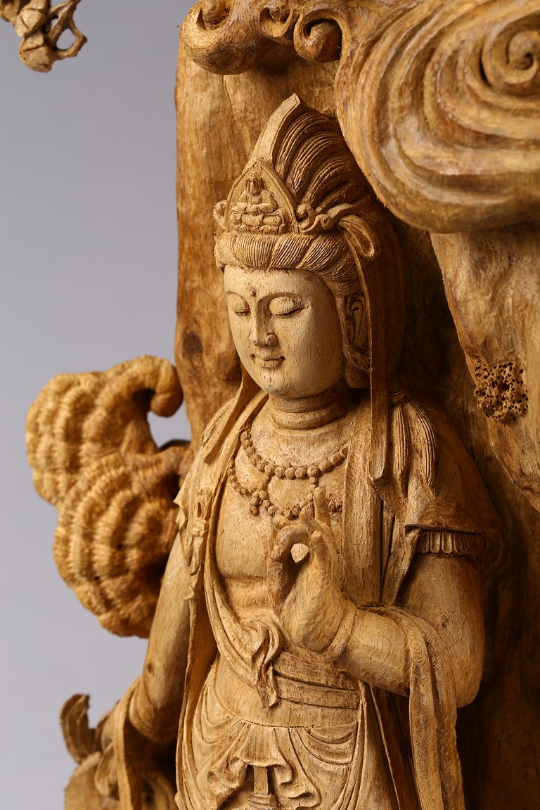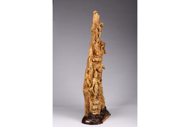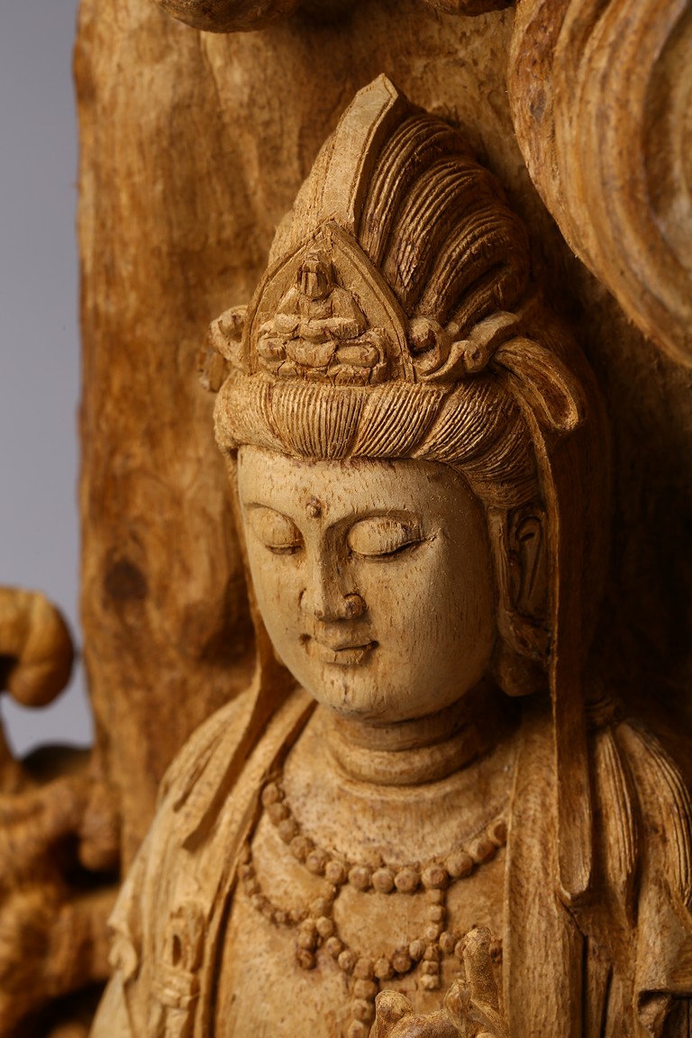 Carved out of a single large agarwood trunk, the upright carving depicts the seated Amitabha buddha upon double lotus throne below pine trees growing out of the rocks, accompanied by the standing Avalokiteshvara buddha to his lower left, and the standing Mahasthamaprapta buddha to his lower right, all supported on carved celestial clouds.