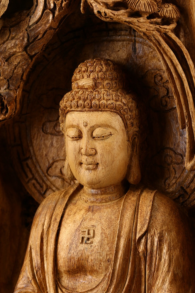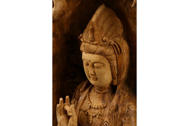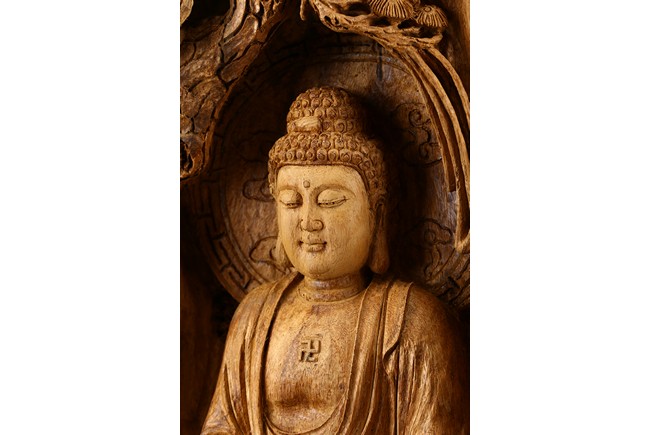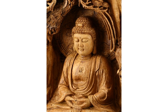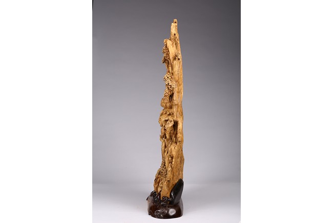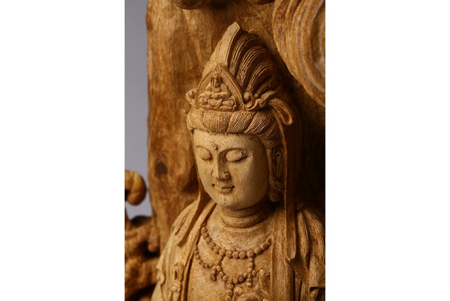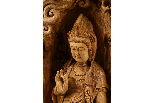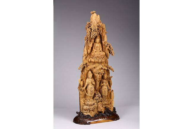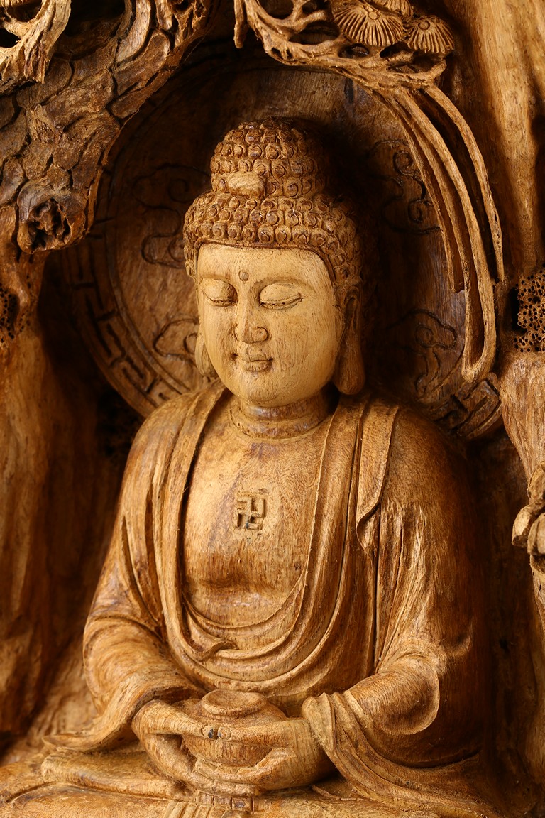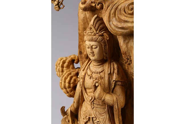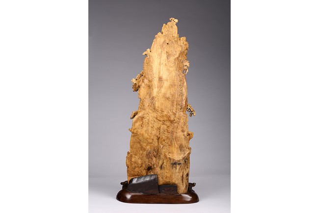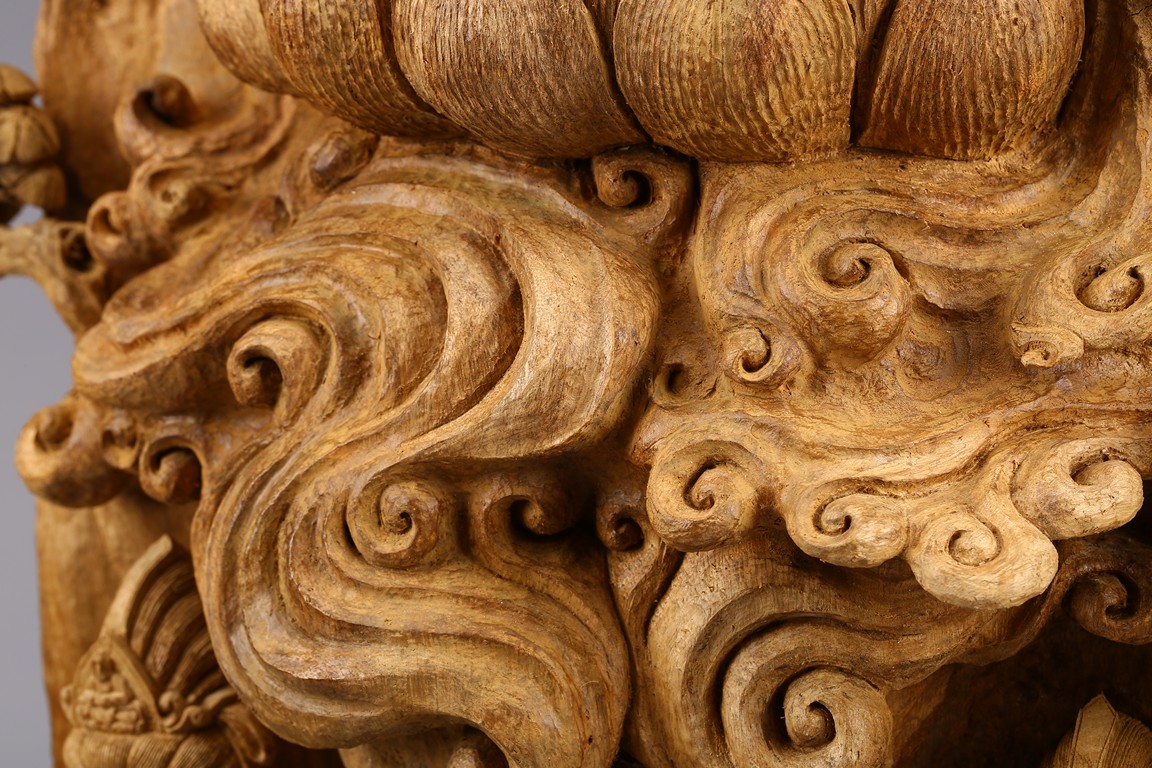 Carved out of a single large agarwood trunk, the upright carving depicts the seated Amitabha buddha upon double lotus throne below pine trees growing out of the rocks, accompanied by the standing Avalokiteshvara buddha to his lower left, and the standing Mahasthamaprapta buddha to his lower right, all supported on carved celestial clouds.