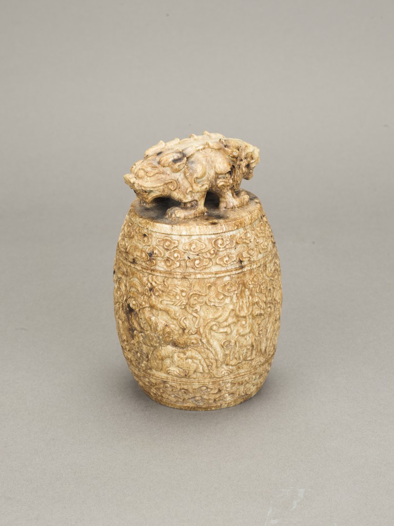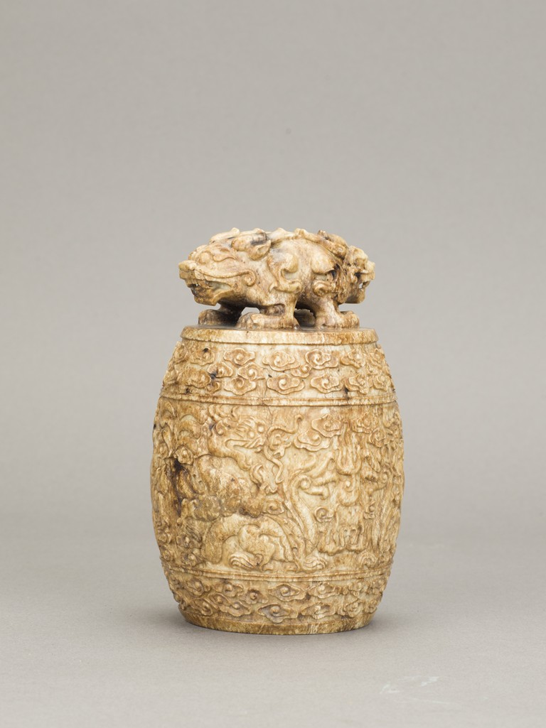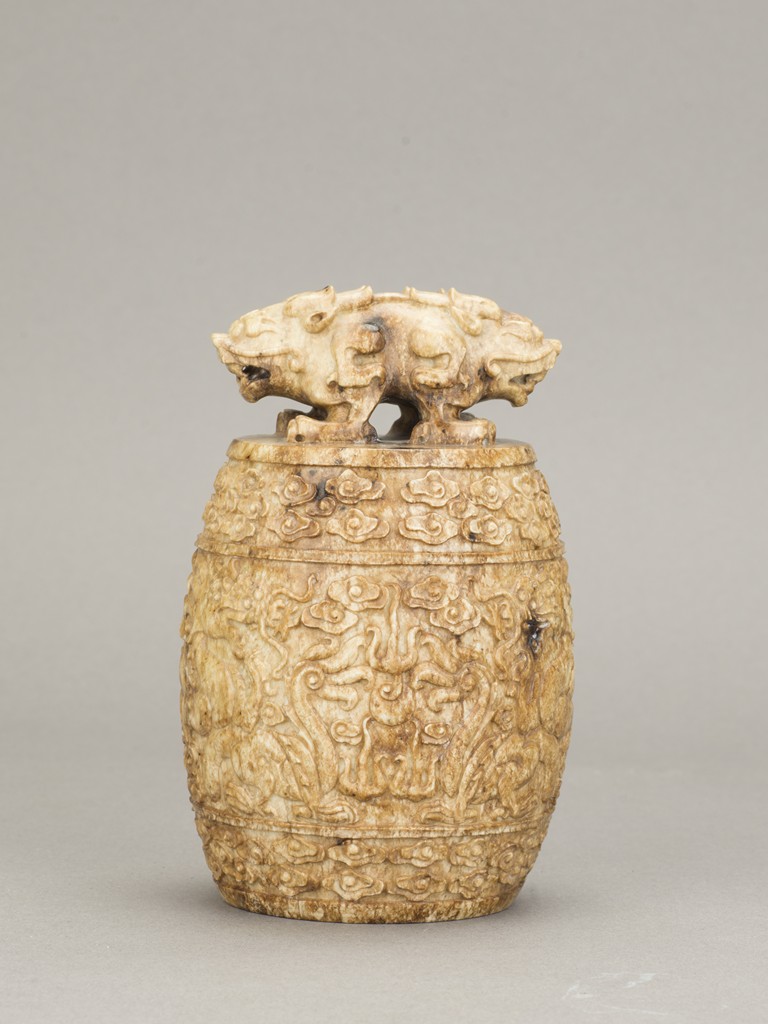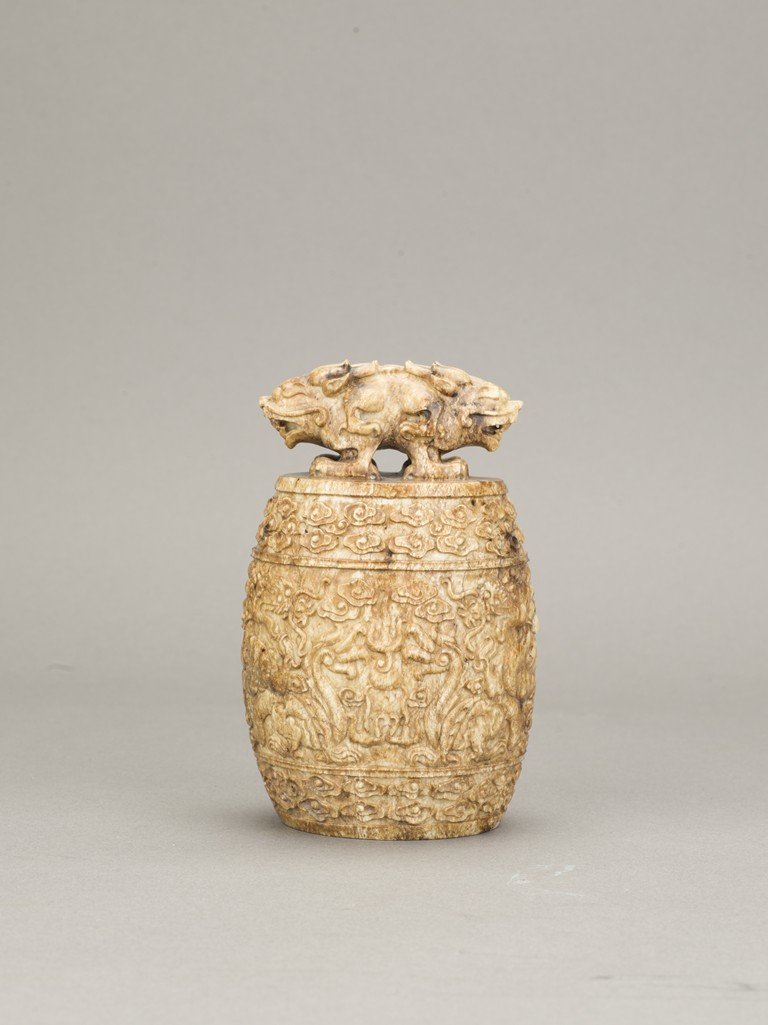The bell with double dragon headed handle, the barrel-shaped body with three bands, the central band carved in relief with two dragons in pursuit of flaming pearl, flanked by two bands auspicious clouds, the stone is of opaque mottled white and russet tone with black inclusions. Qing Dynasty period.