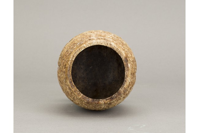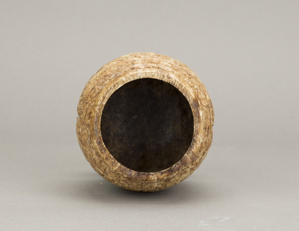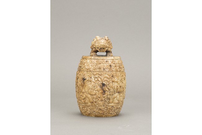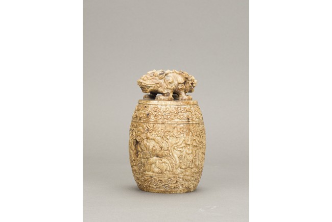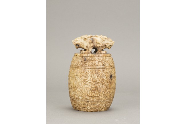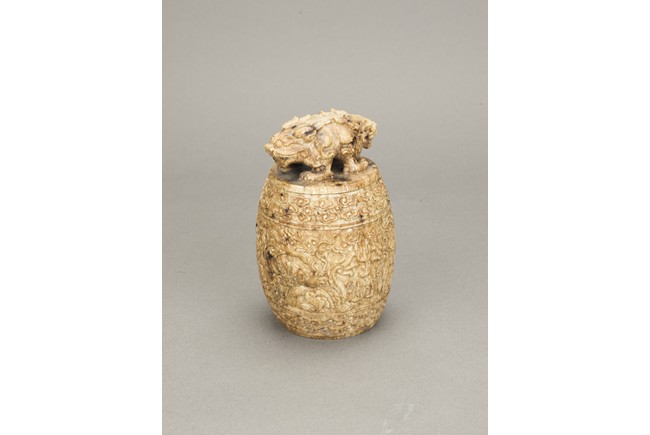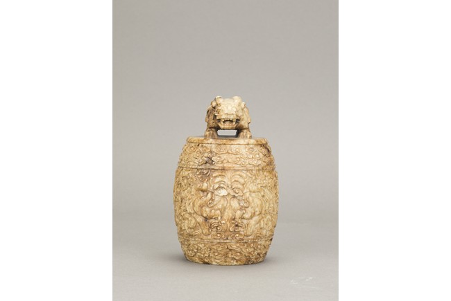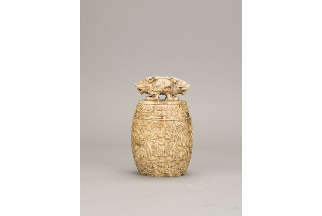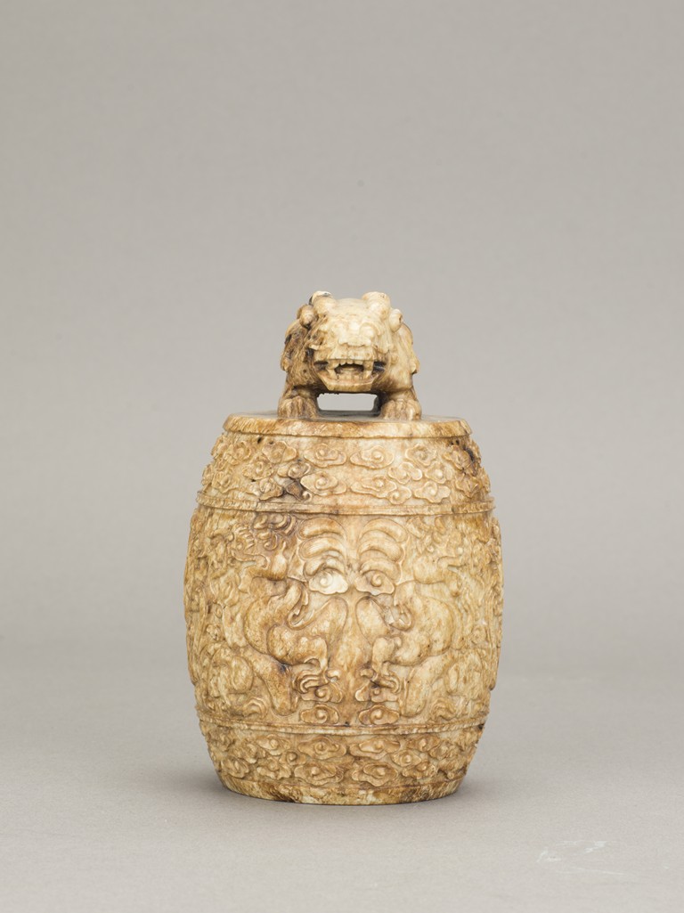 The bell with double dragon headed handle, the barrel-shaped body with three bands, the central band carved in relief with two dragons in pursuit of flaming pearl, flanked by two bands auspicious clouds, the stone is of opaque mottled white and russet tone with black inclusions. Qing Dynasty period.