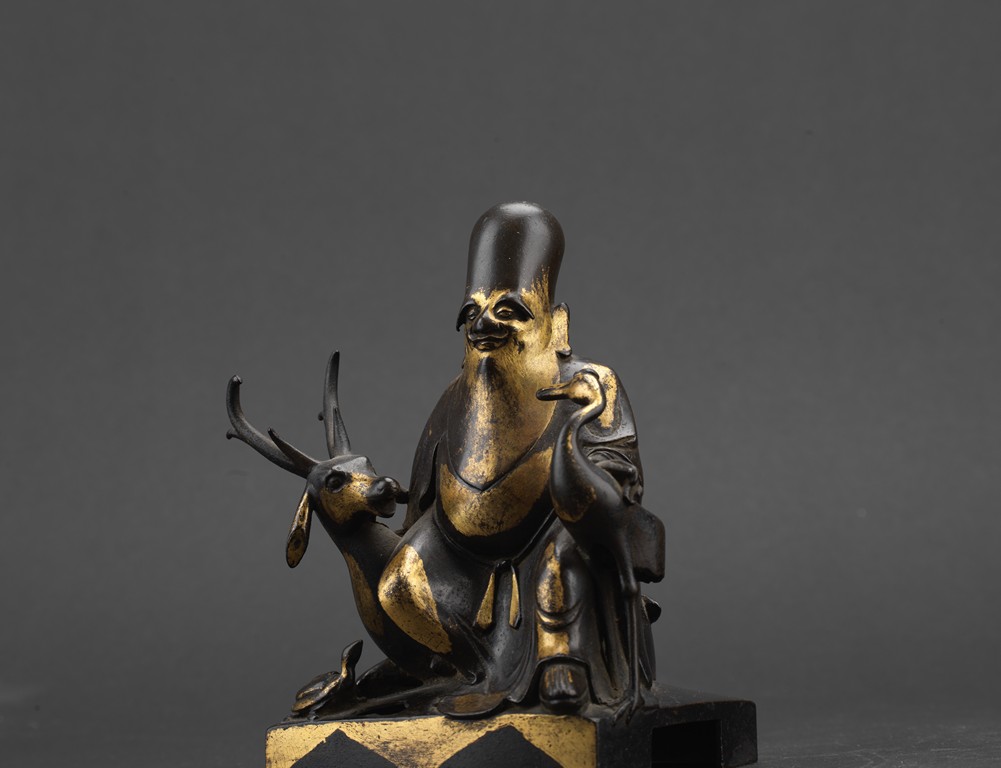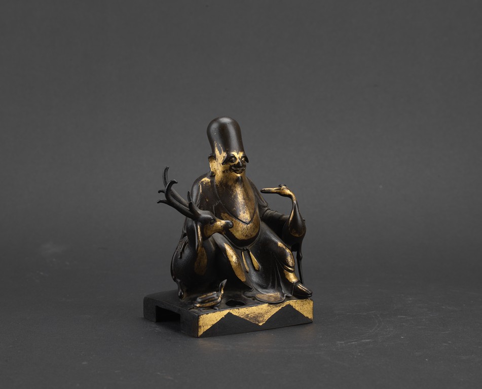 The shoulao is cast seated and flanked by a crane and a deer. Qing Dynasty period.