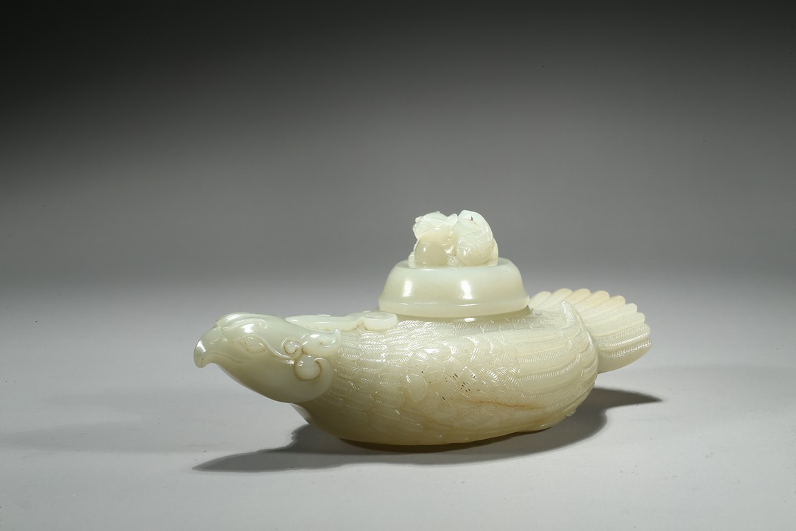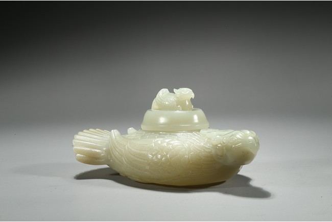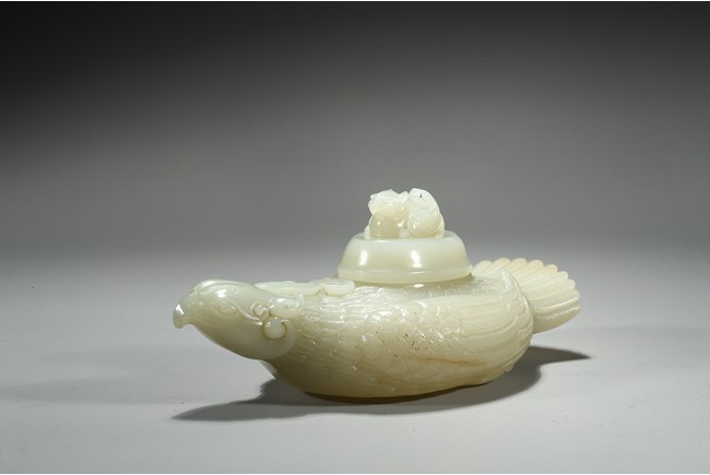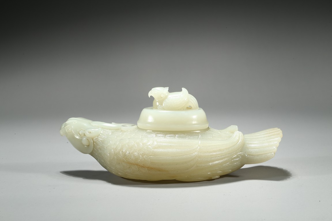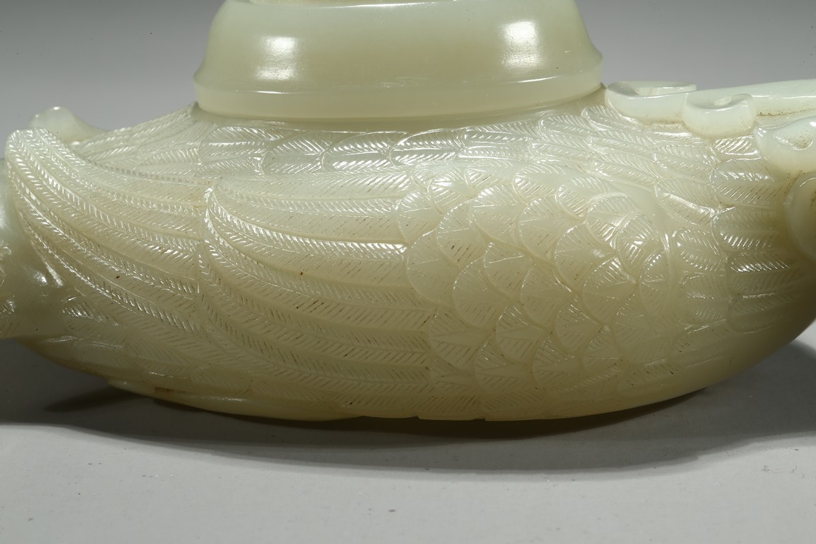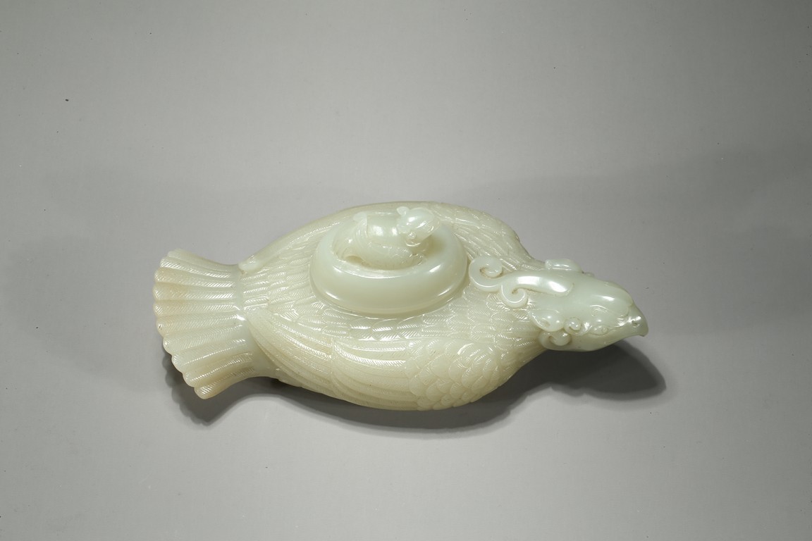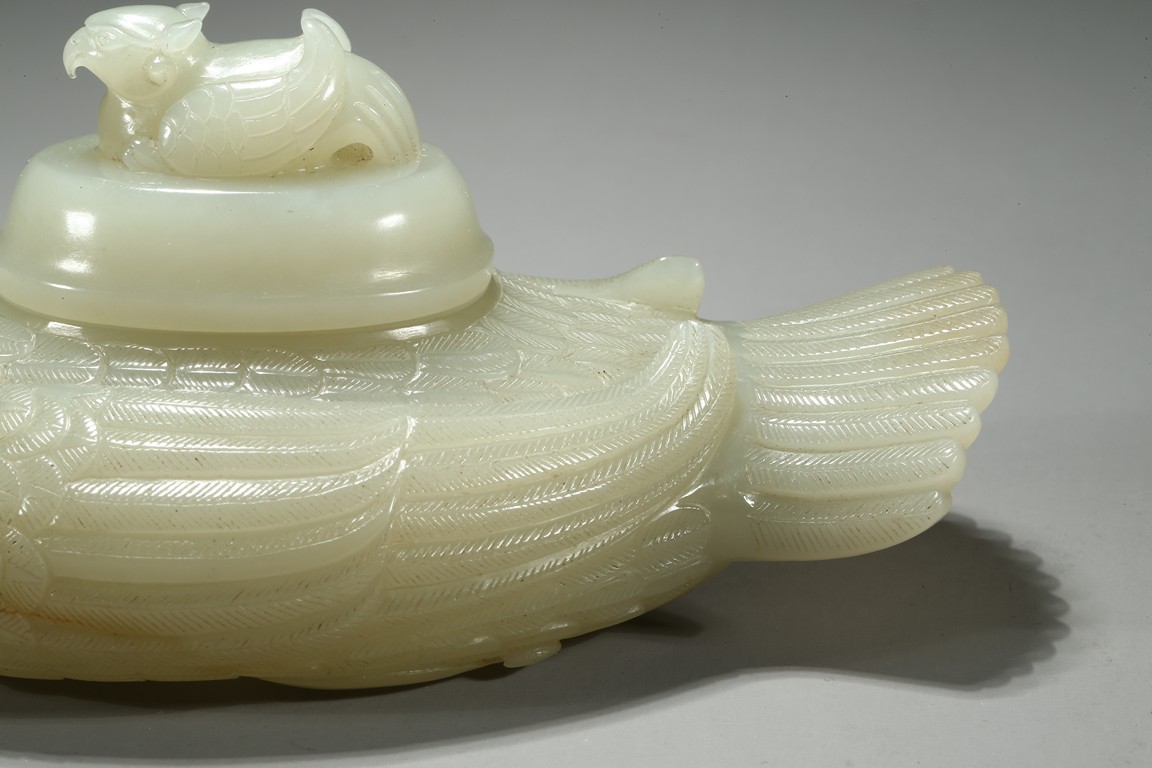 Carved as a recumbent phoenix with legs tucked under the body, the feather, wings, and tail finely incised with details, the domed cover surmounted with a phoenix form finial. Qing Dynasty period.