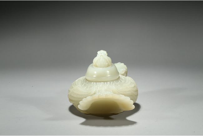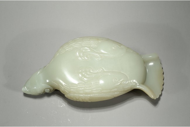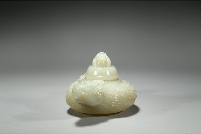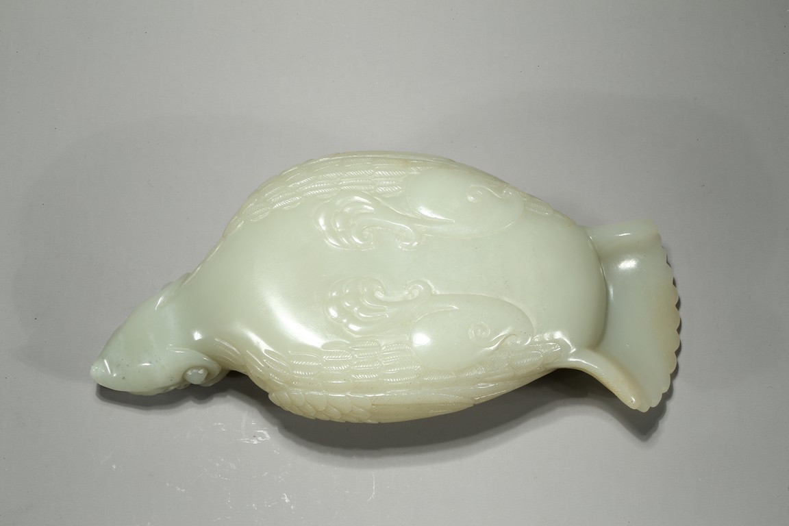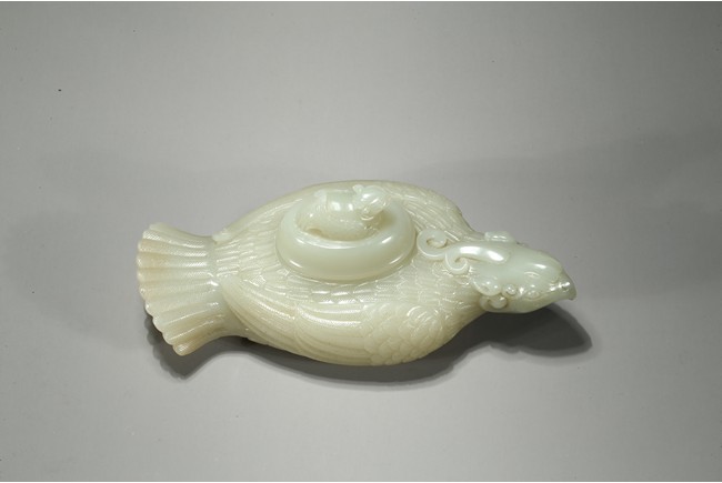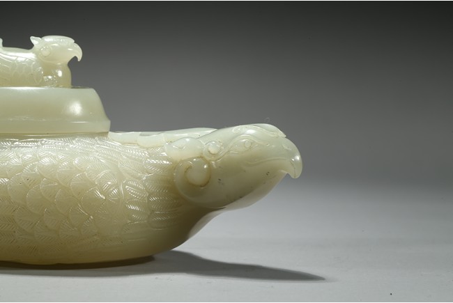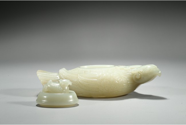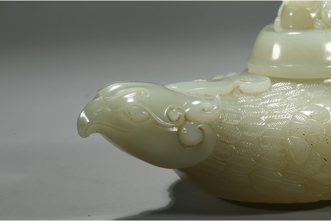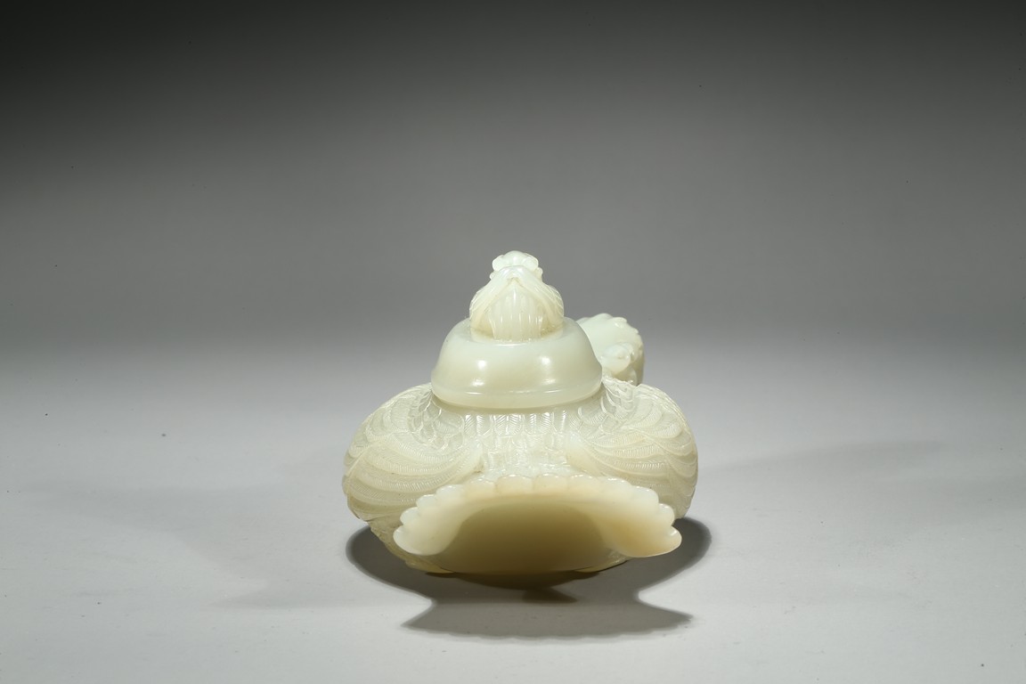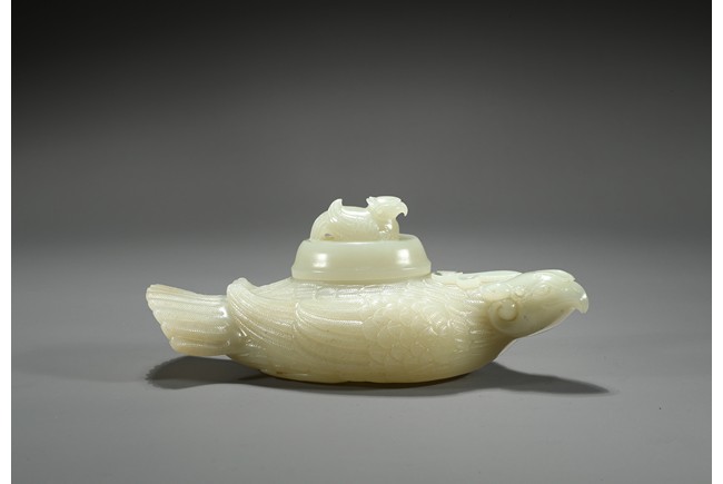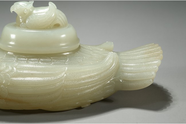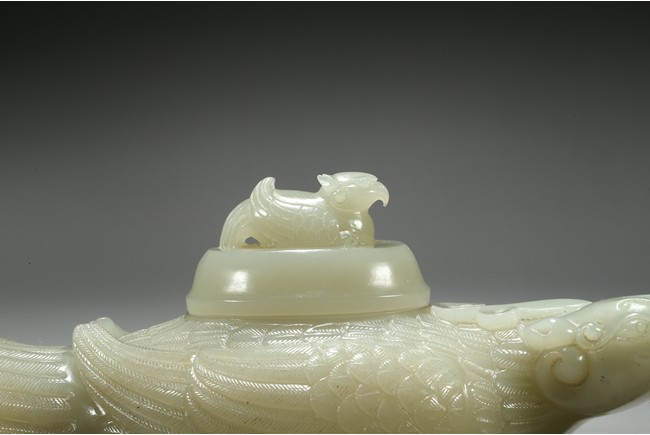 Carved as a recumbent phoenix with legs tucked under the body, the feather, wings, and tail finely incised with details, the domed cover surmounted with a phoenix form finial. Qing Dynasty period.