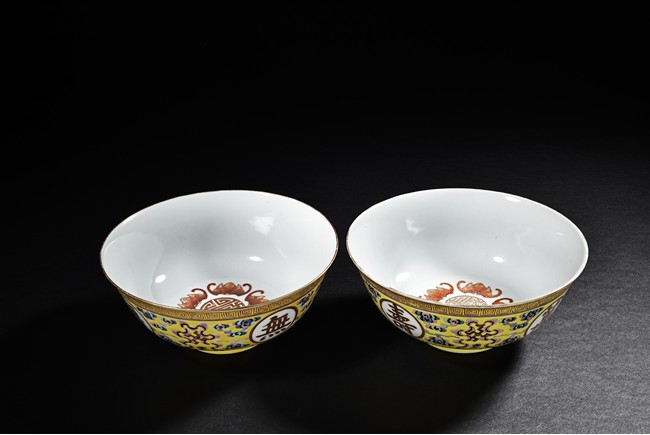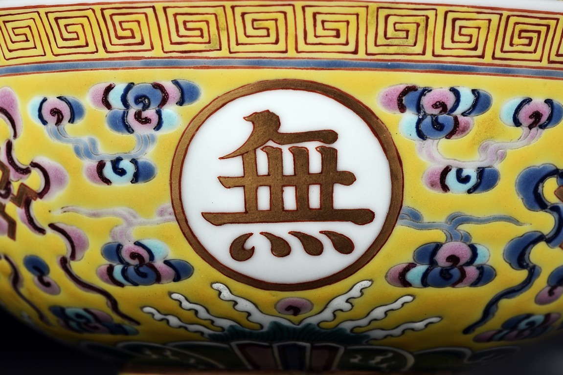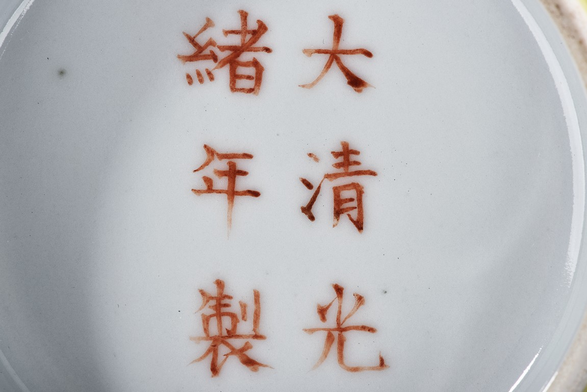 Decorated with four medallions each enclosing auspicious character, the interior with a central medallion flanked by five bats, base with a six-character mark in iron-red. Qing Dynasty period.