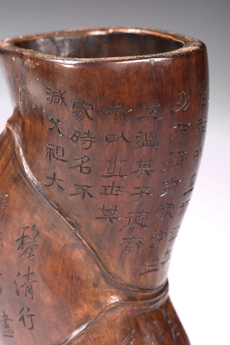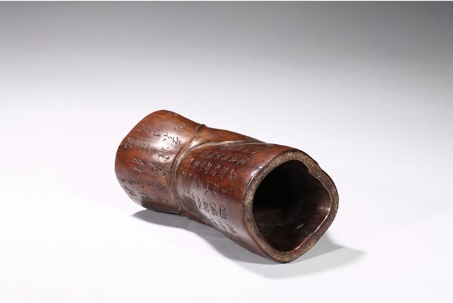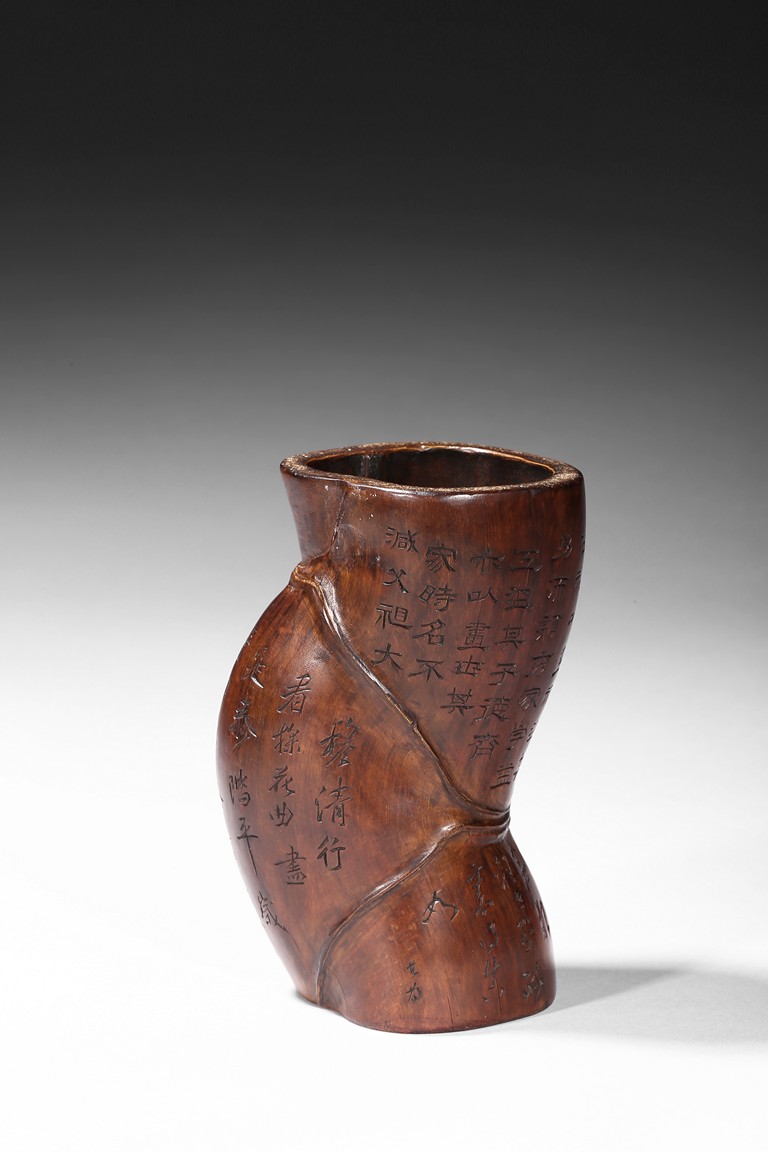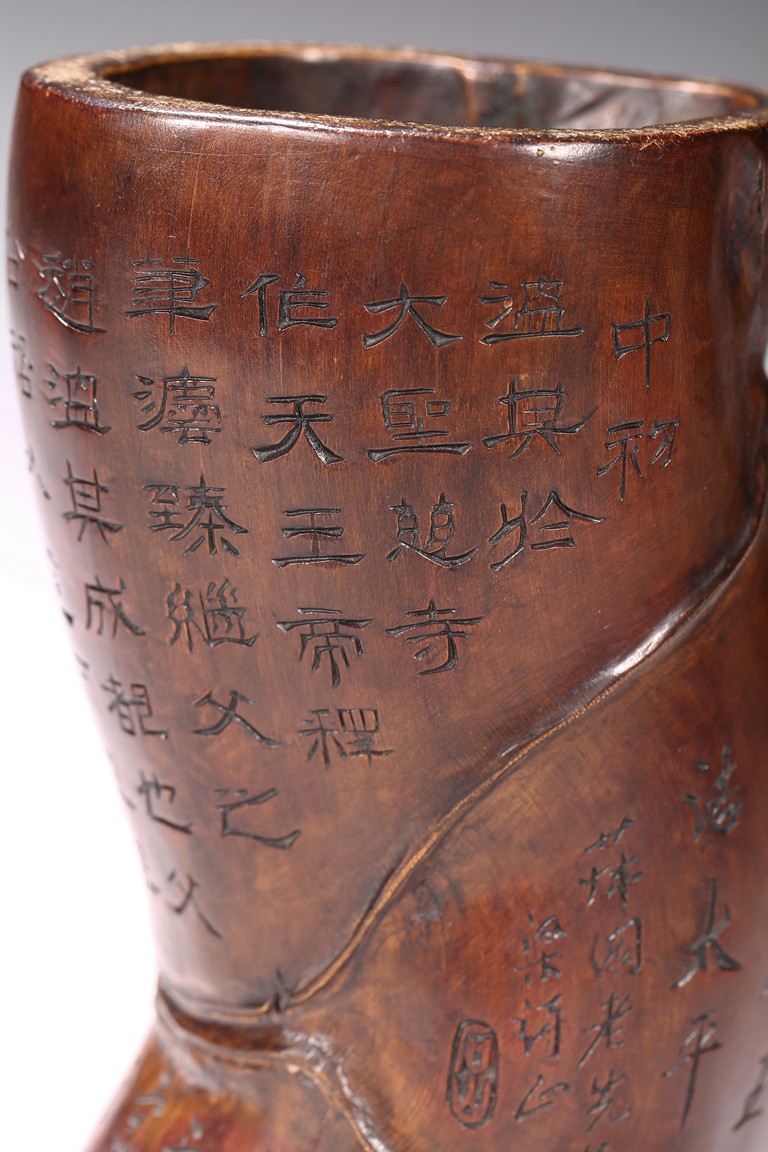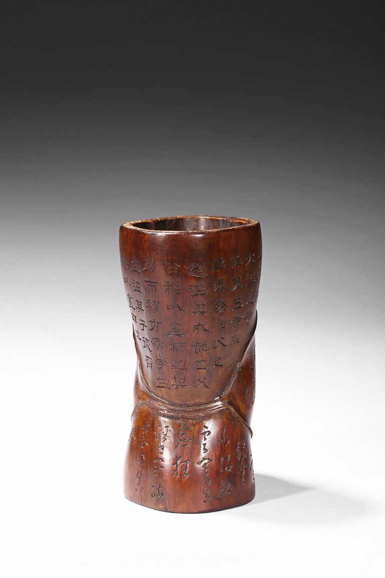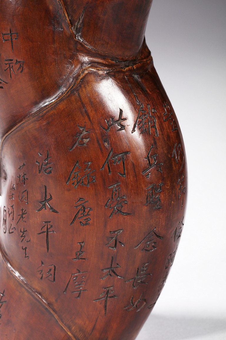 Of irregular form, finely incised with poetic inscription in various styles of calligraphy and a seal mark. The bamboo is of a deep brownish red tone. Qing Dynasty period.