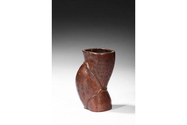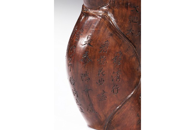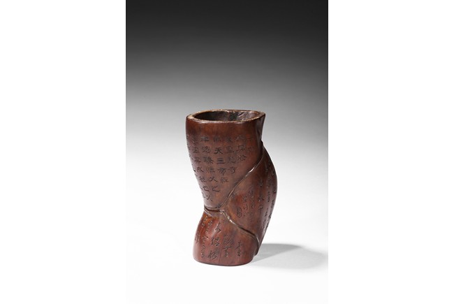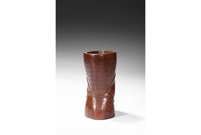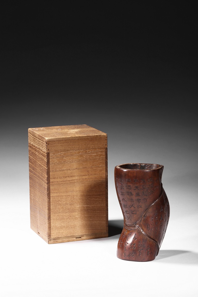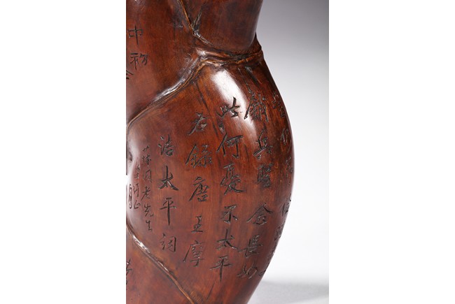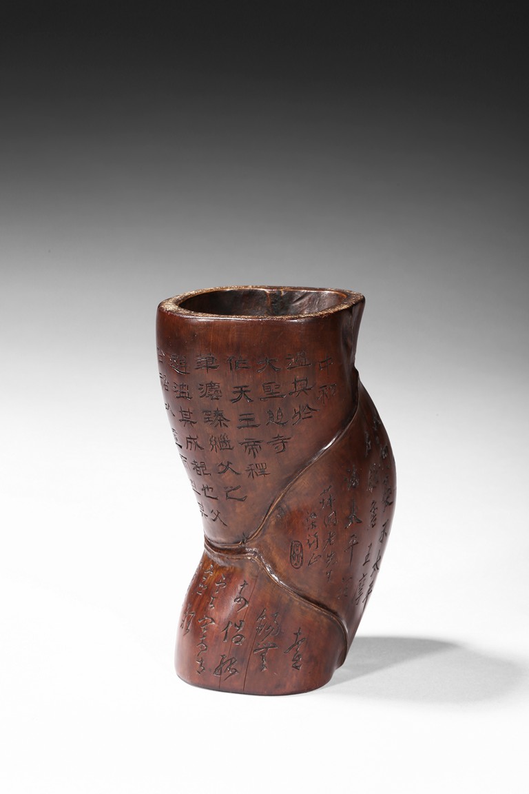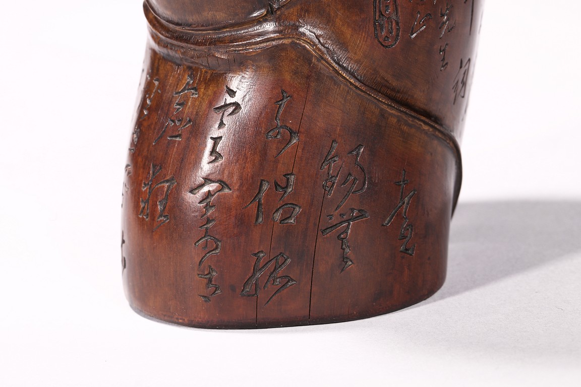 Of irregular form, finely incised with poetic inscription in various styles of calligraphy and a seal mark. The bamboo is of a deep brownish red tone. Qing Dynasty period.