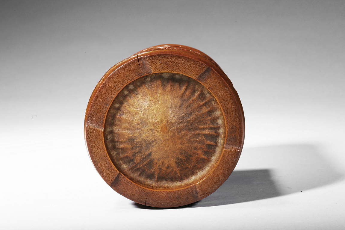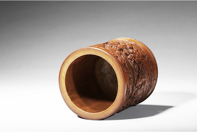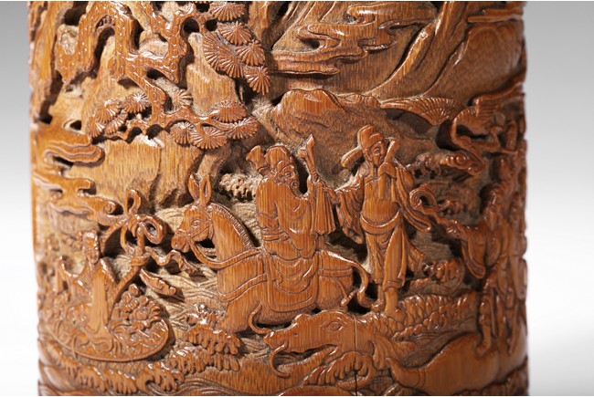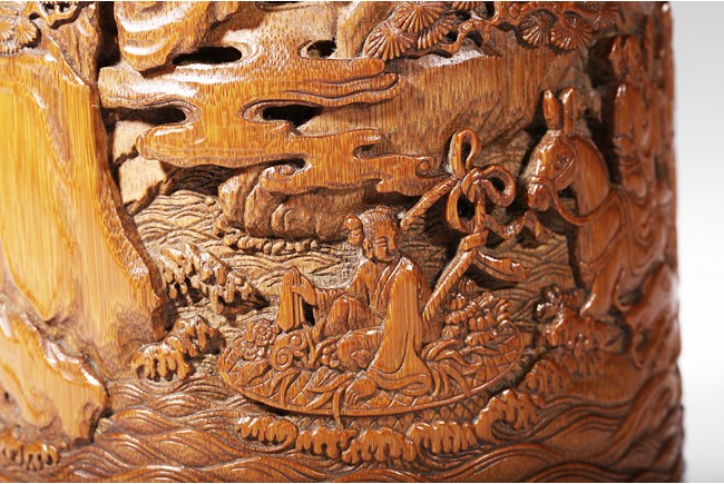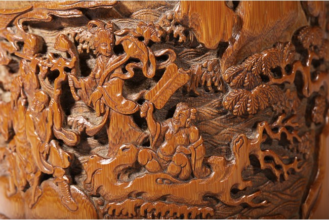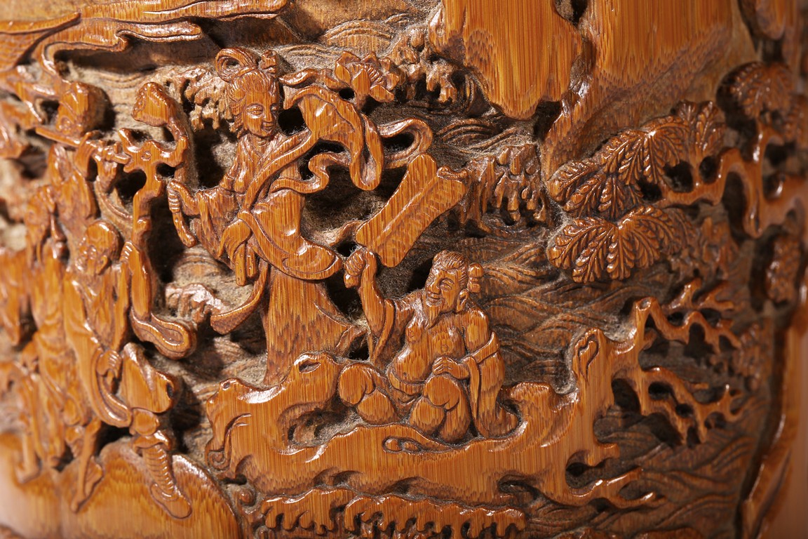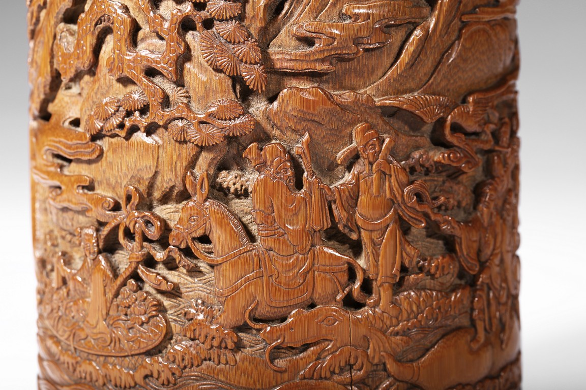 Of cylindrical form resting on three short feet, carved in vary relief with a continuous scene of the Eight Immortals crossing the sea and arriving on the land, all highly detailed with facial features and wearing elaborate robes, incised with pine trees on jagged cliffs and rocky promontories. The bamboo of a warm golden-brown patina.