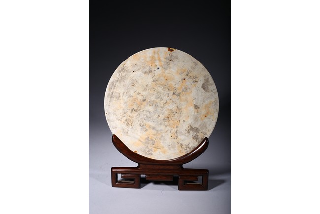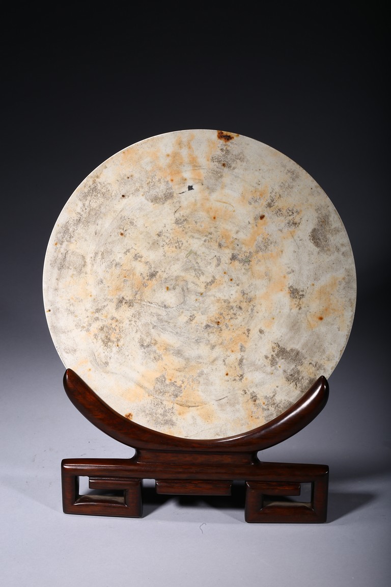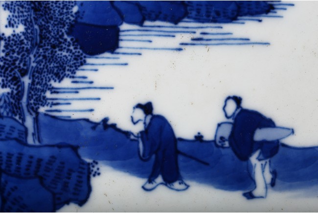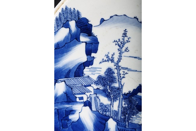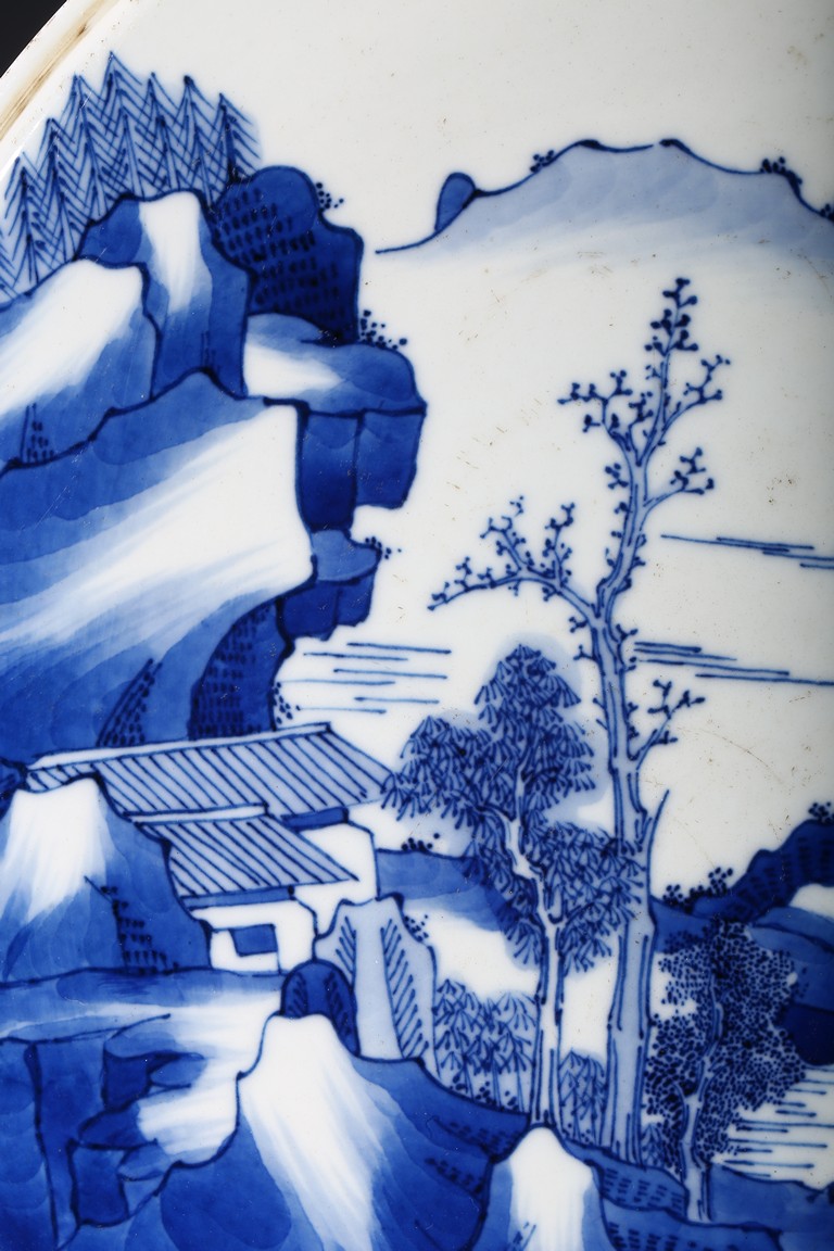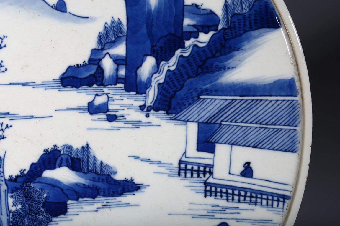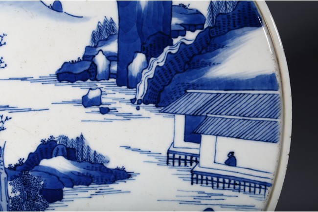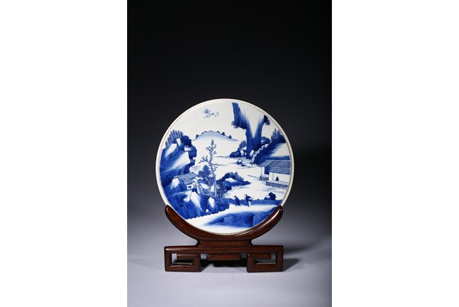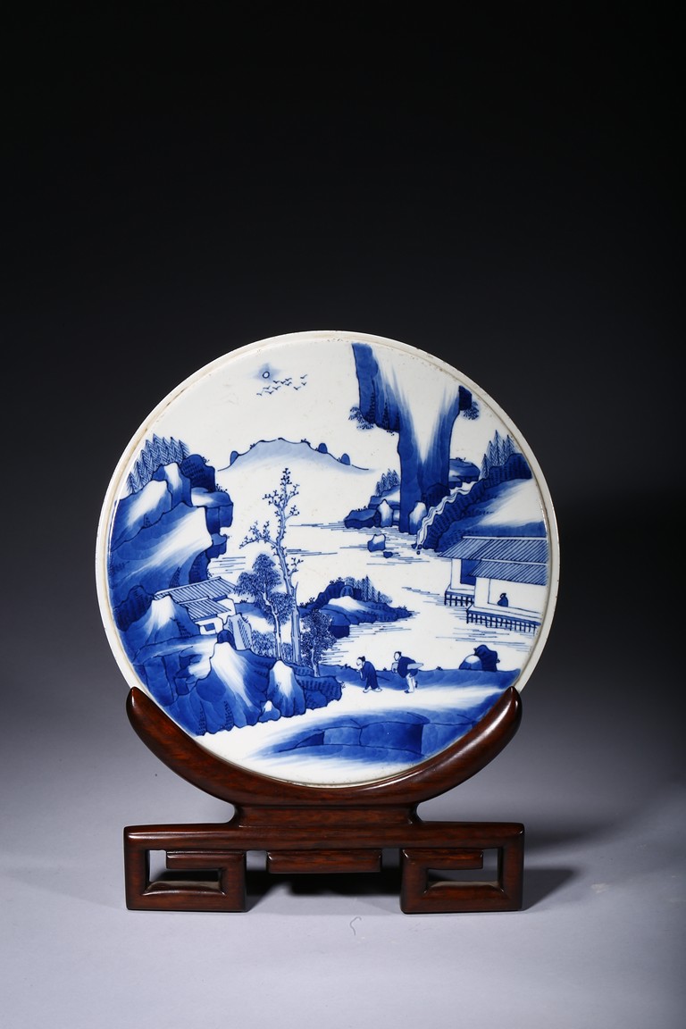 Of circular section, painted blue and white depicting a riverside landscape with cottages, trees and rocks, with figures walking across the river. accompanied with wood stand.