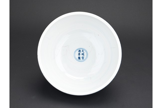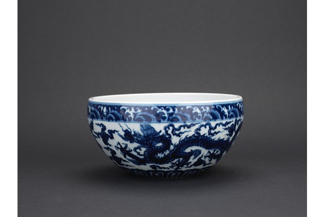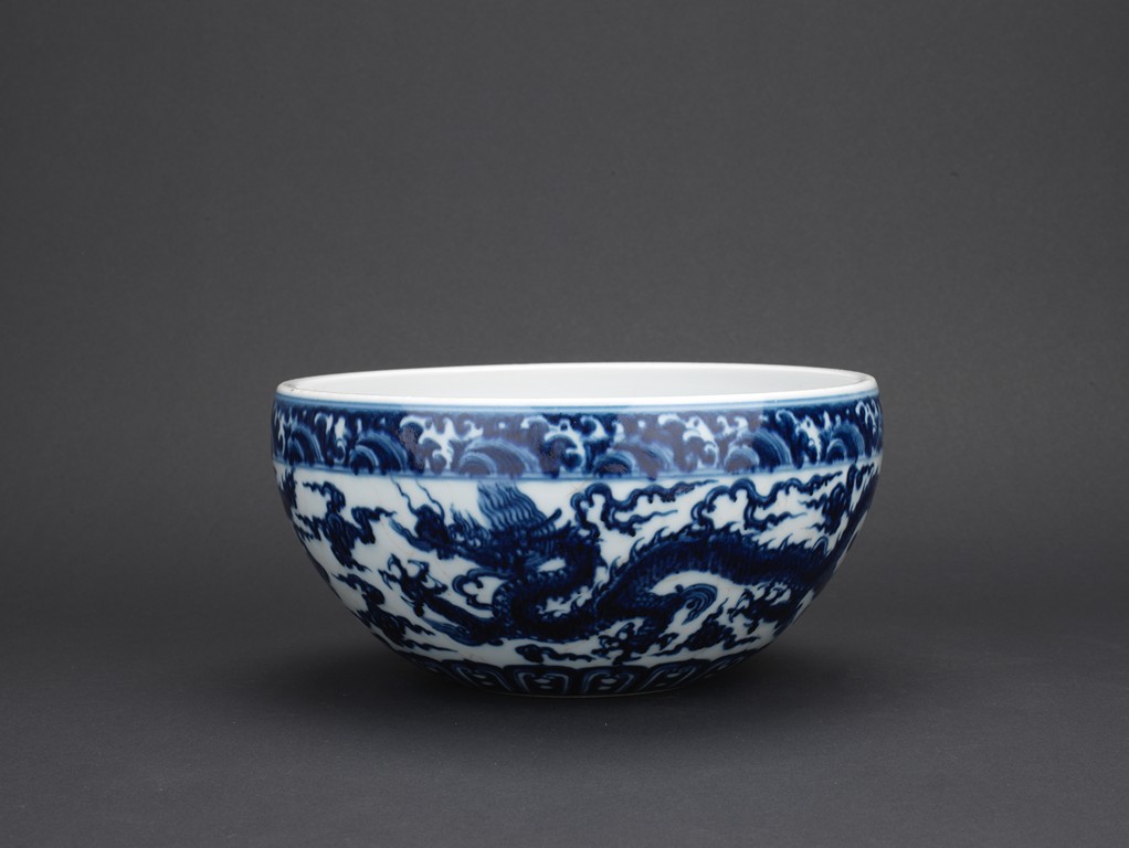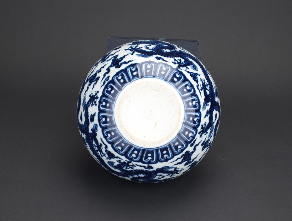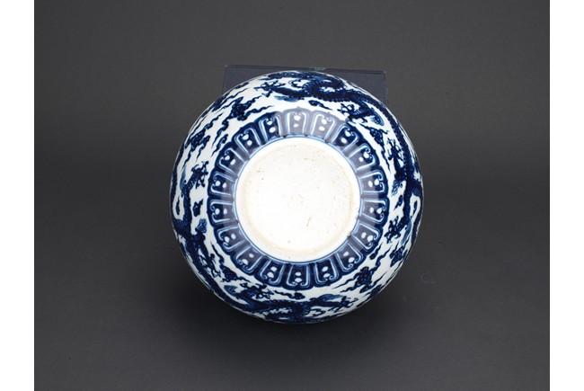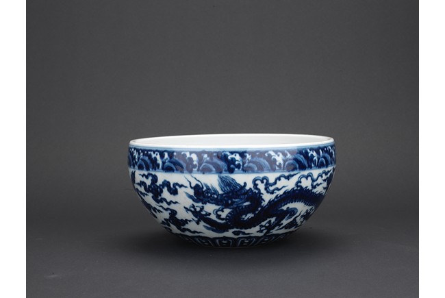 此鉢口微斂,弧腹,平底,胎體較厚,造型敦實。 (鉢是佛門盛貯器,明宣德時期皇帝崇信佛教。)所用青花色澤濃艷,色濃處有黑色鐵鏽斑顯現,是用進口蘇麻離青所致,通體青花裝飾,內壁潔白,施“大明宣德年制”雙圈青花楷書款。外壁從上至下依次繪海水紋、雲龍紋、蓮瓣紋,外底素胎無飾。龍的形狀、鬚髮和龍身的鱗片刻畫細緻。富鐵的鈷料使海水濃淺不一,且有暈散,如此波濤洶湧的海水更能映襯出龍的矯健。拍品造型敦實,紋飾生動,青花髮色鮮艷明麗,穩重古雅。