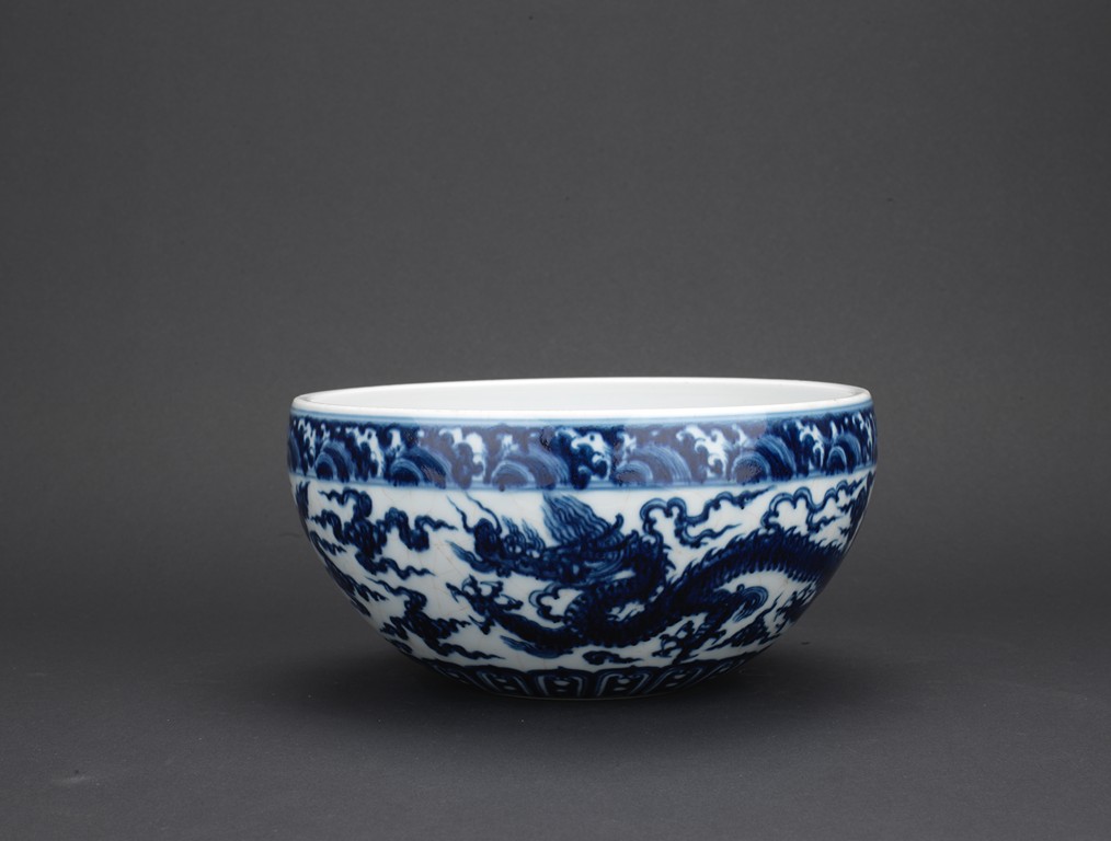 The deep rounded sides painted in cobalt blue on the exterior with two five-clawed striding dragons in mutual pursuit amidst clouds, all between a border of upright lotus petal lappets and a band of cresting waves, the interior with a double lines around the rim and a six-character mark in underglaze blue within a double circle at the base. Ming Dynasty period.
