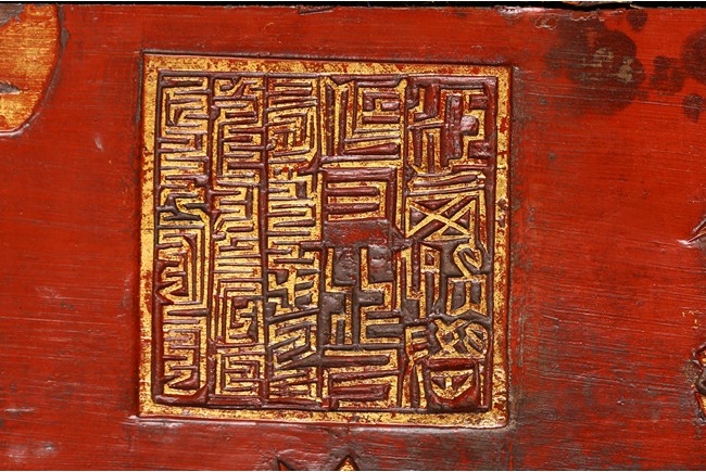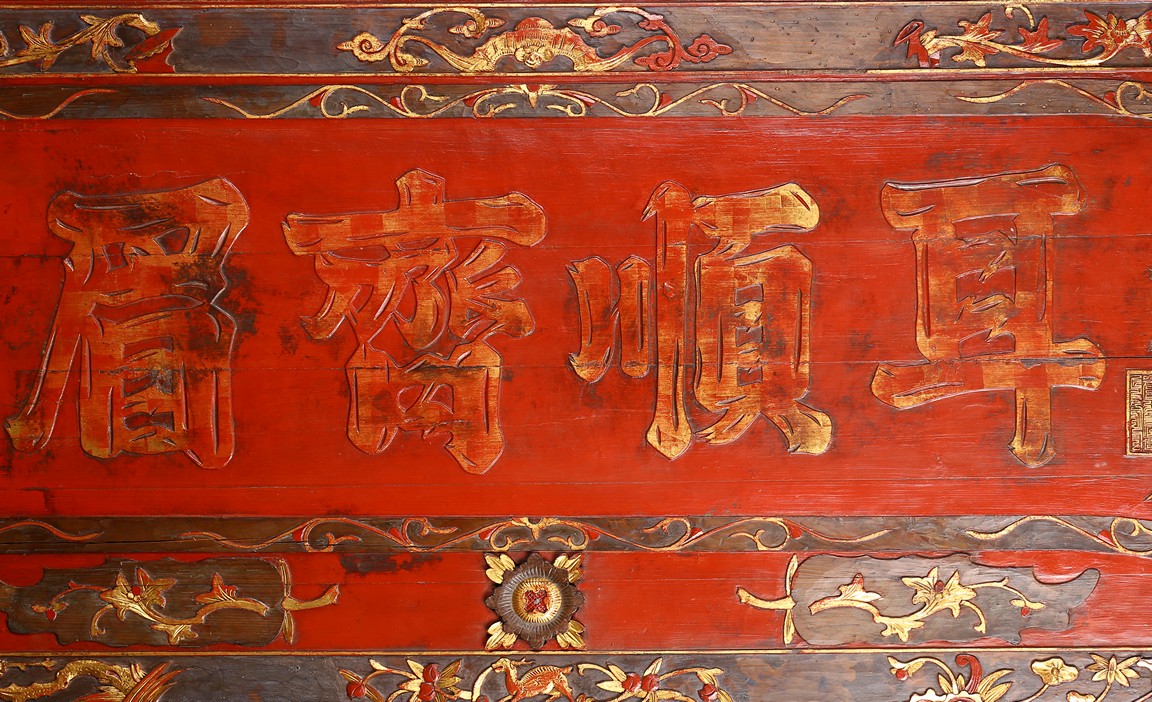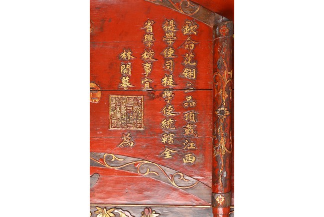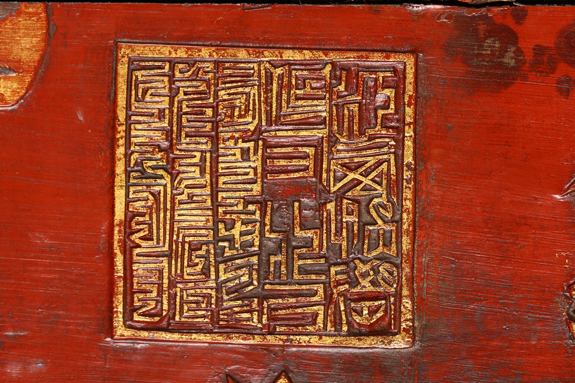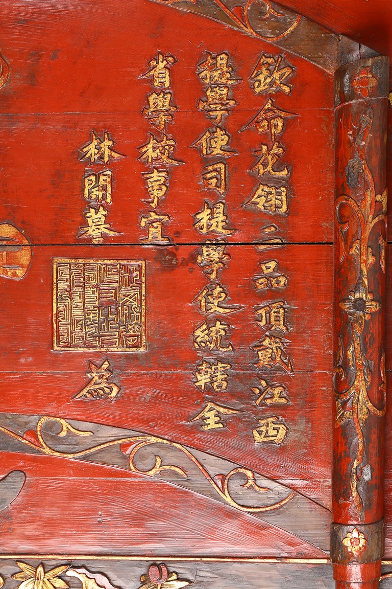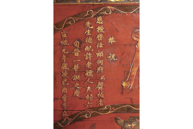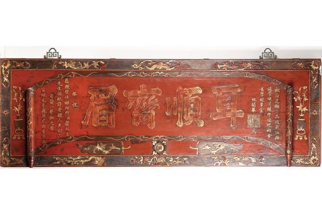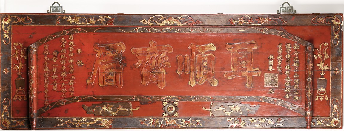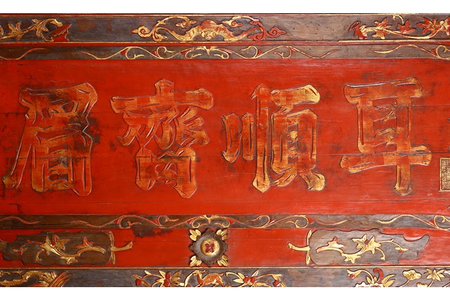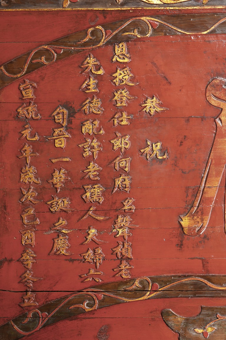 Of horizontal form, the panel carved in shallow relief with four large character reading 'er shun qi mei' and inscriptions dating to the first year of Xuantong reign, all reserved on red lacquer ground and framed with floral scroll border with traces of gilt paint. Qing Dynasty Xuantong period.