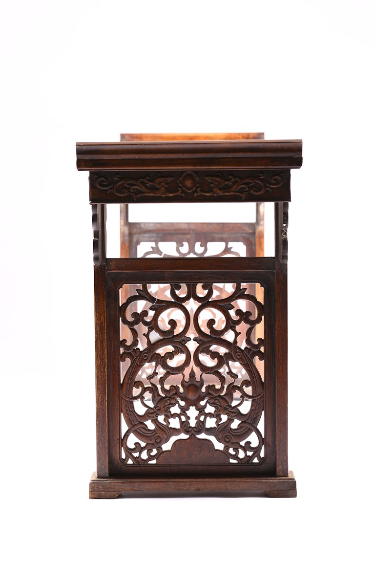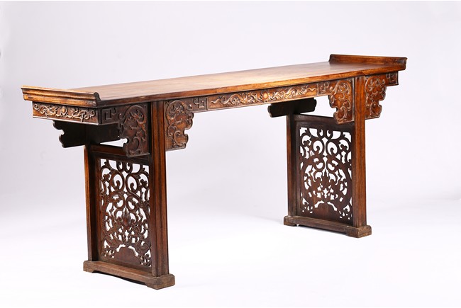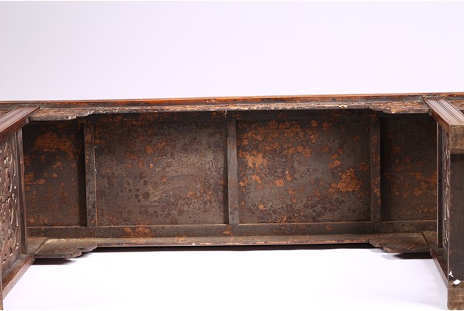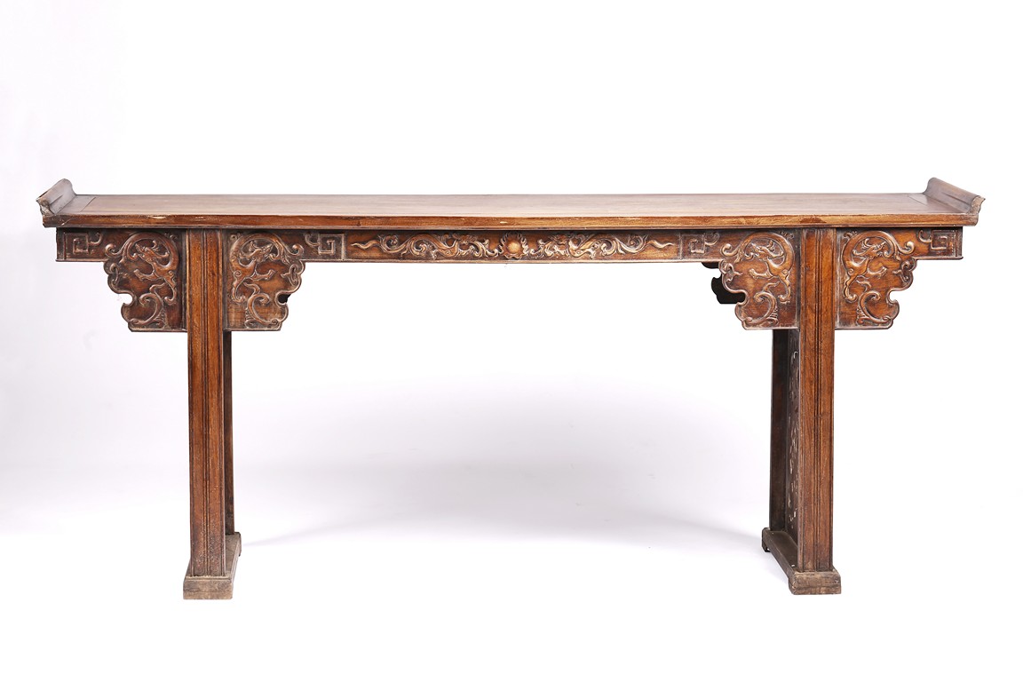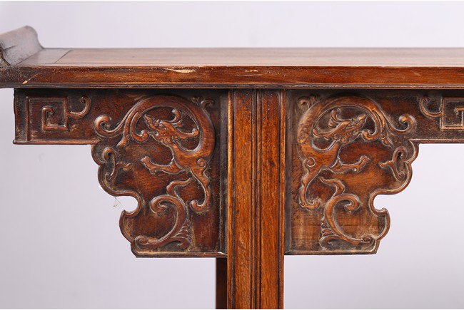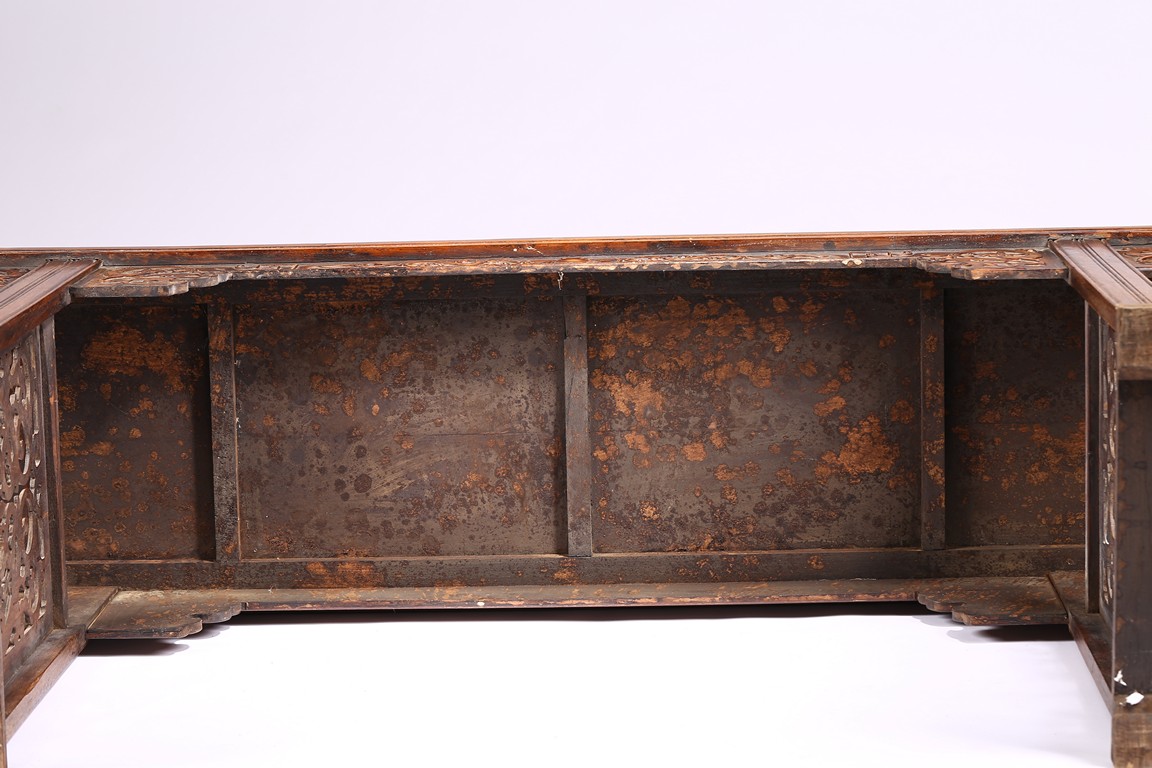 The Huanghuali paneled top terminating in everted flanges above an apron and spandrel carved in relief with sinuous chilong, the feet joined by square sectioned stretchers enclosing a rectangular openwork dragon panel.