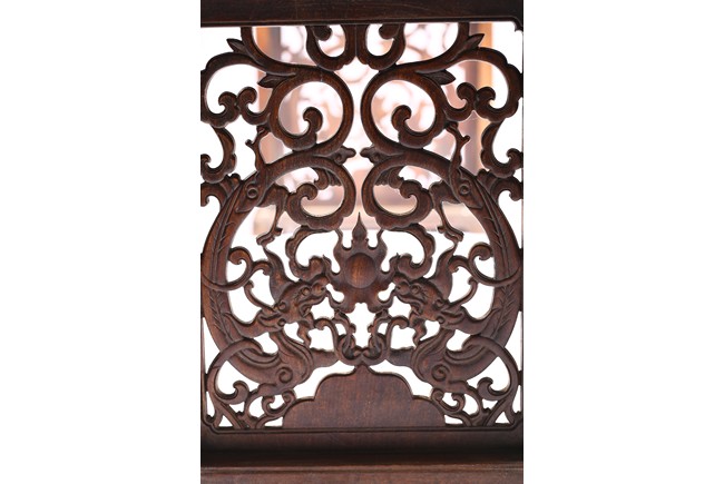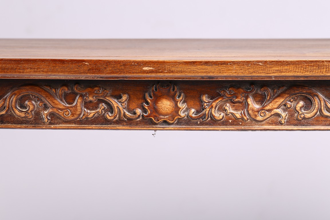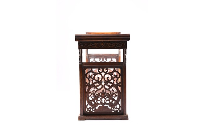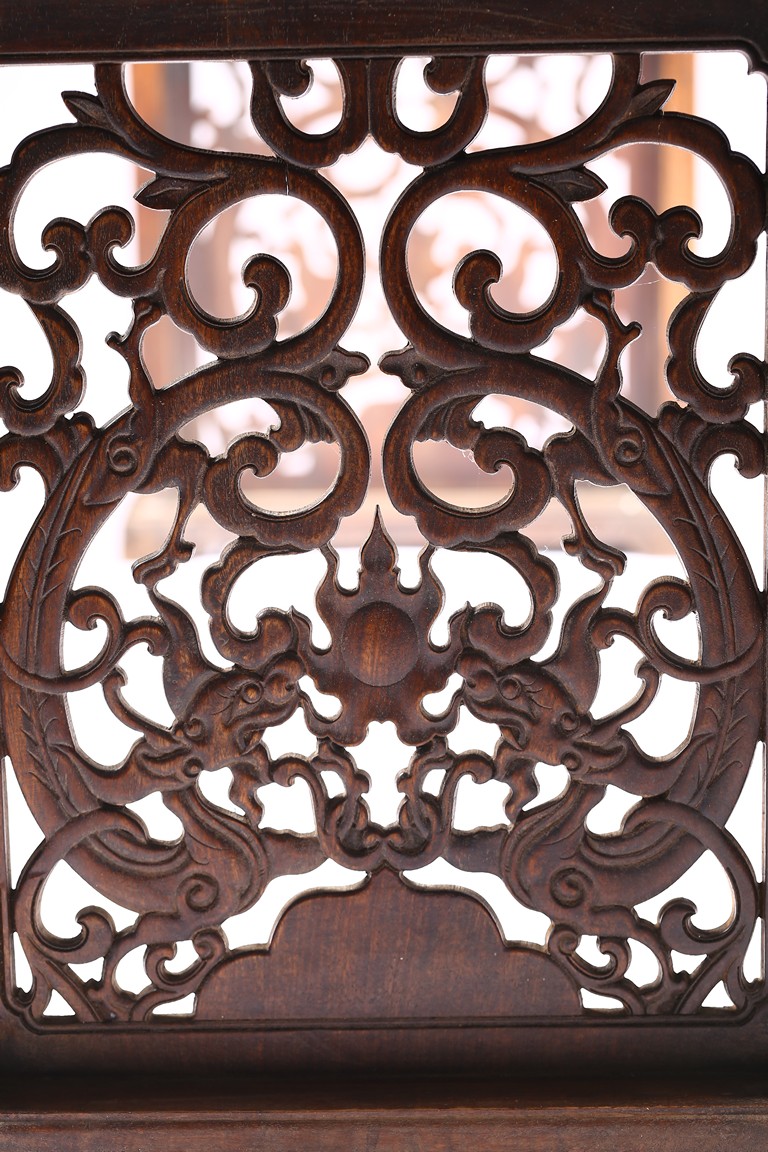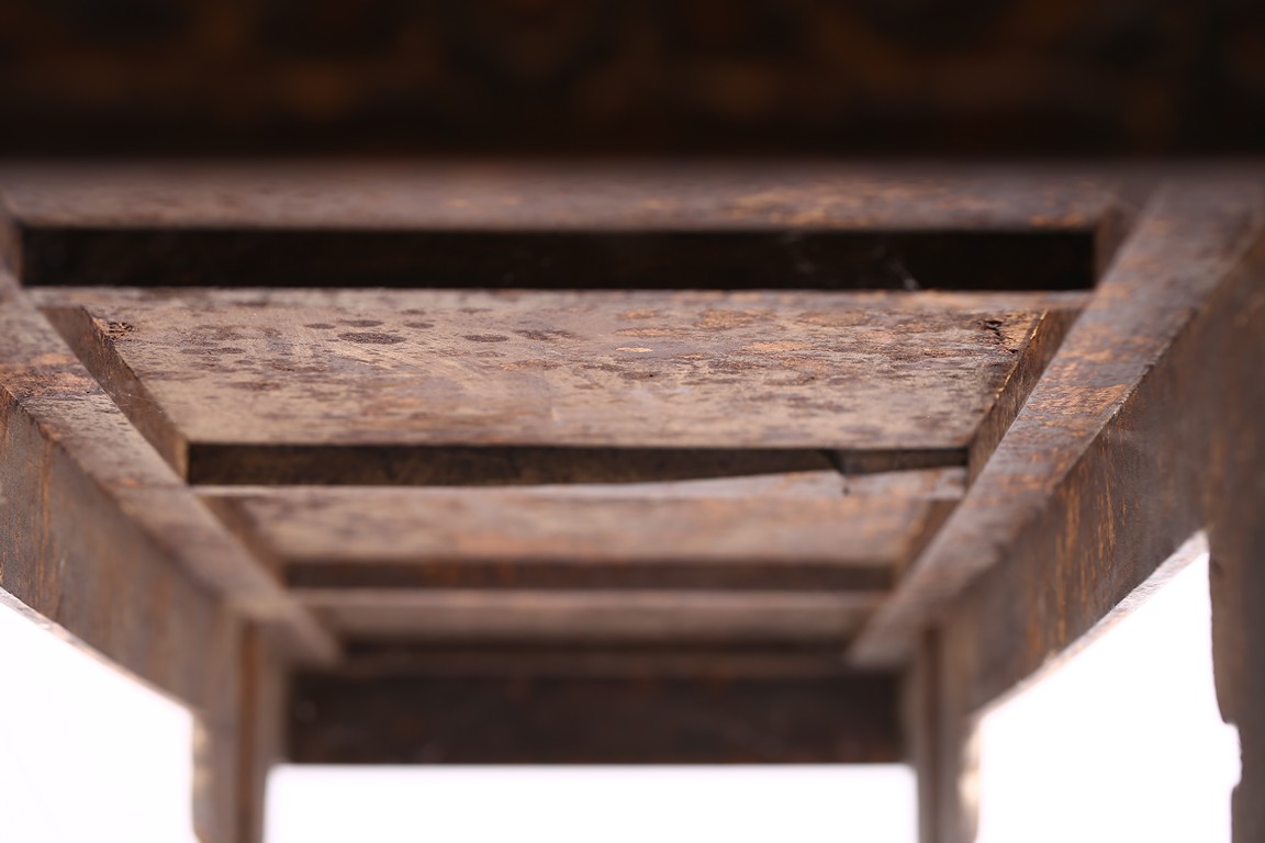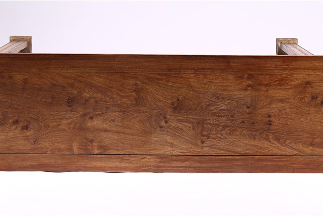 The Huanghuali paneled top terminating in everted flanges above an apron and spandrel carved in relief with sinuous chilong, the feet joined by square sectioned stretchers enclosing a rectangular openwork dragon panel.