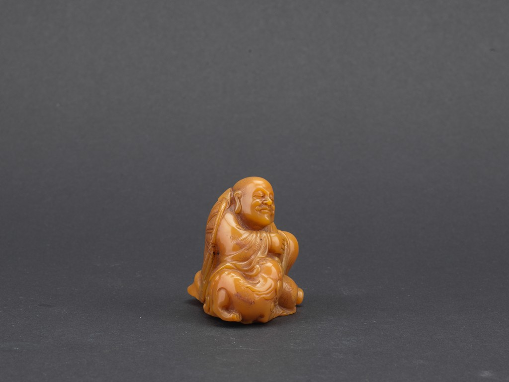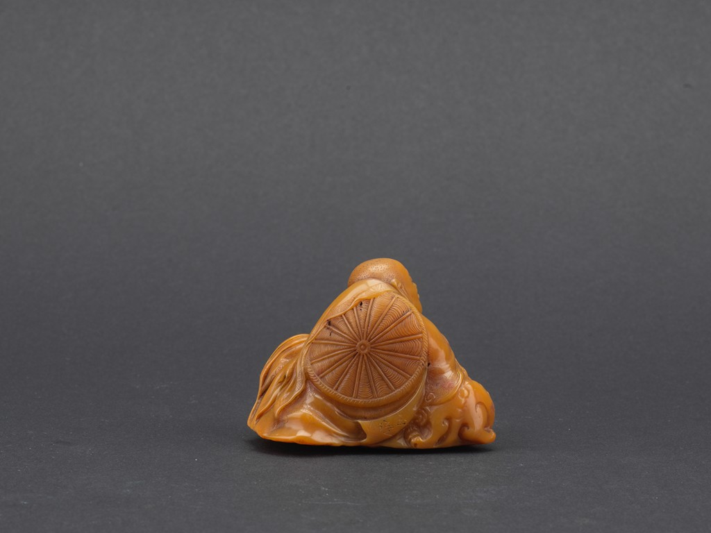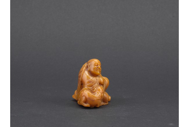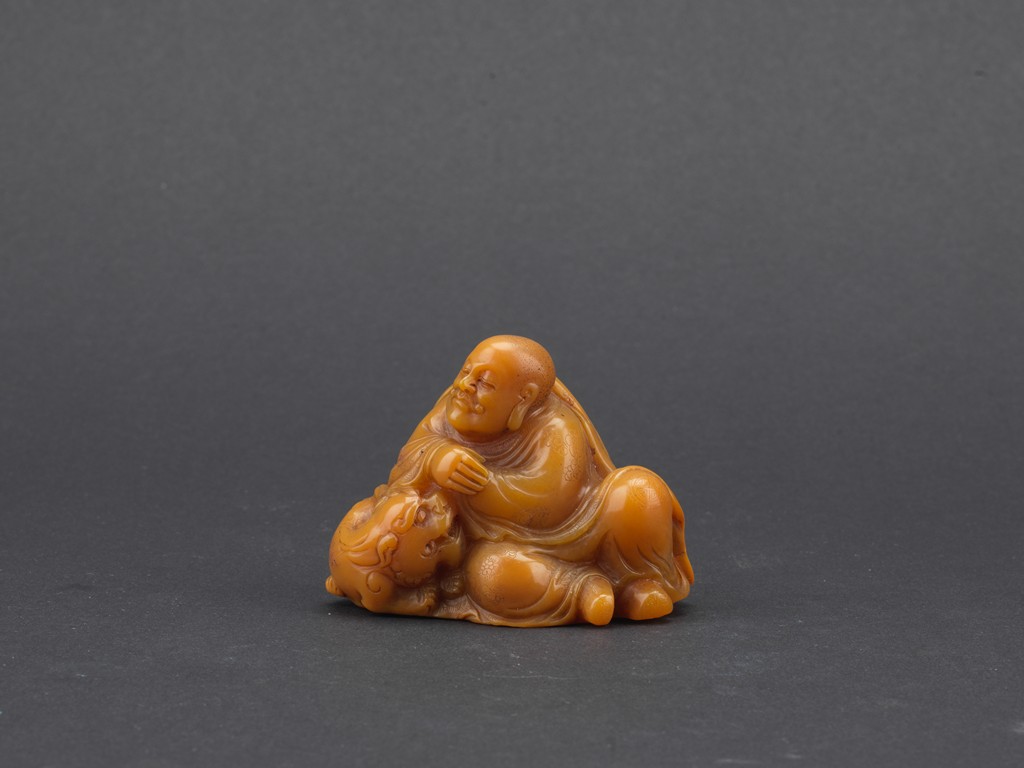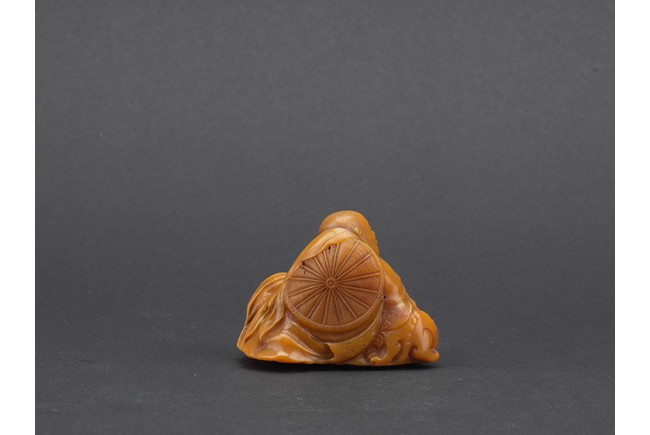 此尊羅漢取上等田黃石雕製而成,石材通體嬌黃瑩潤,色澤統一而質感凝結油潤。圓雕伏虎羅漢,寬容豐容,神態安逸肅穆,發相莊嚴,斜身倚靠在老虎之上。身著寬領袈裟,衣帶飄逸極富動感,羅漢神形並茂。落“玉璇”款識。楊玉璇是明末清初首屈一指的工藝美術家,技藝高超,曾在康熙初年供奉內廷。