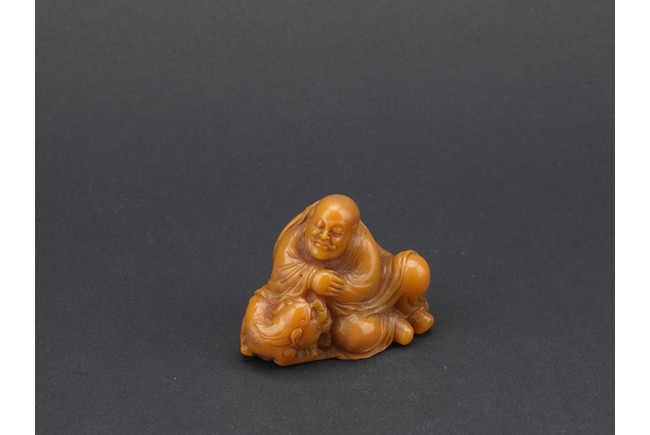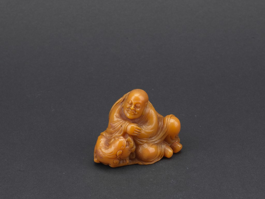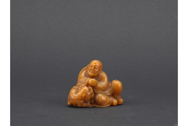 Finely carved as an arhat figure leaning against a tiger, his face rendered in an meditative expression, wearing loose robe with elegant folds, wearing a large hat on his back, carved with two character inscription Yu Xuan. Qing Dynasty period.
