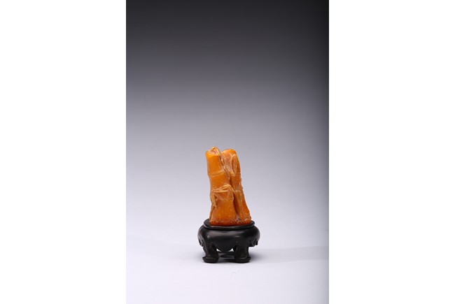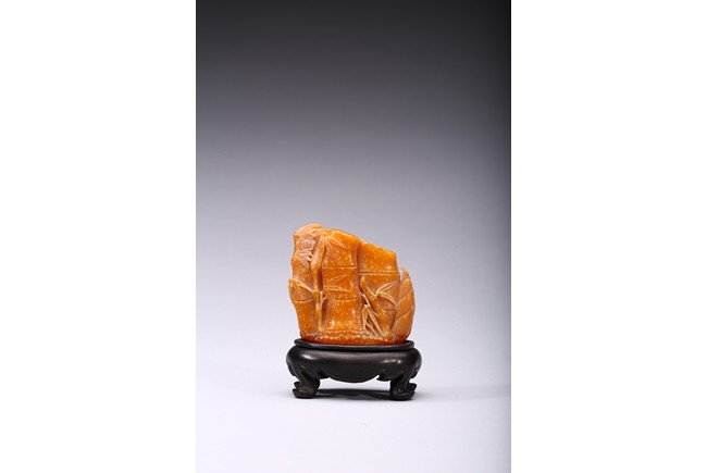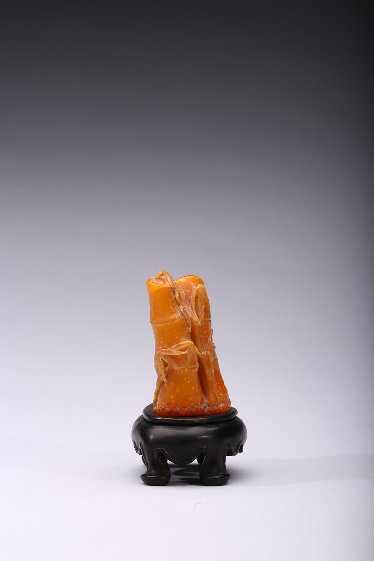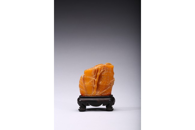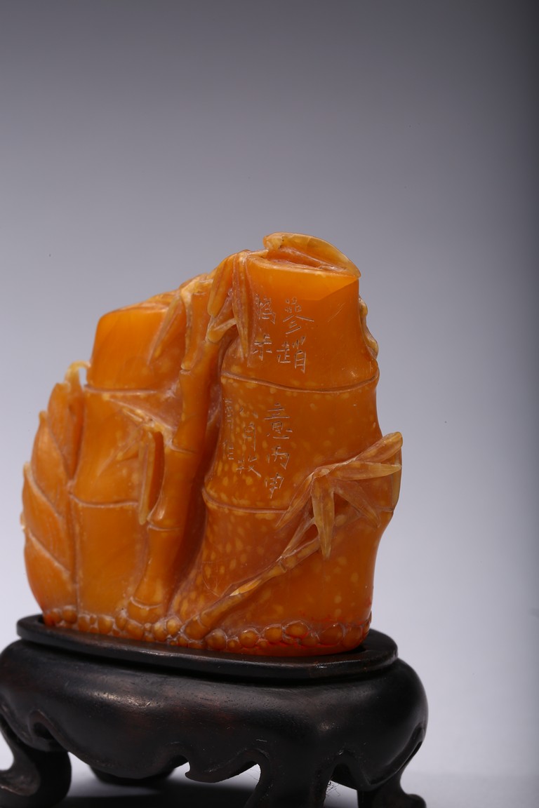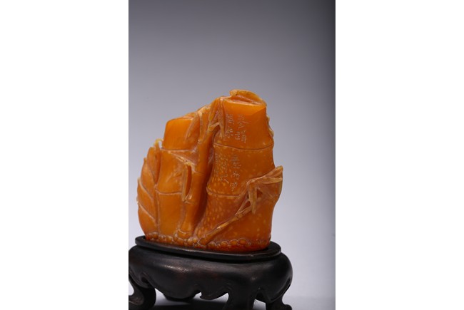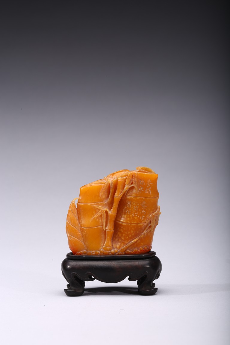 Carved naturalistically in the form of a cluster of bamboo stems and groves, carved on one side inscription and signed Mu Fu, the seal face carved with four character inscription. The smoothly polished stone of a warm caramel-brown color, wood stand. 19th Century