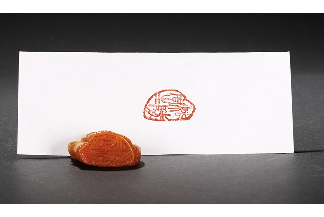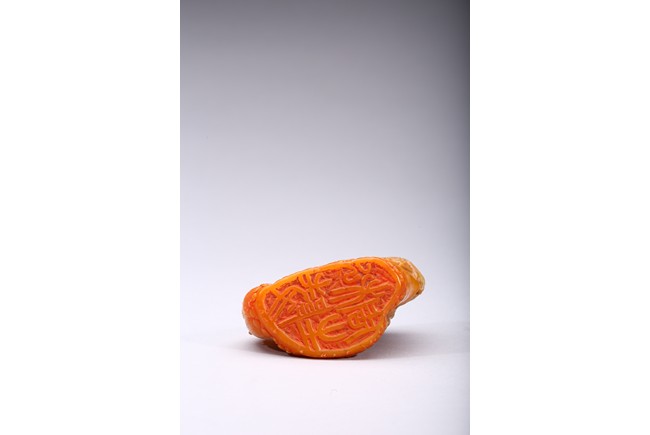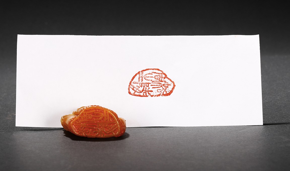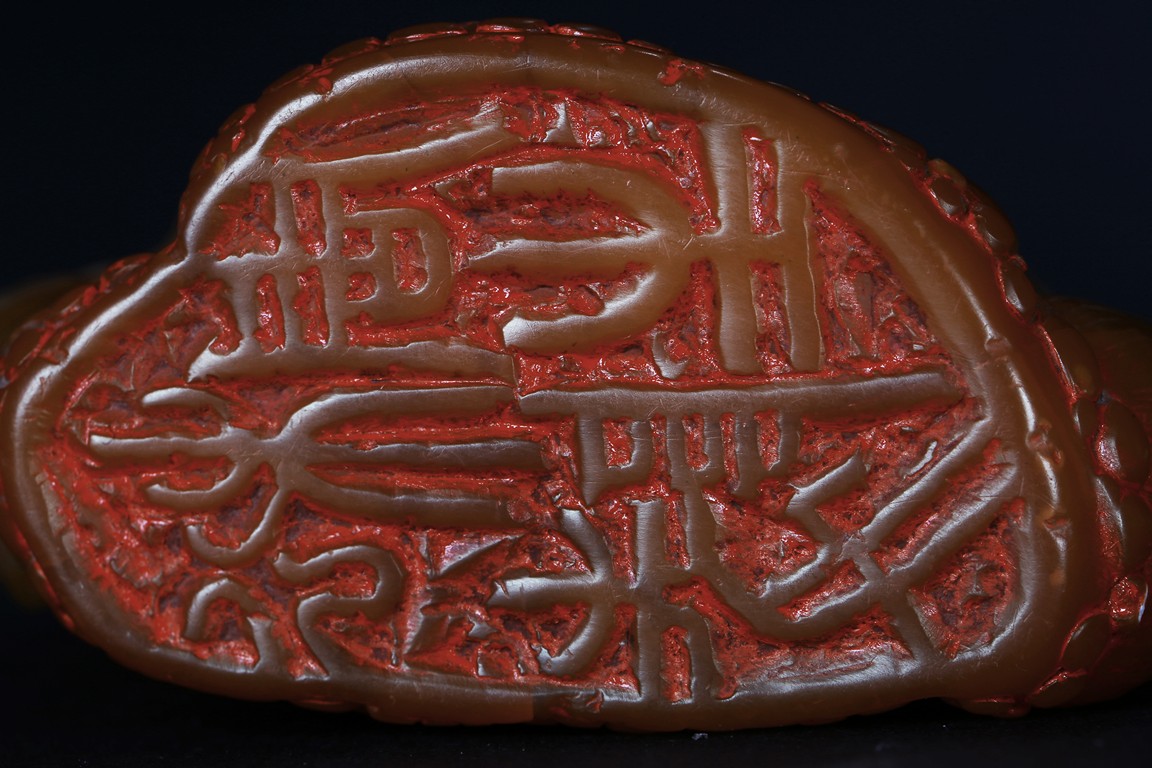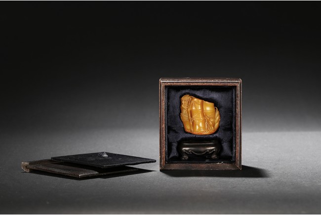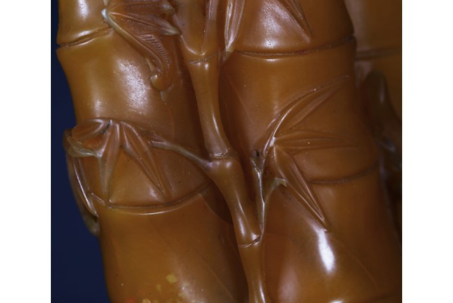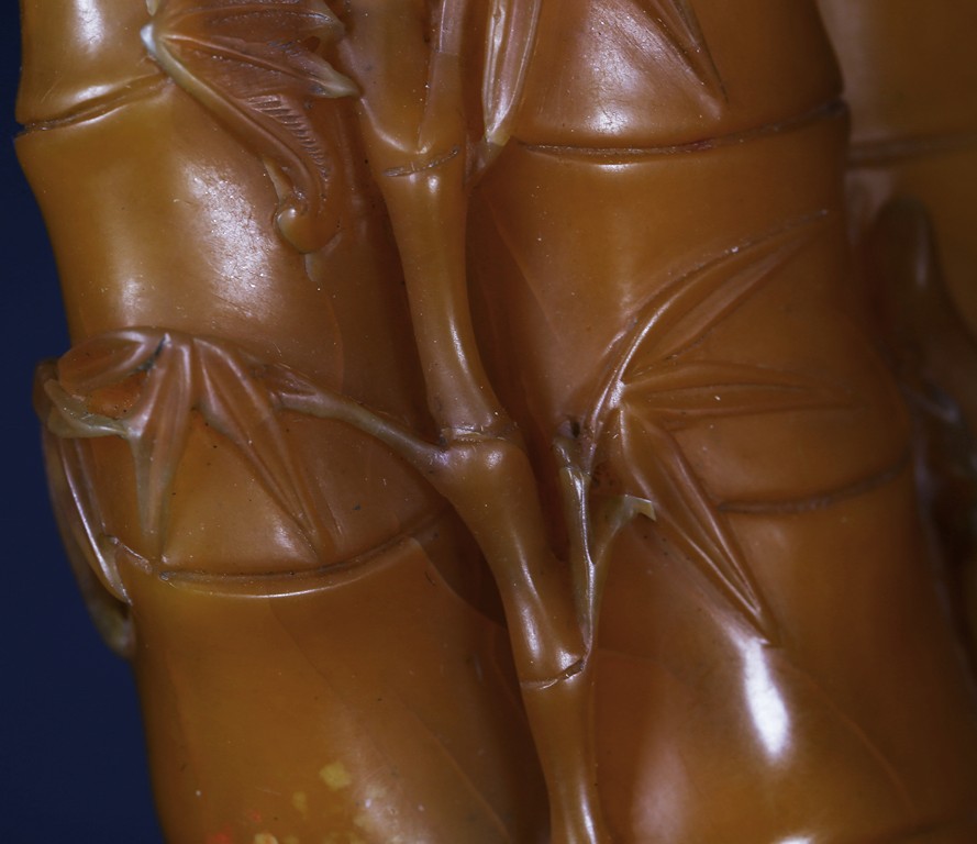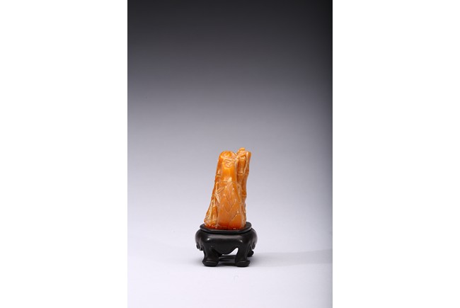 Carved naturalistically in the form of a cluster of bamboo stems and groves, carved on one side inscription and signed Mu Fu, the seal face carved with four character inscription. The smoothly polished stone of a warm caramel-brown color, wood stand. 19th Century