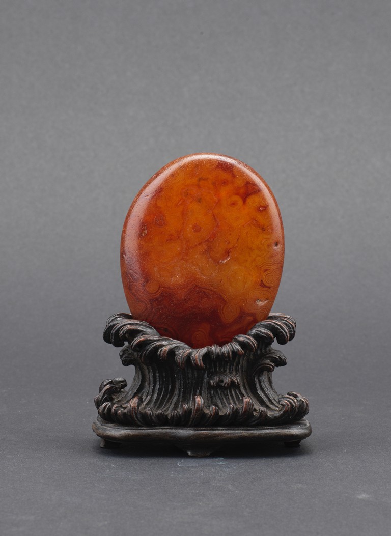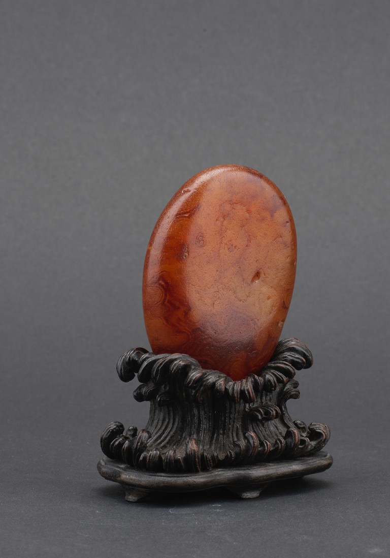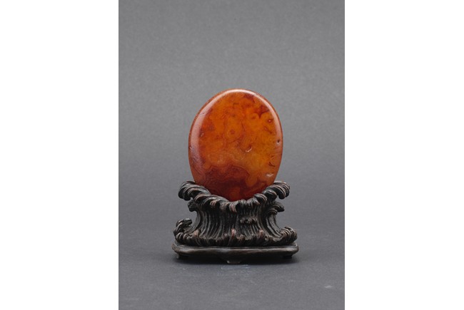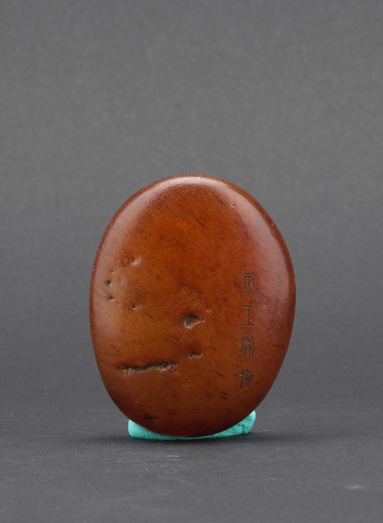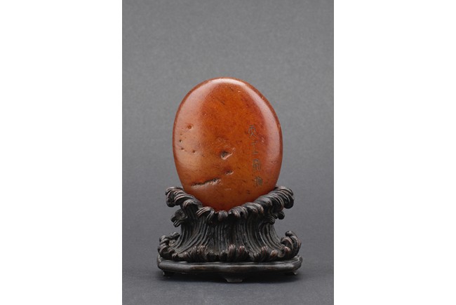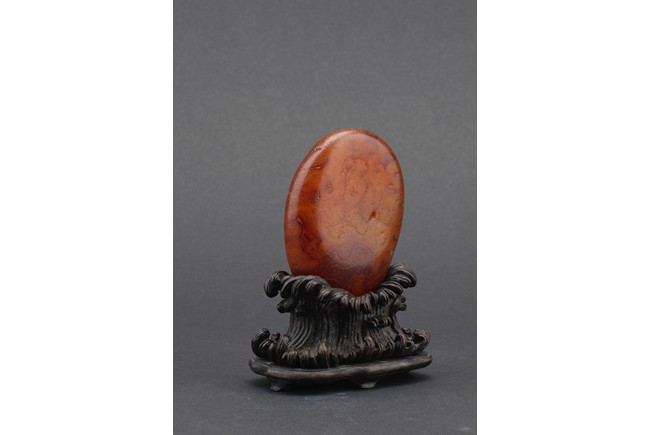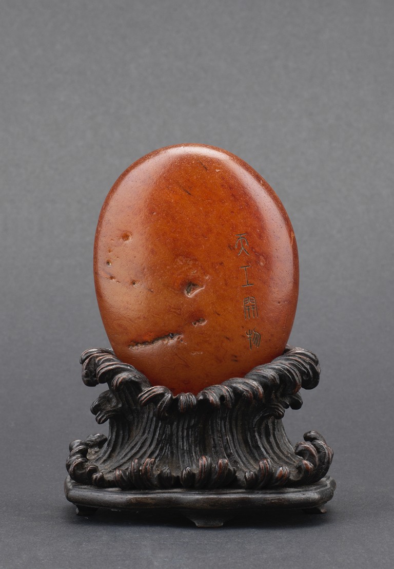 Of naturalistic pebble form, the agate stone incised with a four character inscription 'Tian Gong Kai Wu' in seal script, the stone is of translucent amber brown tone, all supported on a zitan stand.