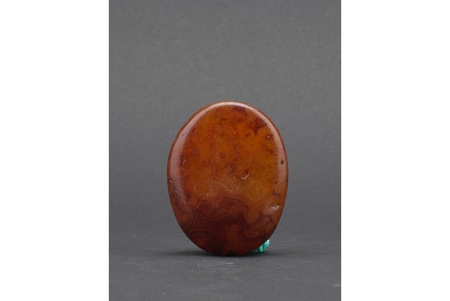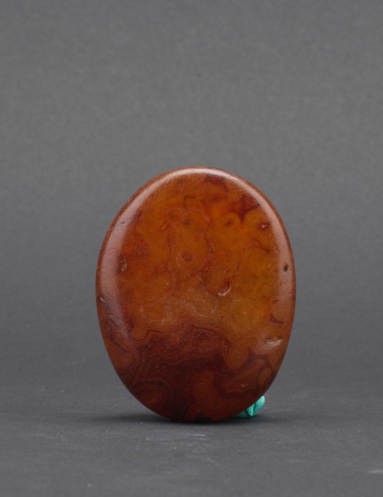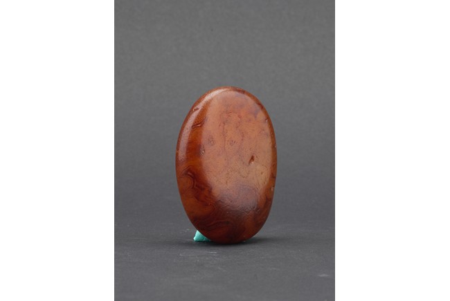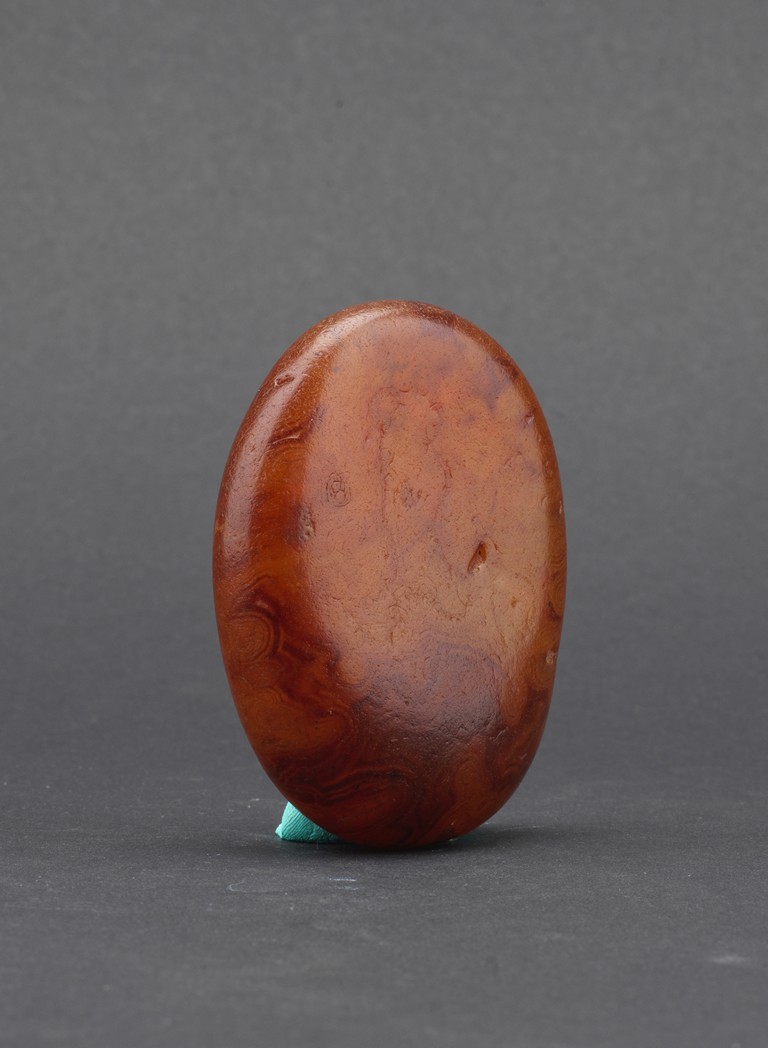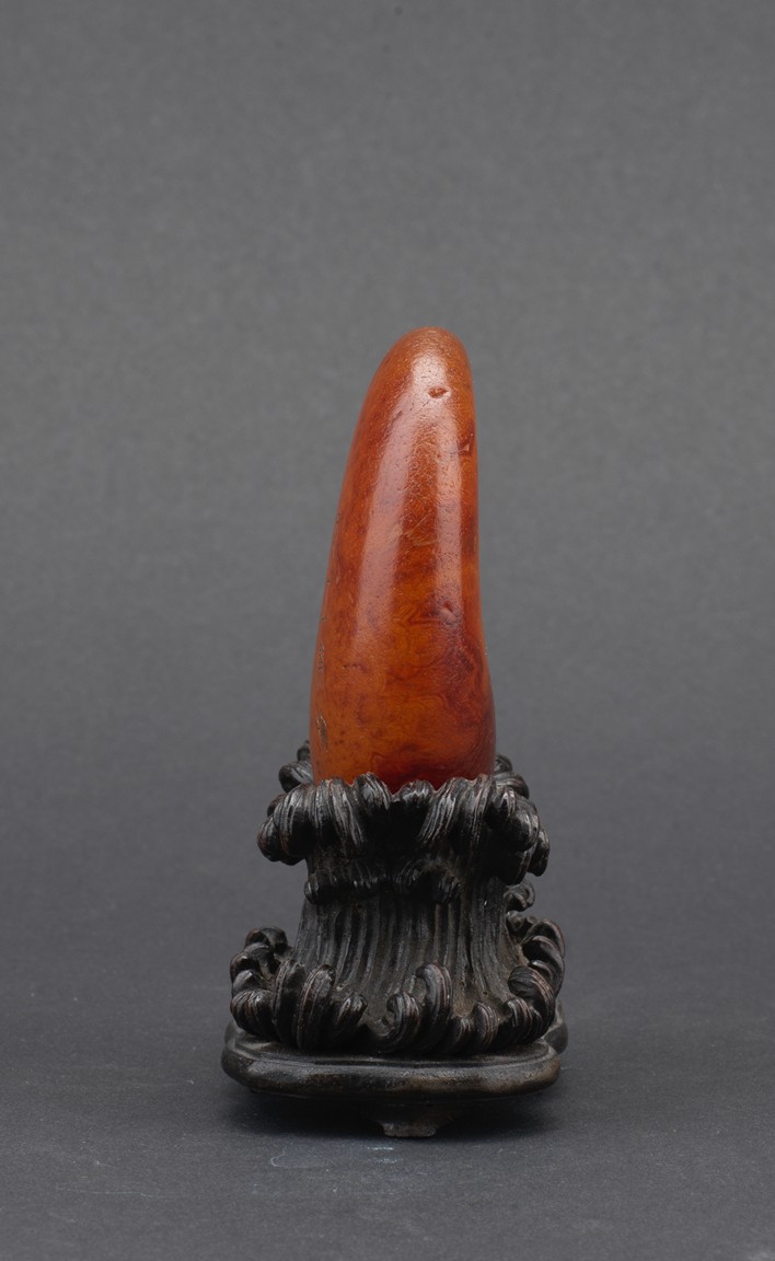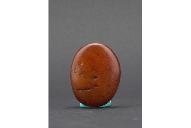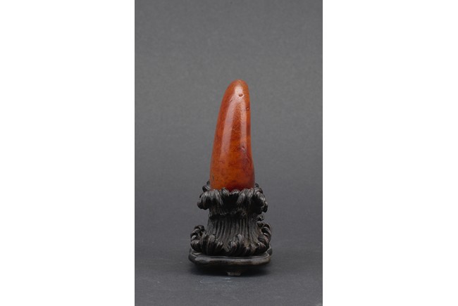 Of naturalistic pebble form, the agate stone incised with a four character inscription 'Tian Gong Kai Wu' in seal script, the stone is of translucent amber brown tone, all supported on a zitan stand.