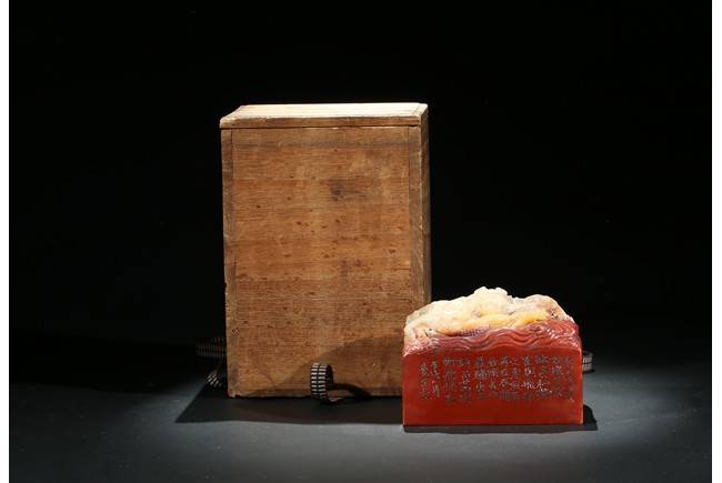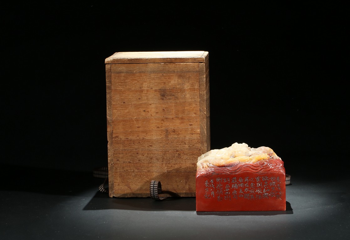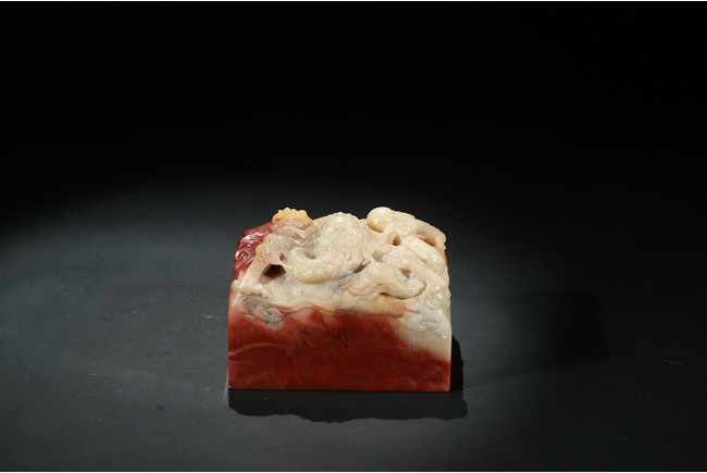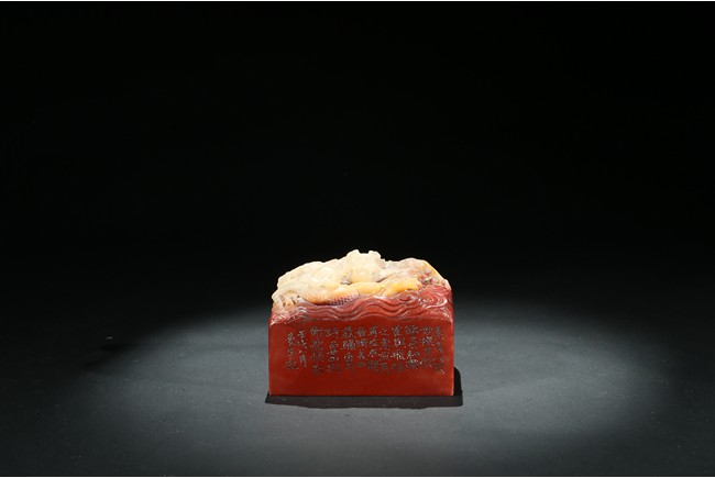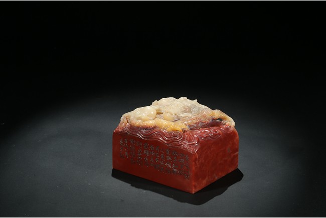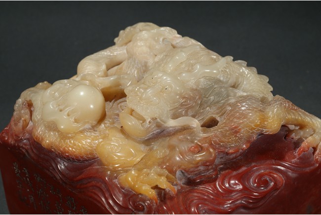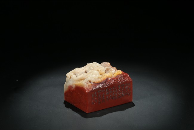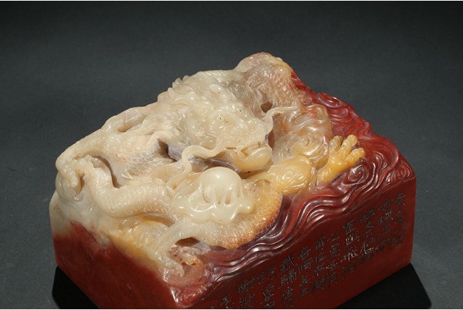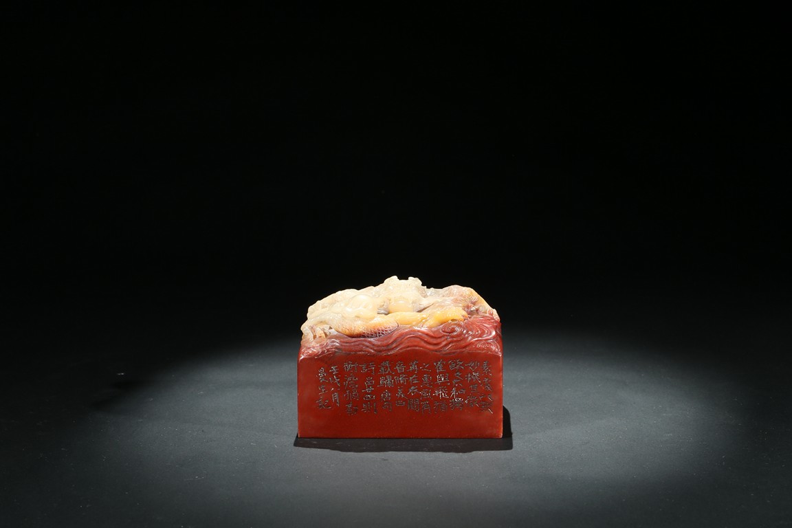 此印章用精巧細膩的手法,雕刻了栩栩如生的海水龍紋。龍栩栩如生,威猛驚人。其運刀之神妙、磅礴盡致、堪稱一絕。周身刻詩文,底部又有印文。壽山石材材質緻密溫潤,為壽山月洋上洞所產紅花芙蓉石,色彩明艷亮麗,質地油凝潤澤,極具脂玉感。