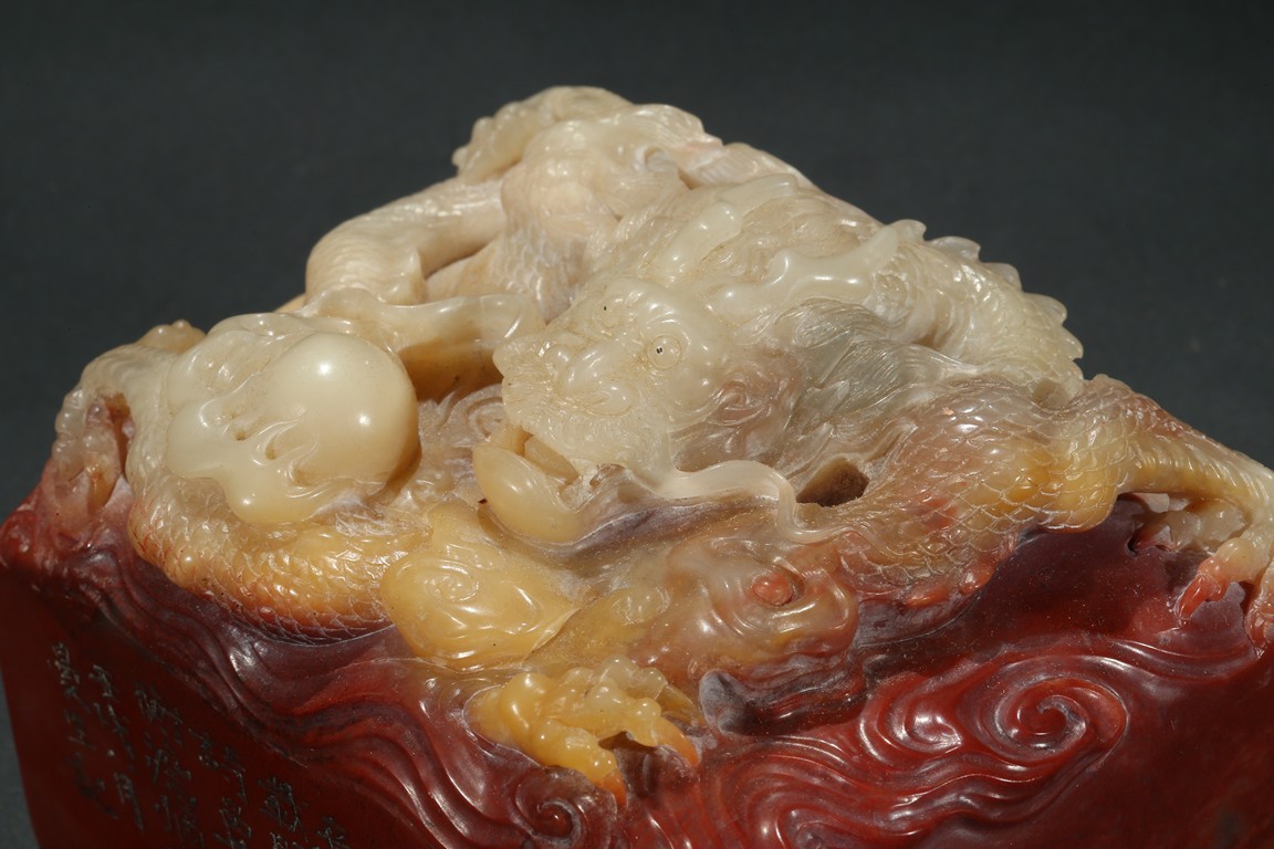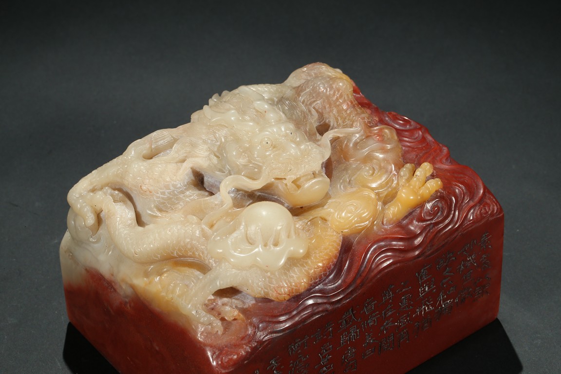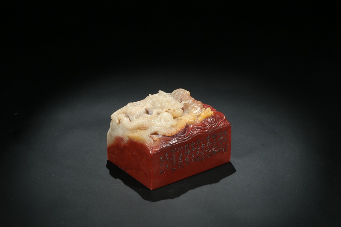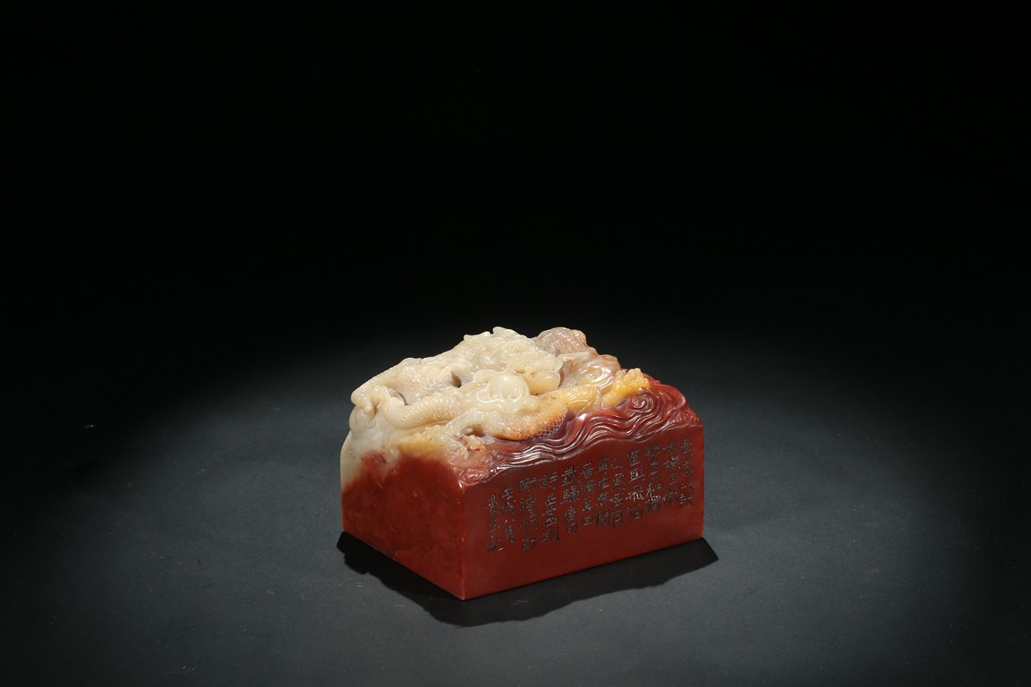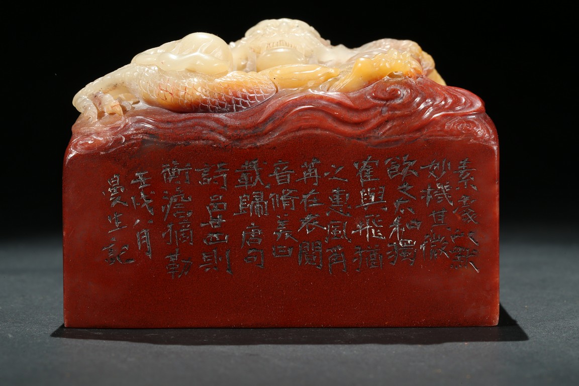 Of square section, the top carved in relief with a dragon in pursuit of flaming pearl within auspicious clouds, the side carved with poetic inscriptions signed Man Sheng, the seal surface carved with five rows of inscriptions, the stone is of bi-color tone of cinnabar red and milky-beige tone. Qing Dynasty period.
