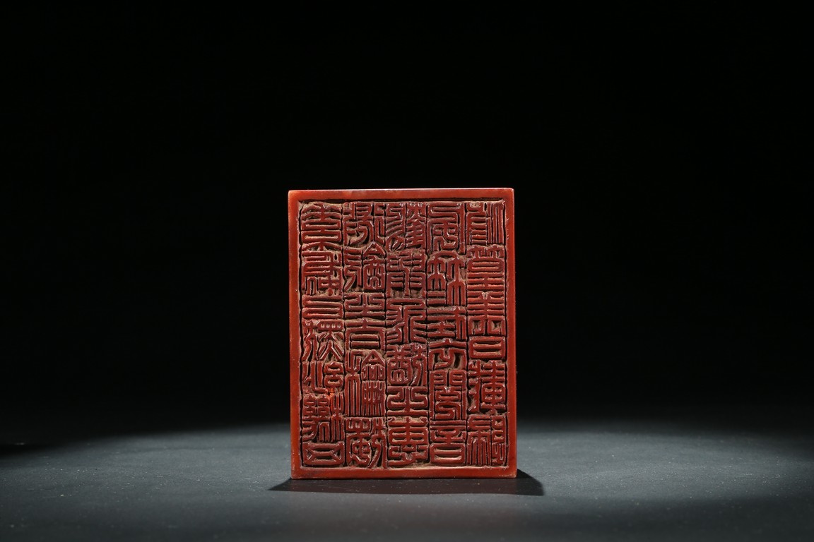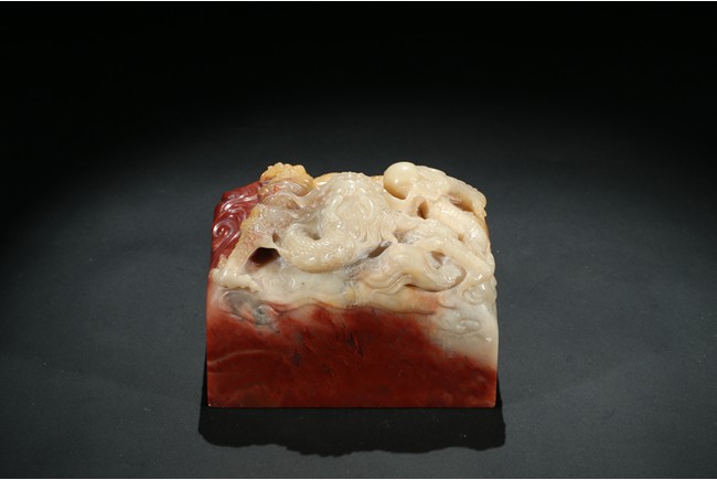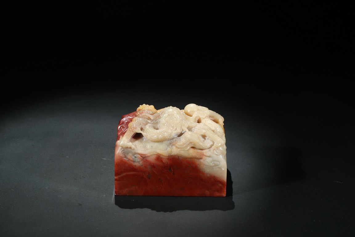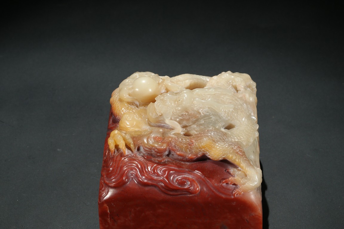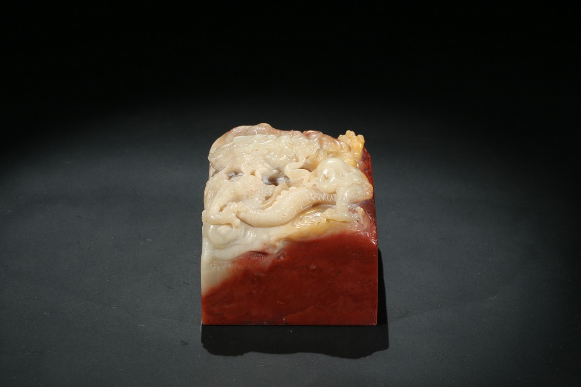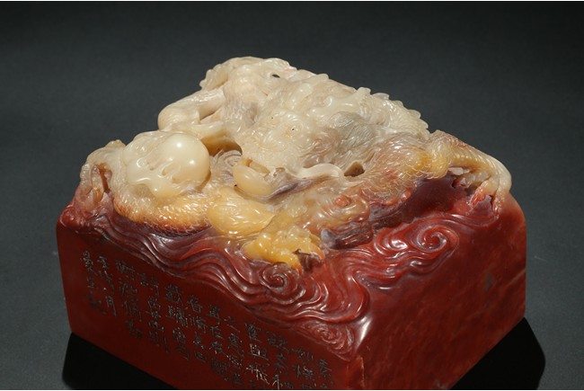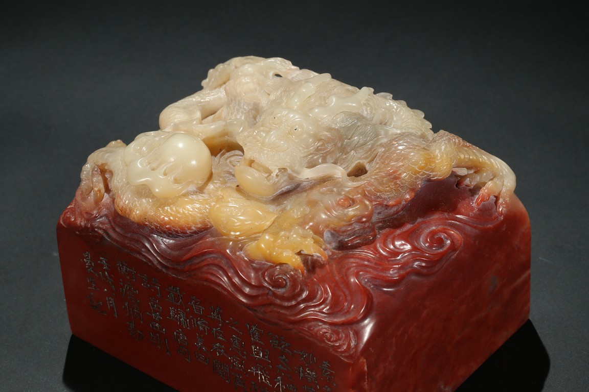 Of square section, the top carved in relief with a dragon in pursuit of flaming pearl within auspicious clouds, the side carved with poetic inscriptions signed Man Sheng, the seal surface carved with five rows of inscriptions, the stone is of bi-color tone of cinnabar red and milky-beige tone. Qing Dynasty period.