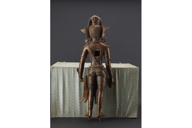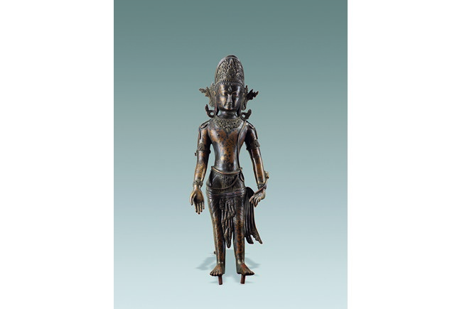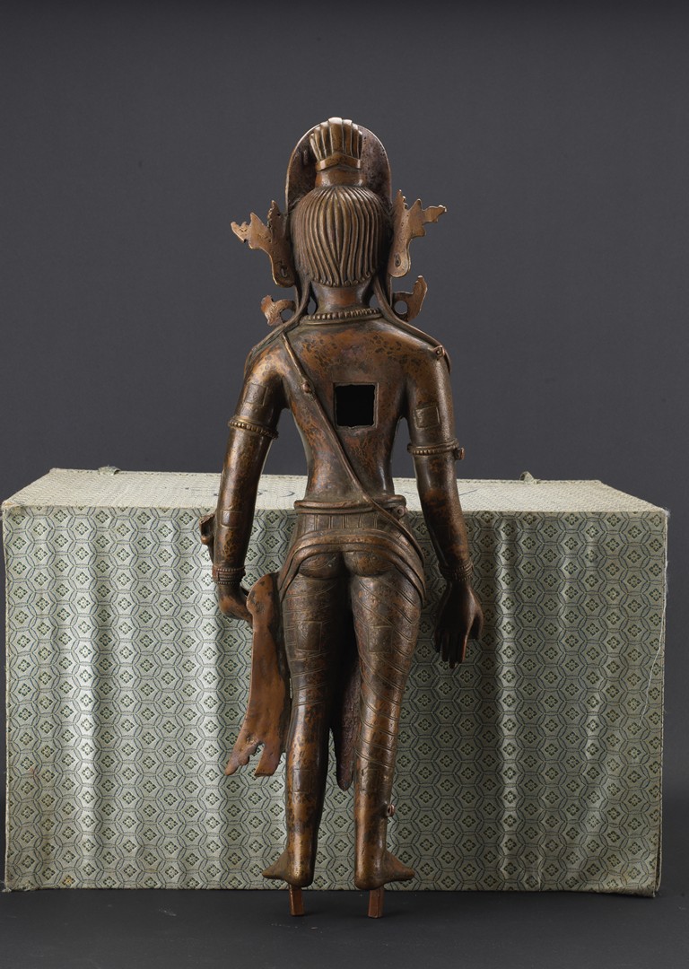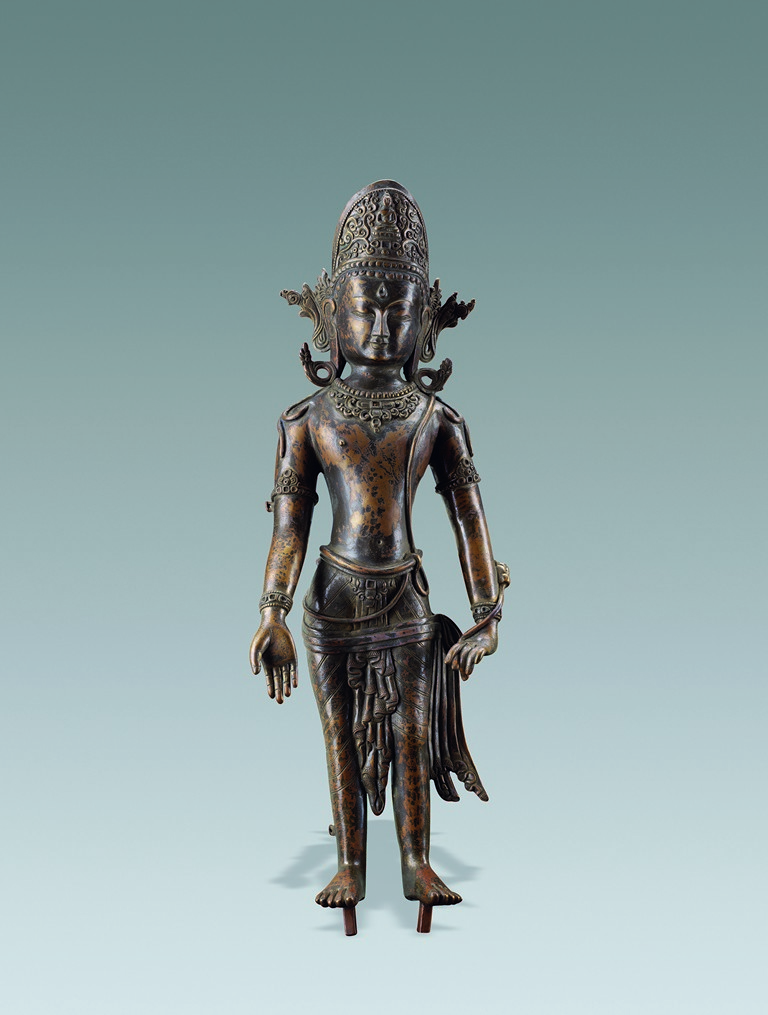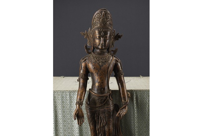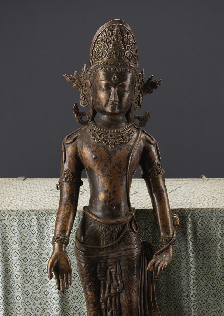 此尊佛像用精煉合金銅製造而成,為具有尼泊爾造像風格的觀音站像,為藏傳佛教崇奉的十六供養觀音之一。觀音頭戴寶冠,頭頂束高發鬃,大耳垂肩,耳下垂圓形耳環。面部方圓,眉眼略上挑,鼻樑高挺,小嘴如櫻桃,面容端莊秀雅,神態寧靜祥和。上身袒露,頸部佩戴寶石珠鍊,下身穿裙式衣飾。整體結構勻稱,造型生動,形象莊嚴。在佛像收藏中具有尚佳品質。