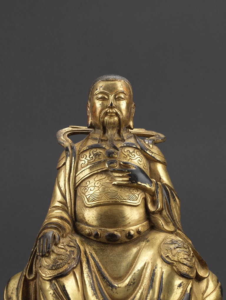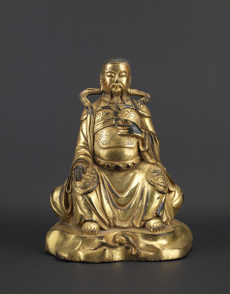 Cast seated with his right hand resting on his knees and his left hand in front of chest, his long robes adorned with clouds and ocean at his abdomen falling to voluminous folds around his arms and to his bare feet, his long neatly combed hair swept back behind his shoulders and falling towards his waist, revealing his serene face. Early Qing Dynasty period.