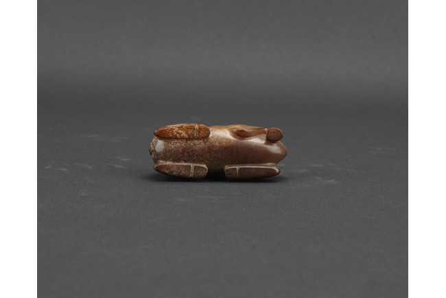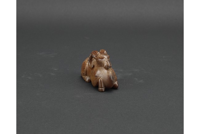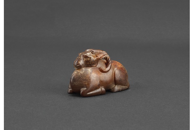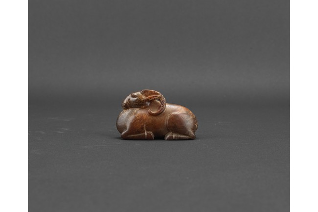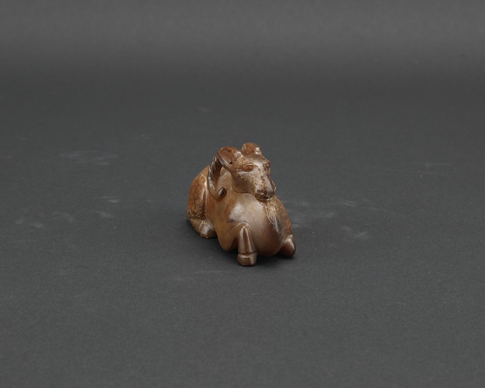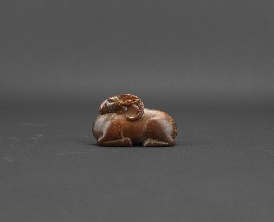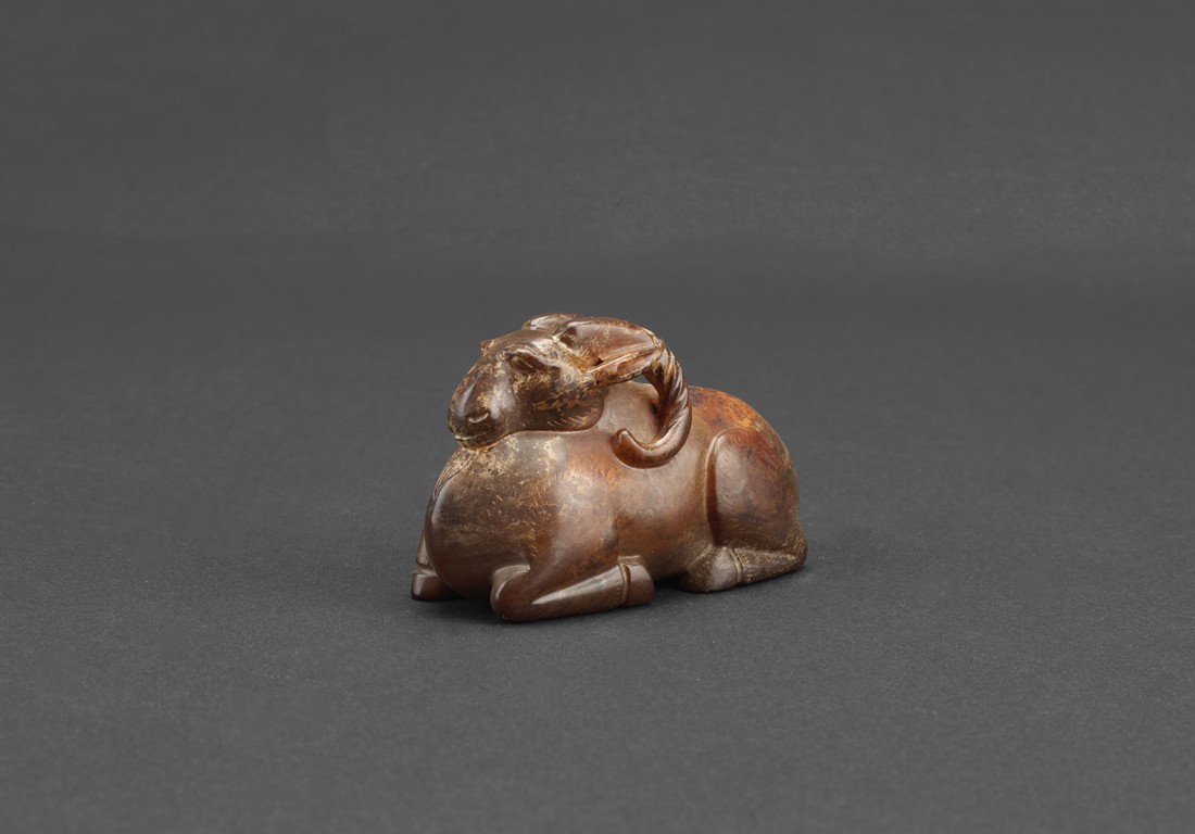 Carved resting upon its tucked-in hind legs and kneeling forelegs, its head facing forward and its long ridged horns curling over its shoulders, the stone of opaque mottled dark black and reddish russet tone. Han Dynasty period.