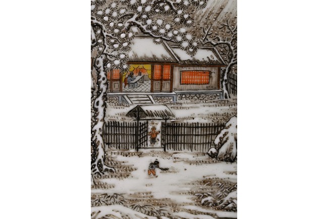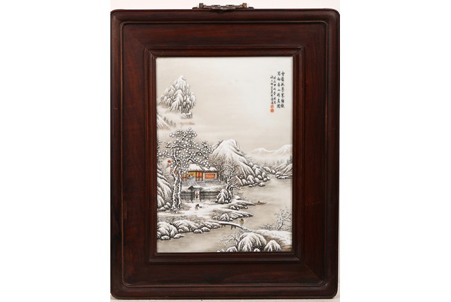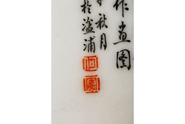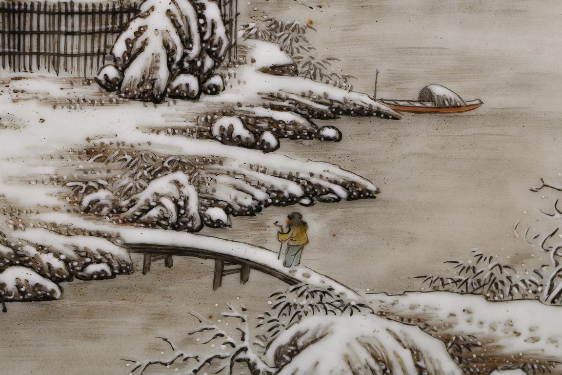 This finely porcelain made painting depicts a riverside mountain landscape of residence surrounded by mountains and trees,detailed with a small bridge crossing the river. Inscribed and signed, with two seals of the artist.