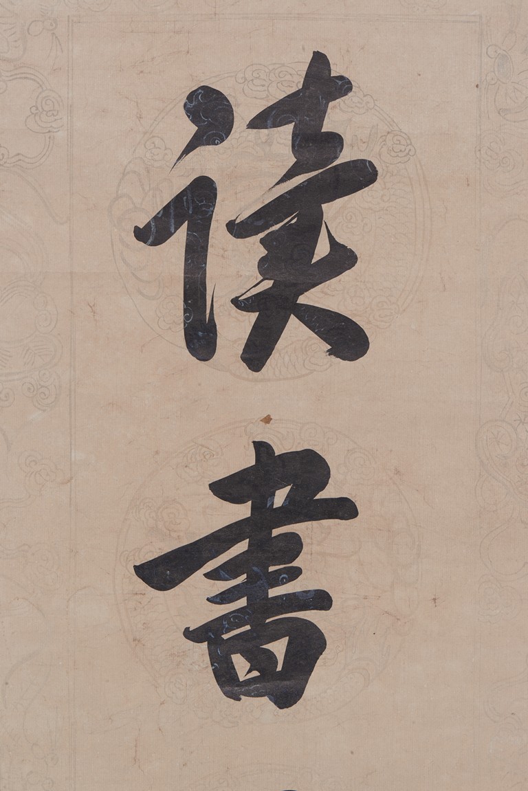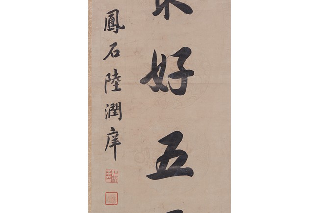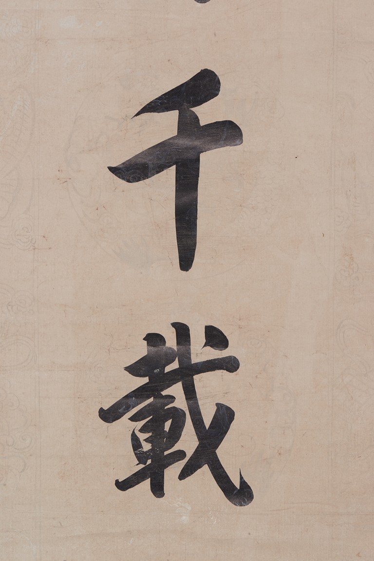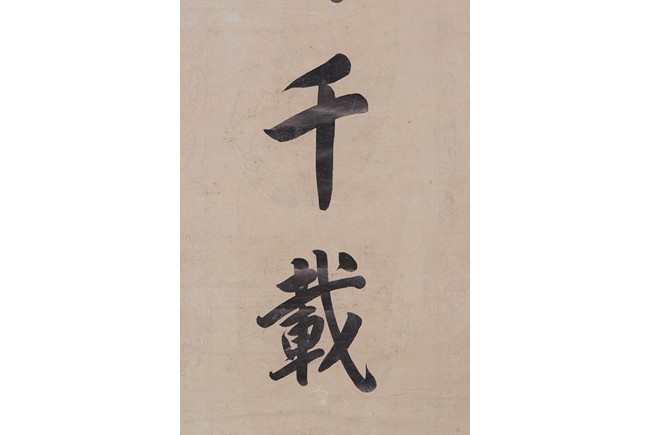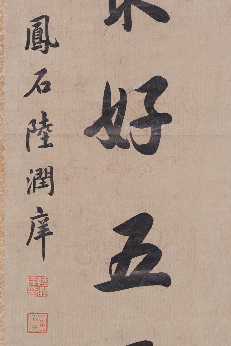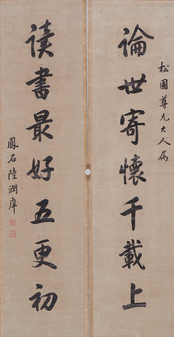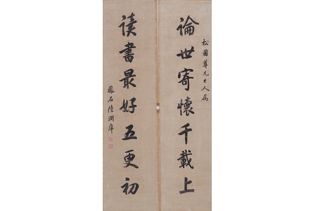 Ink on paper. Seven-character Regular script calligraphy couplet. Hanging scroll. Inscribed and signed, with two seals of the artist.