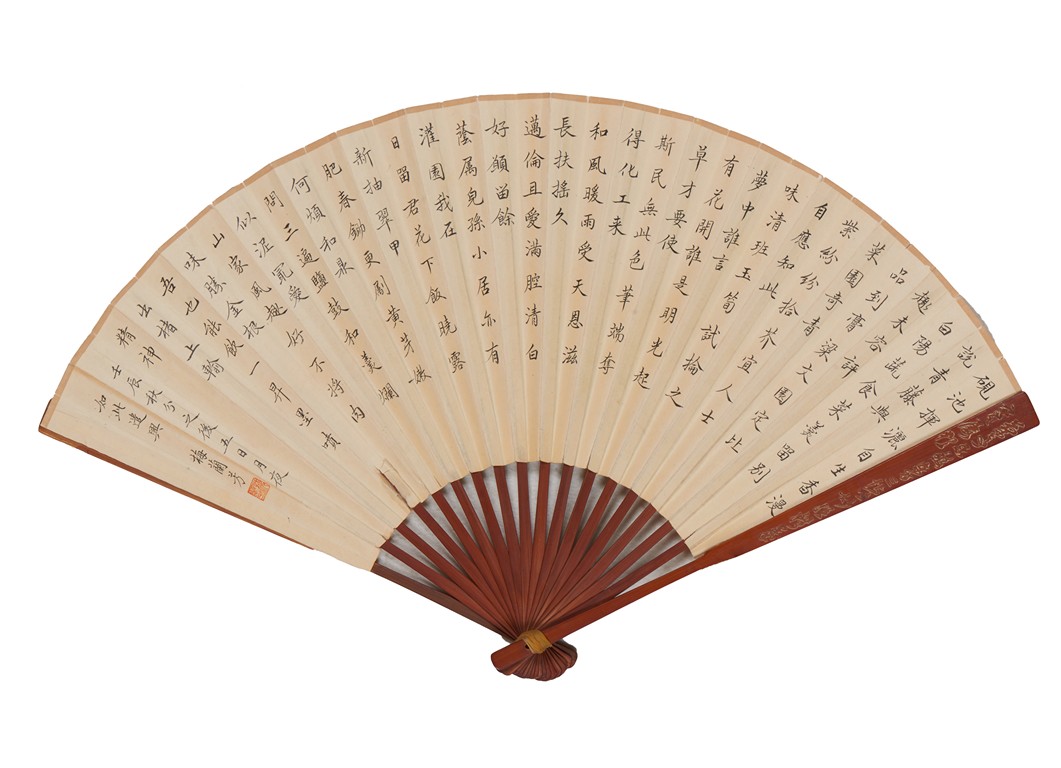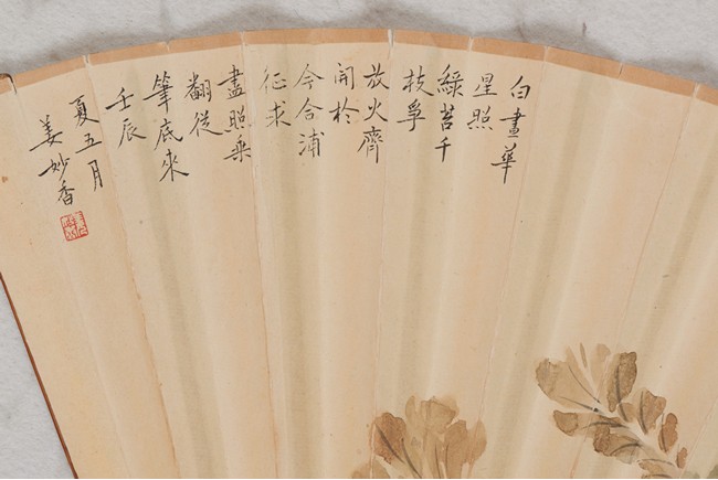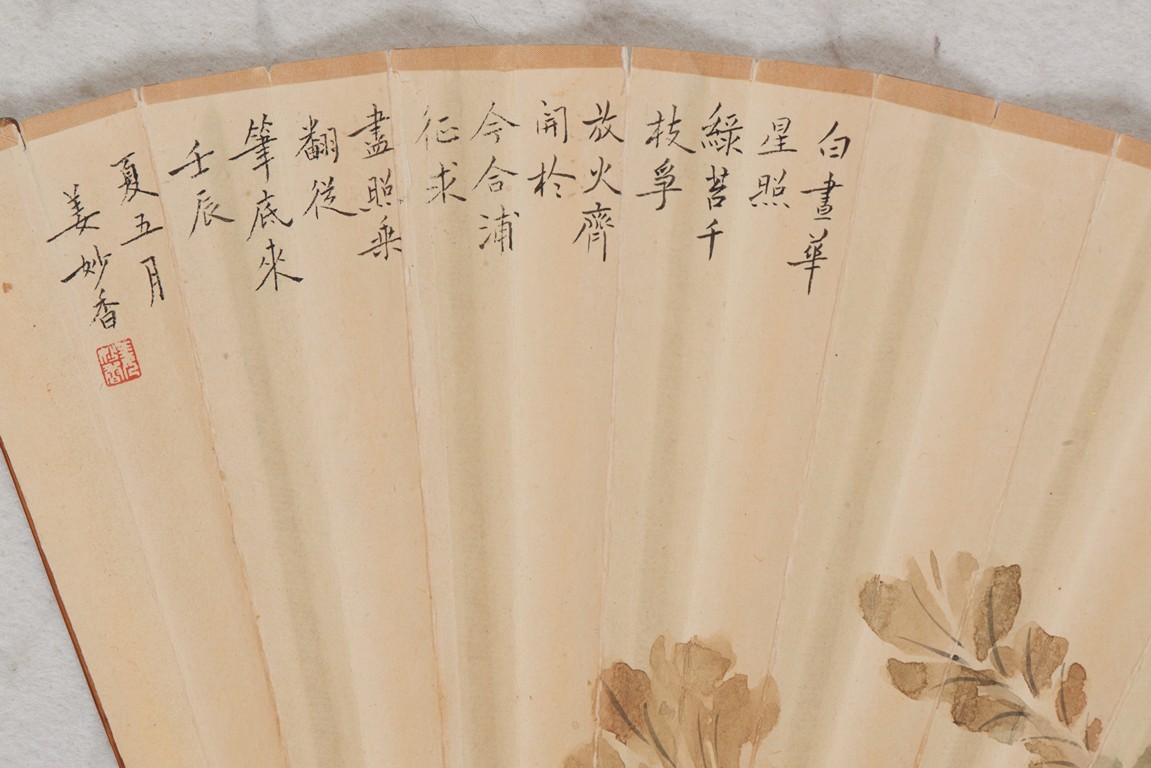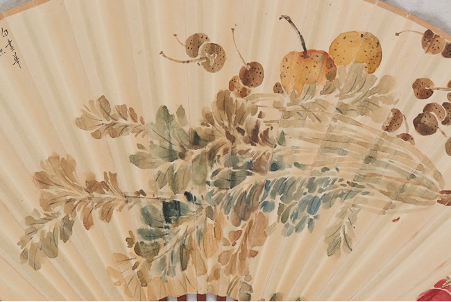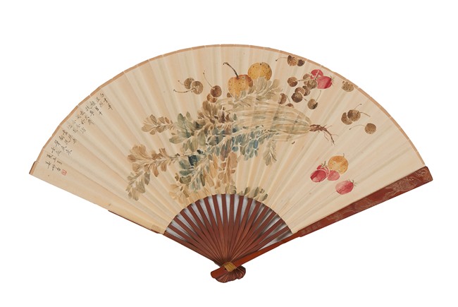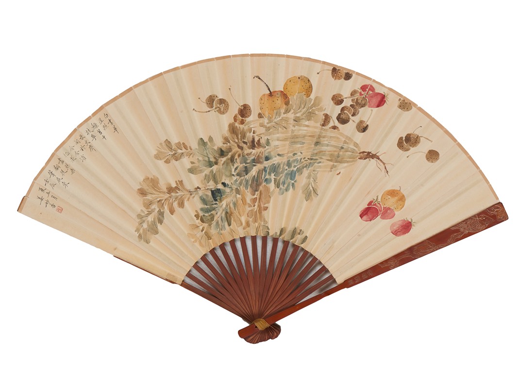 Color and ink on paper. Fruits and vegetable. Folded Fan painting. Inscribed and signed Jiang Miaoxiang, with two seals of the artist.