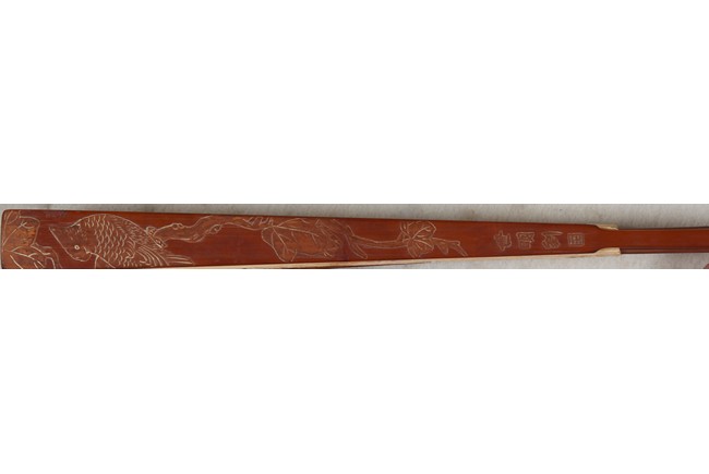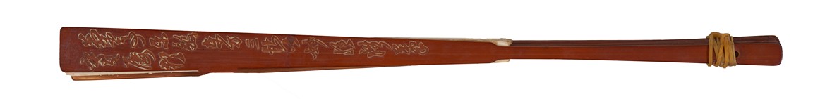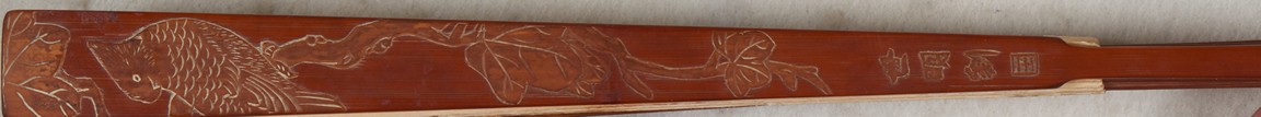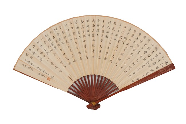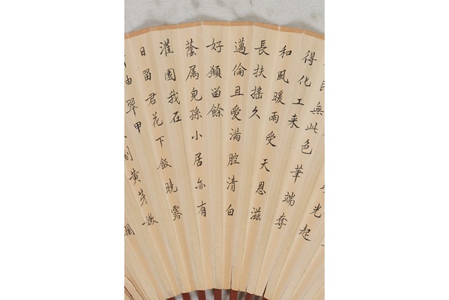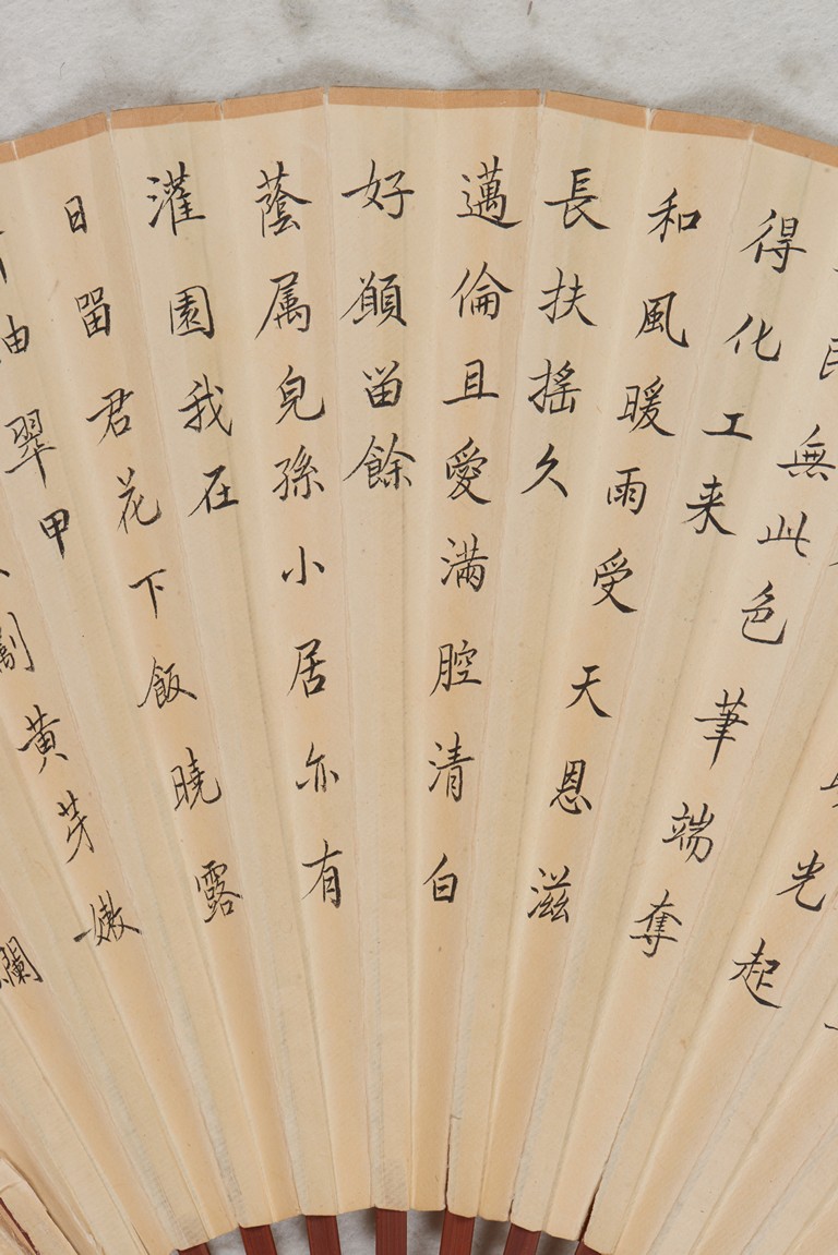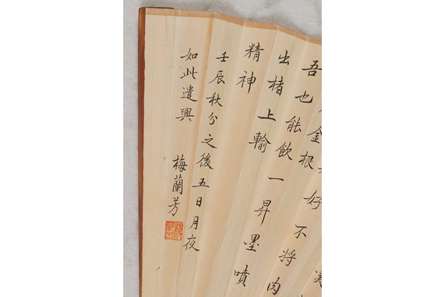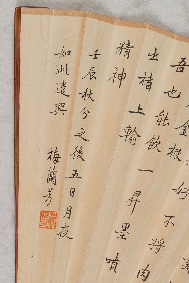 Color and ink on paper. Fruits and vegetable. Folded Fan painting. Inscribed and signed Jiang Miaoxiang, with two seals of the artist.