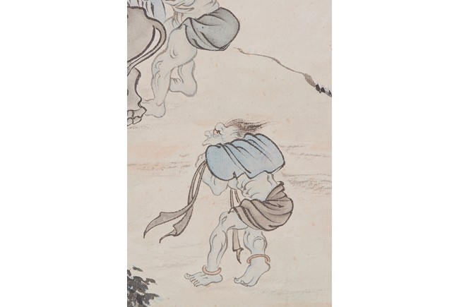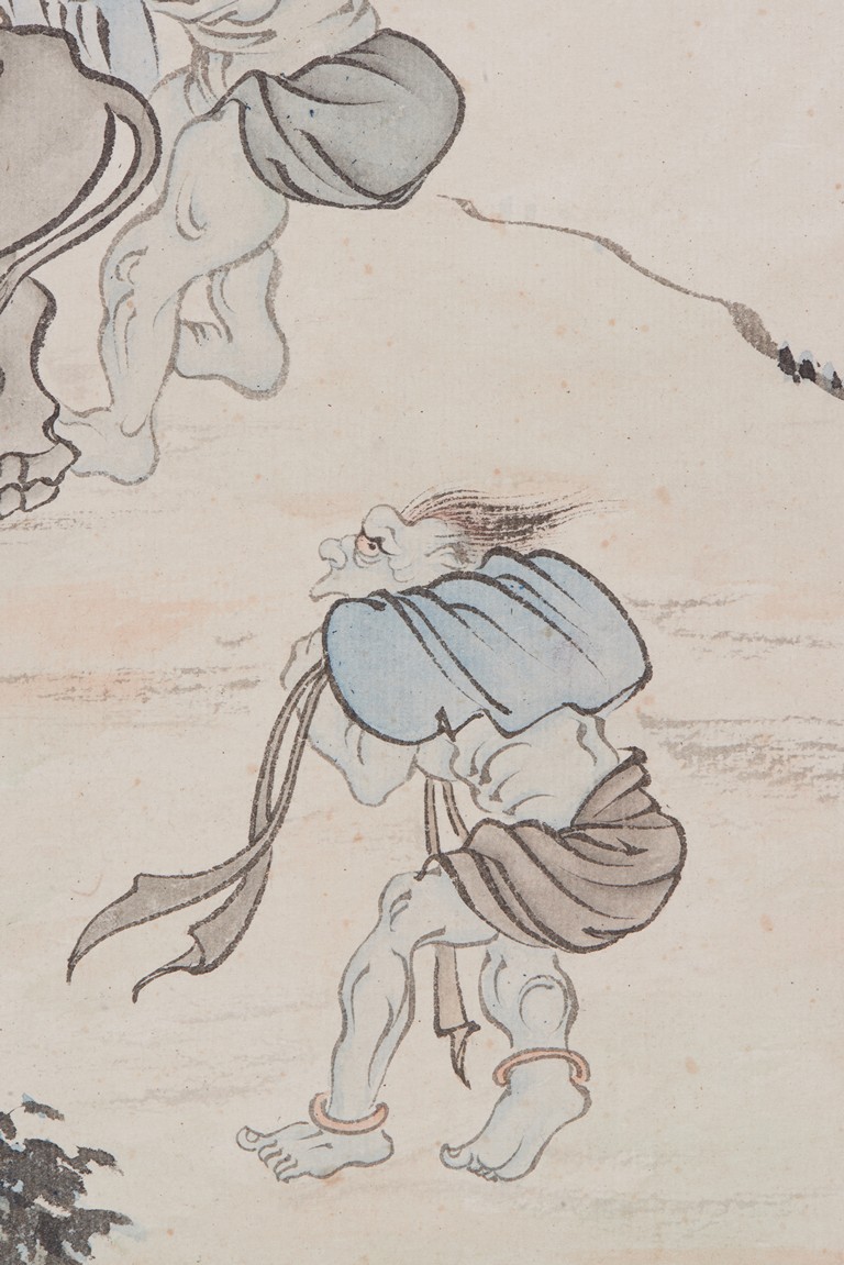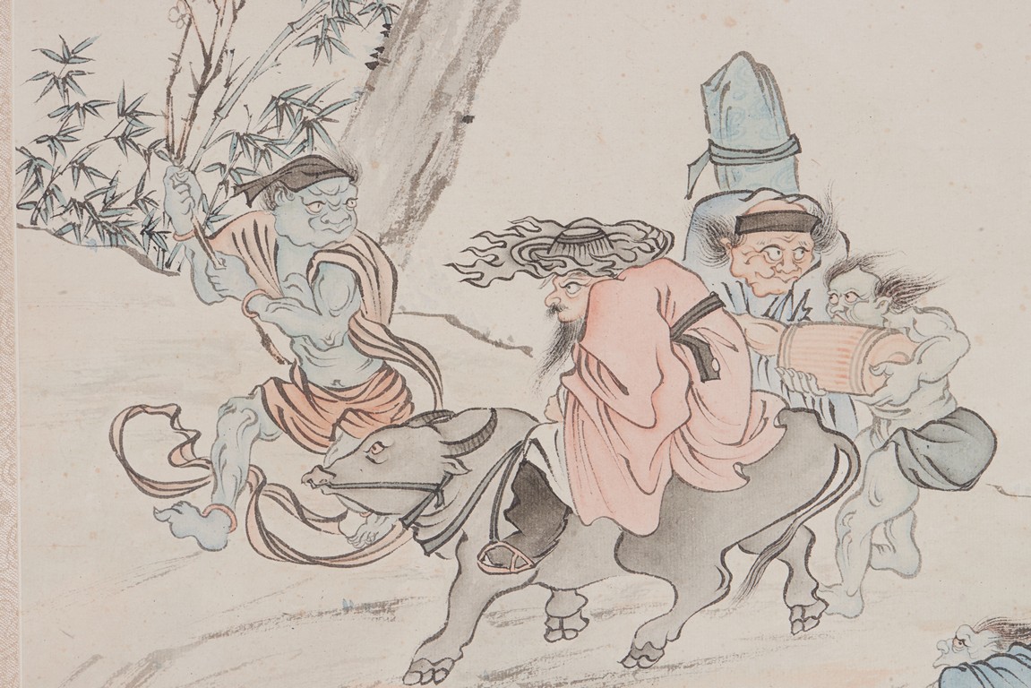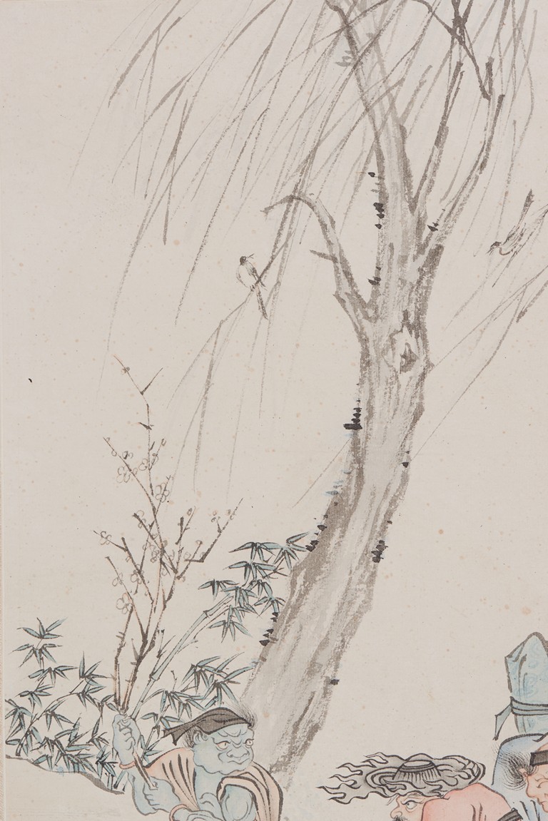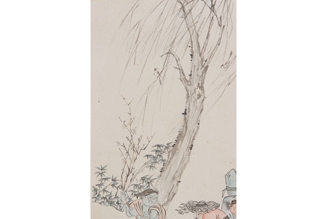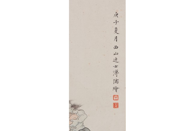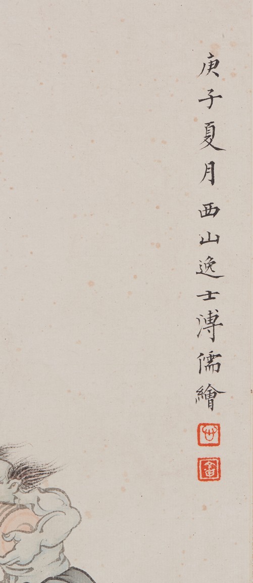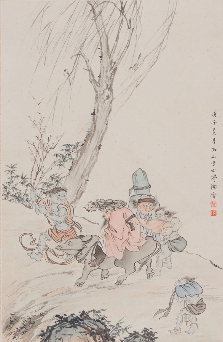 Color and ink on paper. Figures. Hanging scroll. Inscribed and signed Pu Ru, with two seals of the artist.