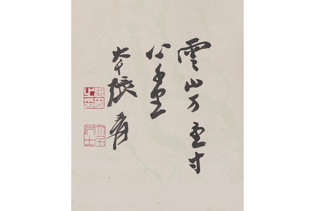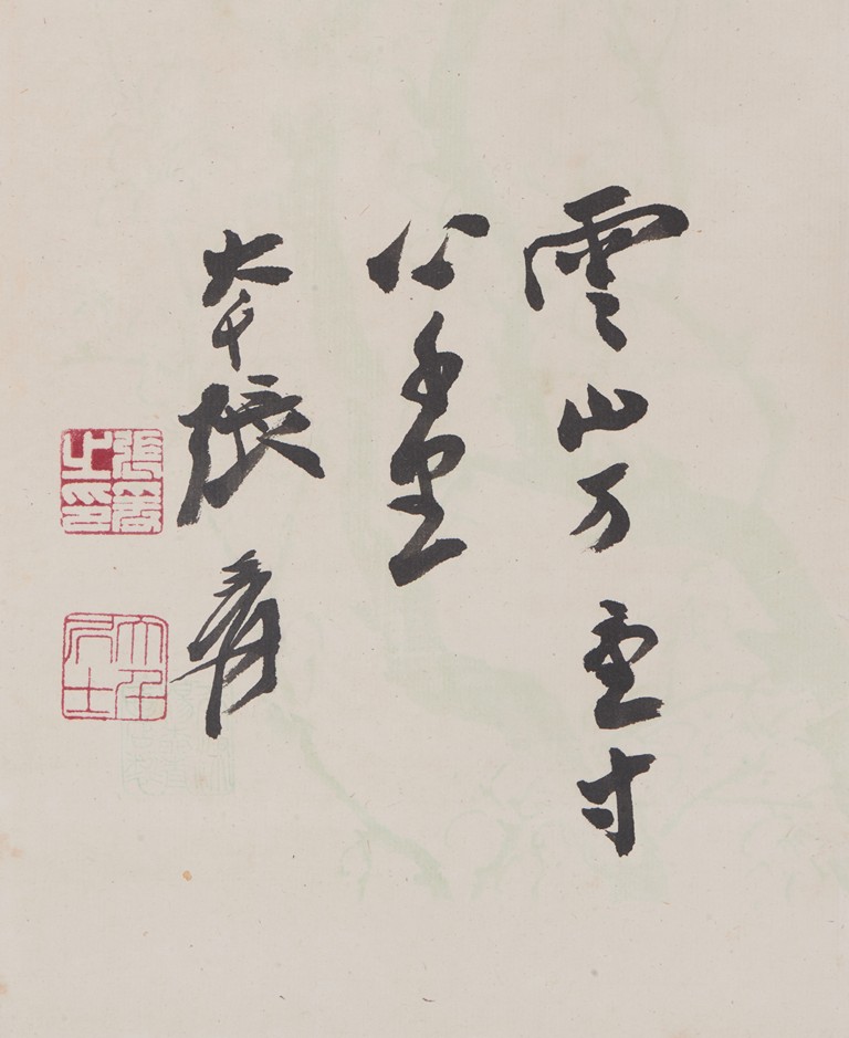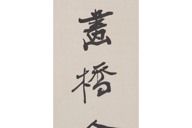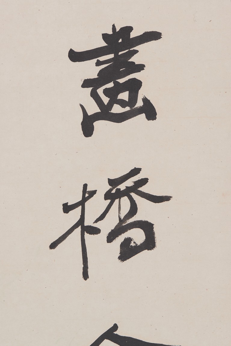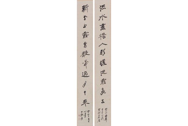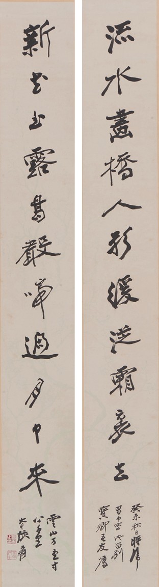 Ink on paper. Eleven-character calligraphy couplet. Inscribed and signed, with two seals of the artist.