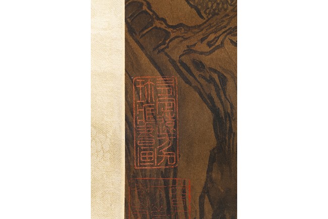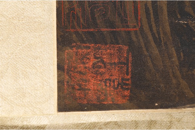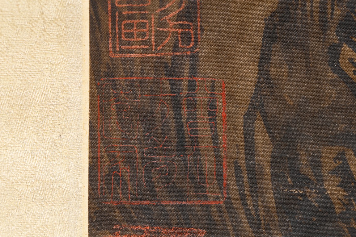 Color and ink on silk. Landscape. Hanging scroll. with four seals of the artist.