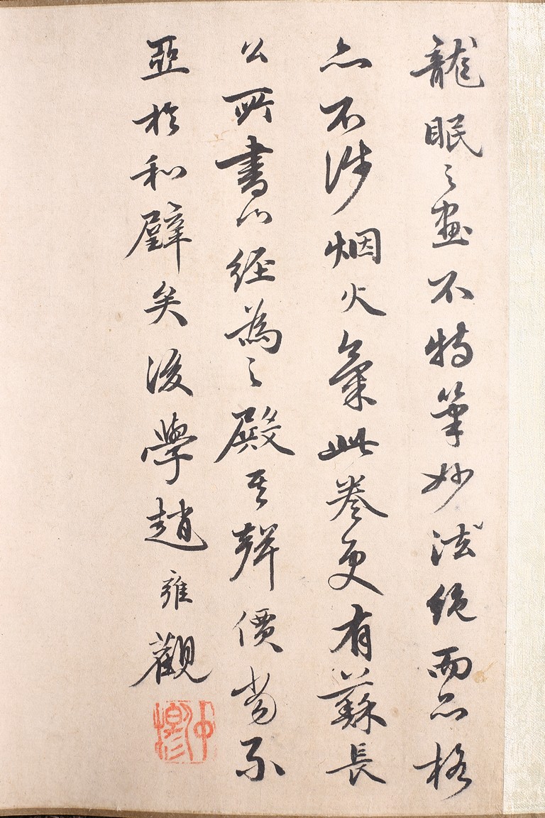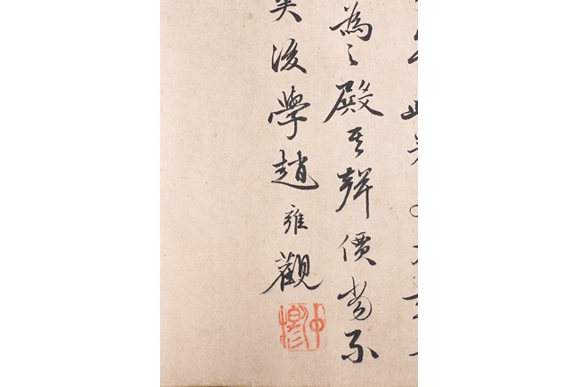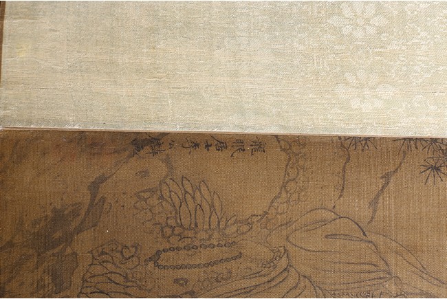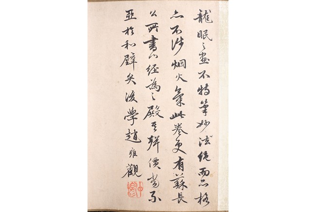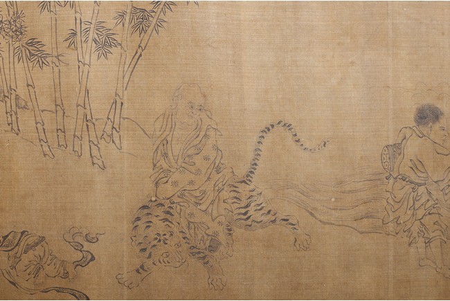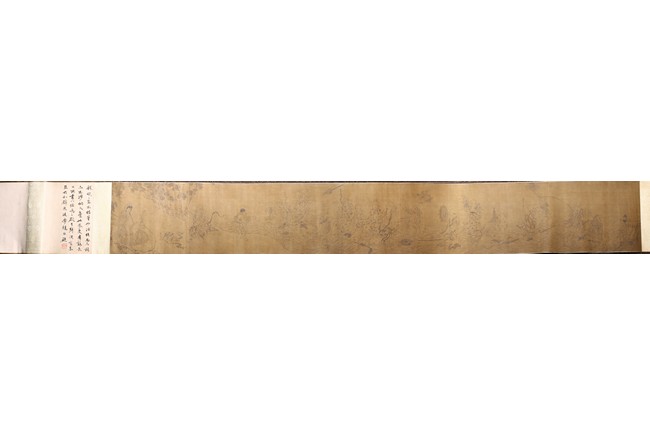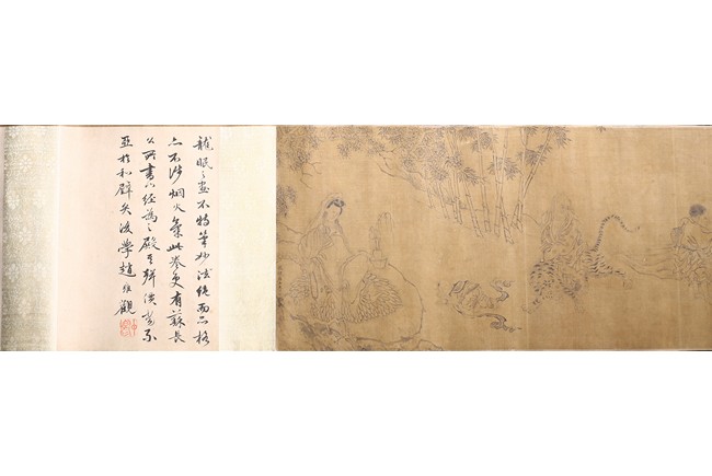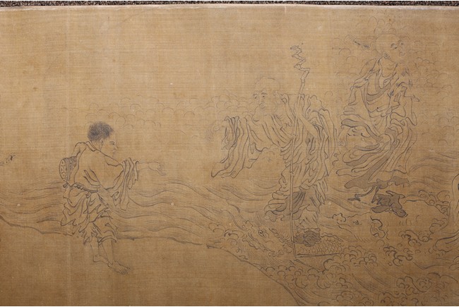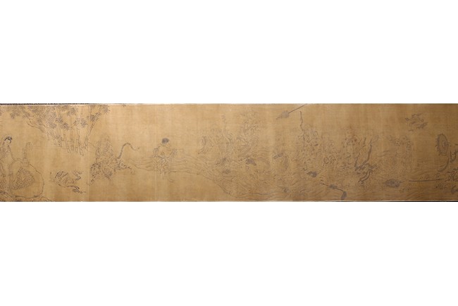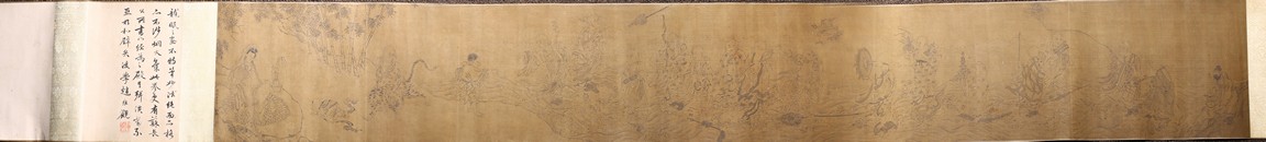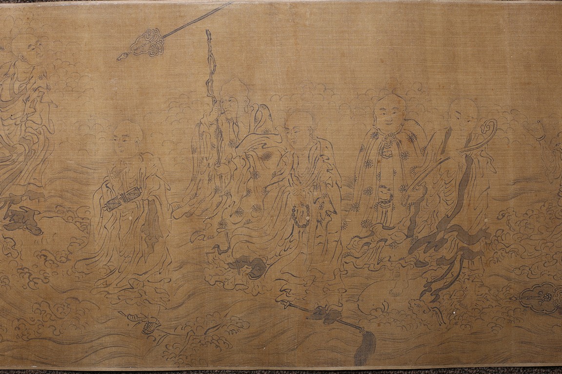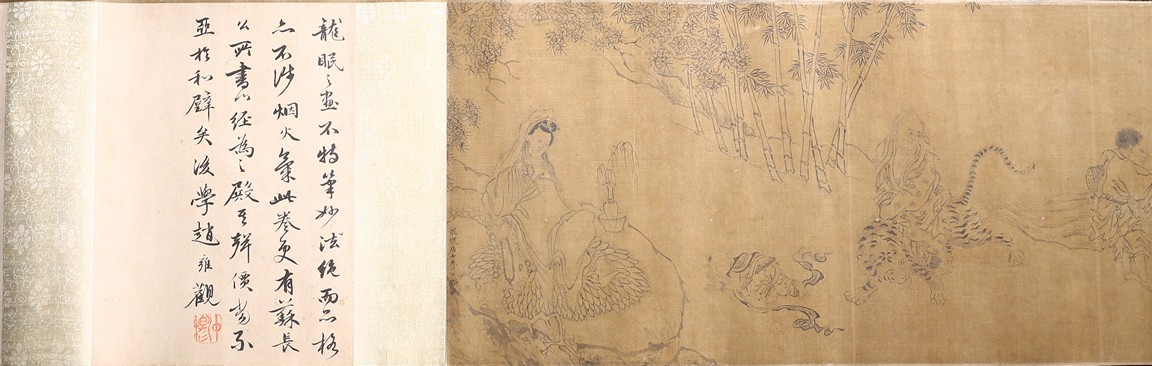 Color and ink on silk. Arhats crossing sea. Handscroll. Inscribed and signed Li Gonglin, with two seals of the artist. Colophon signed Zhao Yongguan with one seal of the artist. Attributed to Li Gonglin.