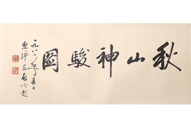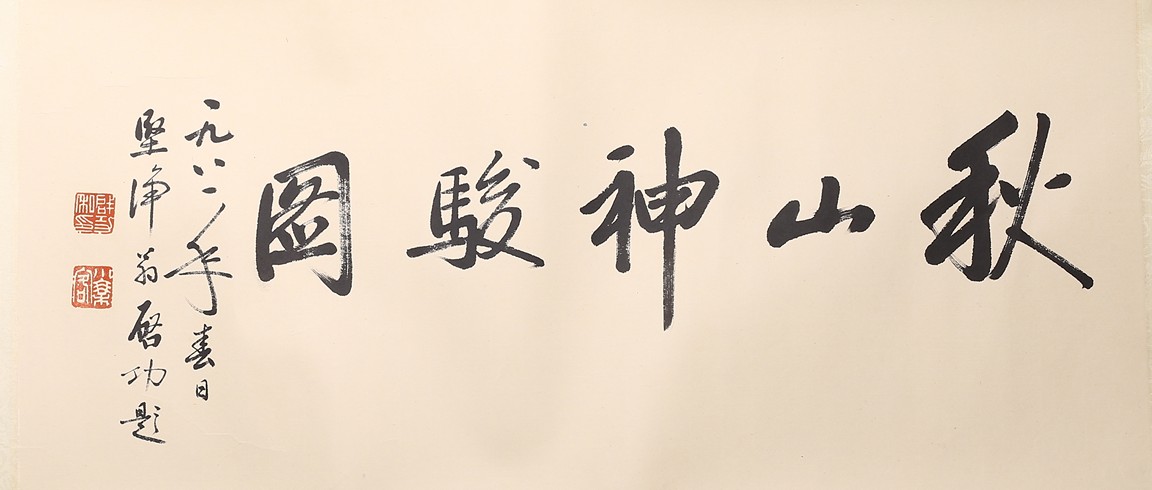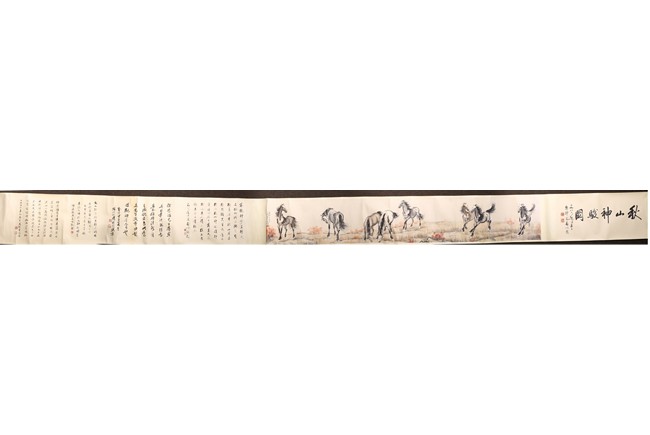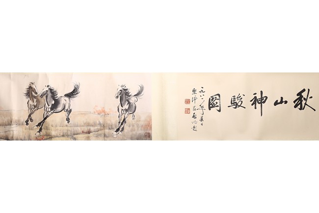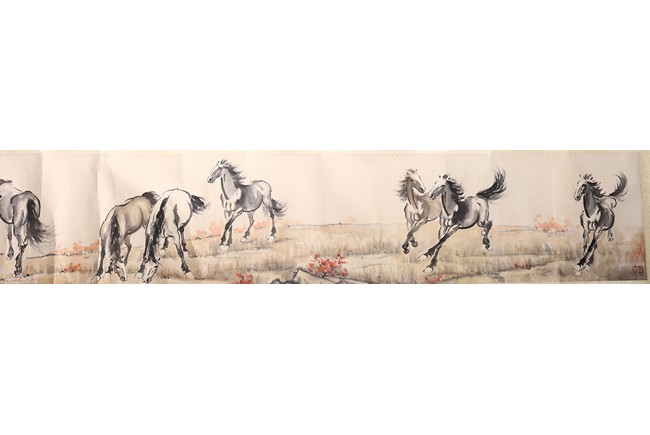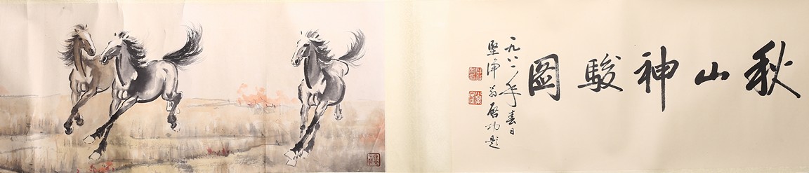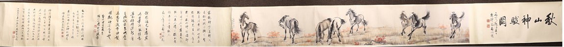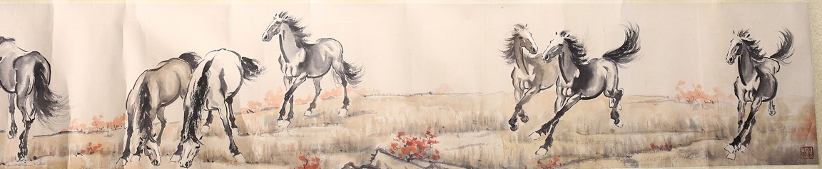 Color and ink on paper. Eight horses.Handscroll. Painting inscribed and signed Bei Hong, with two seals of the artist. Titleslip by Qi Gong and with two seals of his, frontispiece by Qi Gong and with two seals of his. Colophon by various scholars including Shi Shuqing, Qi Gong, Yang Renkai. Accompanied with a rosewood box with inscription identital to titleslip by Qi Gong. Also accompanied with signed Certificate from Xu Beihong Memorial Museum and one photo taken with Ms. Liao Jingwen, wife of Xu Beihong.